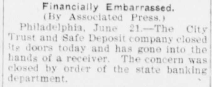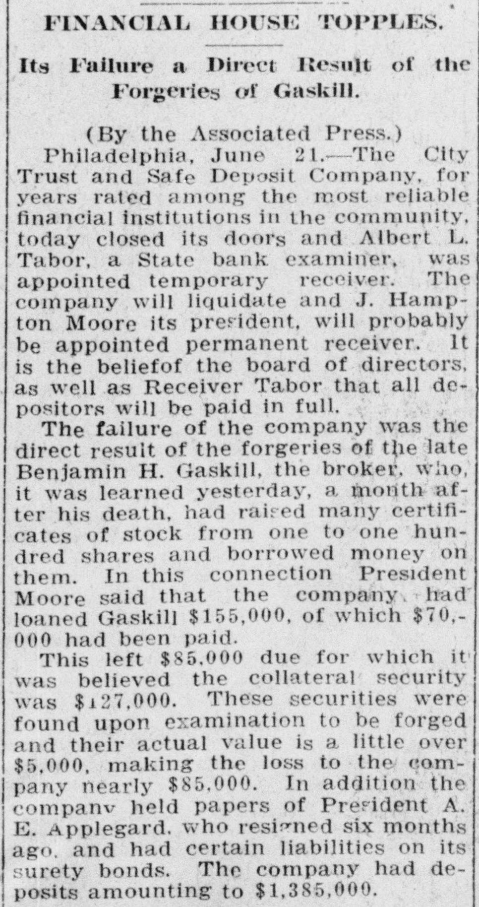 FINANCIAL HOUSE TOPPLES. Its Failure a Direct Result of the Forgeries of Gaskill. (By the Associated Press.) Philadelphia, June 21.-The City Trust and Safe Deposit Company, for years rated among the most reliable financial institutions in the community, today closed its doors and Albert L. Tabor, a State bank examiner, was appointed temporary receiver. The company will liquidate and J. Hampton Moore its president, will probably be appointed permanent receiver. It is the beliefof the board of directors, as well as Receiver Tabor that all depositors will be paid in full. The failure of the company was the direct result of the forgeries of the late Benjamin H. Gaskill, the broker. who, it was learned yesterday, a month after his death, had raised many certificates of stock from one to one hundred shares and borrowed money on them. In this connection President Moore said that the company T had loaned Gaskill $155,000, of which $70,000 had been paid. This left $85,000 due for which it was believed the collateral security was $127,000. These securities were found upon examination to be forged and their actual value is a little over $5,000, making the loss to the company nearly $85,000. In addition the company held papers of President A. E. Applegard. who resigned six months ago, and had certain liabilities on its surety bonds. The company had deposits amounting to $1,385,000.