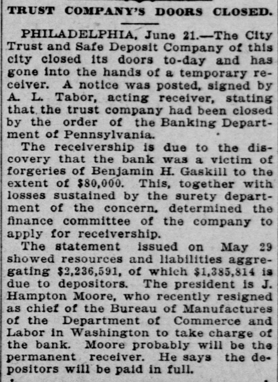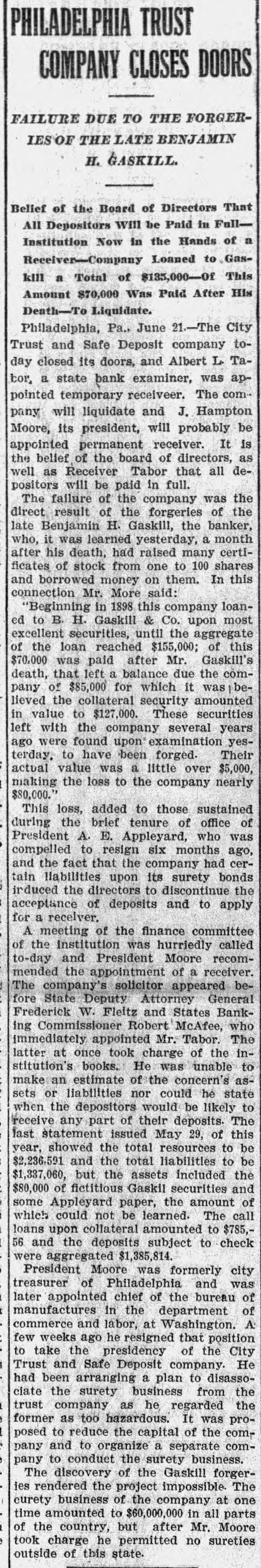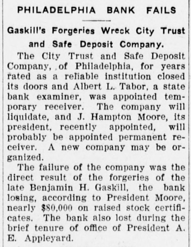 PHILADELPHIA BANK FAILS Gaskill's Forgeries Wreck City Trust and Safe Deposit Company. The City Trust and Safe Deposit Company, of Philadelphia, for years rated as a reliable institution closed its doors and Albert L. Tabor, a state bank examiner, was appointed temporary receiver. The company will liquidate, and J. Hampton Moore, its president, recently appointed, will probably be appointed permanent receiver. A new company may be organized. The failure of the company was the direct result of the forgeries of the late Benjamin H. Gaskill, the bank losing, according to President Moore, nearly $80,000 on raised stock certificates. The bank also lost during the brief tenure of office of President A. E. Appleyard.