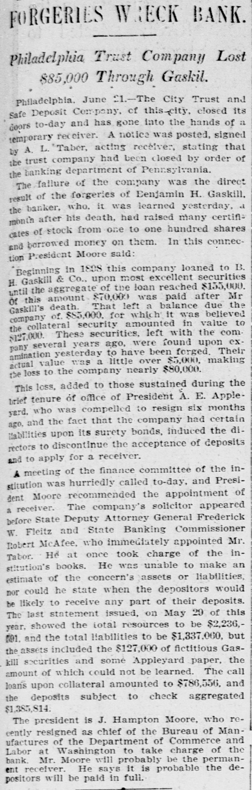 CAUSED BIG FAILURE COMPEL GASKILL'S FORGERIES CLOSING OF DOORS. City Trust and Safe Deposit Company of Philadelphia is in the Hands of State Bank Examiner. Philadelphia, June 21-The City Trust and Safe Deposit Company. for years rated among the most reliable financial institutions in the community, today closed its doors, and Albert L. Tabor a State bank examiner, was appointed temporary receiver. The company will liquidate and J. Hampton Moore. its President, will probably be appointed permanent receiver. It is the belief of the Board of Directors as well as Receiver Tabor that all depositors will be paid in full. This, however, will be determined by the permanent receiver. It is believed a new company will be organzed. The failure of the company was the direct issue of the forgeries of the late Benjamin H. Gaskill, the banker who died a month ago and who it was learned yesterday. had raised many certificates of stock from one to 100 shares and borrowed money on them. In this connection President Moore said: "Beginning in 1898, this company loaned to B. H. Gaskill & Co., upon most excellent securities. until the aggregate of the loan reached $155,000; of this amount $70,000 was paid after Mr. Gaskil's death. That left a balance due the company of $85,000, for which it was believed the collateral securities, amounting to value to $127,000. were good. These securities, left with the company several years ago, were found upon examination yesterday to have been forged. Their actual value was a little over $50,000, making the loss to the company nearly $80,000." This loss added to those sustained during the brief tenure of office of President A. E. Appleyard, who was compelled to resign six months ago, and the fact that the company had certain liabilities upon its surety bonds. induced the directors to discontinue the acceptance of deposits and to apply for a receiver. Mr. Tabor took charge of the institution's books today. He was unable to make an estimate of the concern's assets or liabilities, nor could he say when the depositors would be likely to receive any part of their deposits. The last statement issued, May 29, of this year showed the total resources to be $2,236,691, and of the total liabilities to be $1,337,060, but the assets included the $80,000 of fictitious Gaskill securities and some Appleyard paper, the amount of which could not be learned. The call loans upon collateral amounted to $786,556 and the deposits subject to check were aggregated to $1,385,814. President Moore was formerly city treasurer of Philadelphia and was later chief of the Bureau of Manufactures in the Department of Commerce and Labor at Washington. A few weeks ago he resigned that position to take the Presidency of the City Trust and Safe Deposit Company. He had been arranging a plan to disassociate the surety business from the trust company, as he regarded the former as too hazardous. It was proposed to reduce the capital of the company and to organize a separate company to conduct the surety business. The discovery of the Gaskill forgeries rendered the project impossible. The surety business of the company at one time amounted to $60,000,000 in all parts of the country, but after Mr. Moore took charge he permitted no sureties outside of this State. The actual value of the Gaskill sureties now in the possession of the company is but $1,775.