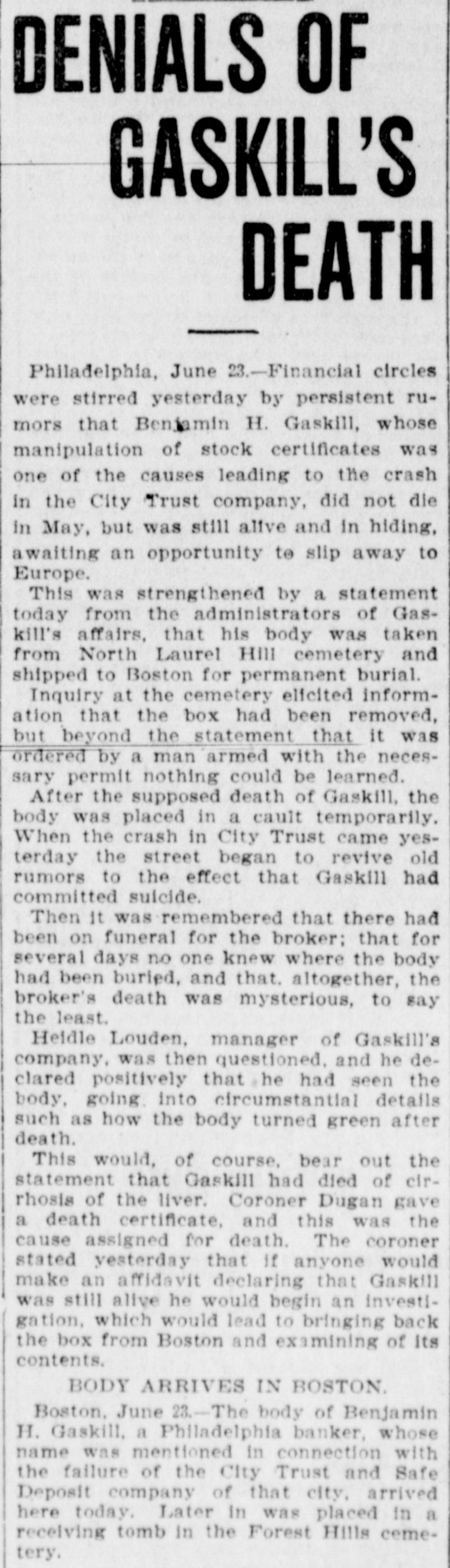 DENIALS OF GASKILL'S DEATH Philadelphia, June 23.-Financial circles were stirred yesterday by persistent rumors that Benjamin H. Gaskill, whose manipulation of stock certificates was one of the causes leading to the crash in the City Trust company, did not die in May, but was still alive and in hiding, awaiting an opportunity to slip away to Europe. This was strengthened by a statement today from the administrators of Gaskill's affairs, that his body was taken from North Laurel Hill cemetery and shipped to Boston for permanent burial. Inquiry at the cemetery elicited information that the box had been removed, but beyond the statement that it was ordered by a man armed with the necessary permit nothing could be learned. After the supposed death of Gaskill, the body was placed in a cault temporarily. When the crash in City Trust came yesterday the street began to revive old rumors to the effect that Gaskill had committed suicide. Then it was remembered that there had been on funeral for the broker; that for several days no one knew where the body had been buried, and that. altogether, the broker's death was mysterious, to say the least. Heidle Louden, manager of Gaskill's company, was then questioned. and he declared positively that he had seen the body, going. into circumstantial details such as how the body turned green after death. This would, of course, bear out the statement that Gaskill had died of cirrhosis of the liver. Coroner Dugan gave a death certificate, and this was the cause assigned for death. The coroner stated yesterday that if anyone would make an affidavit declaring that Gaskill was still alive he would begin an investigation, which would lead to bringing back the box from Boston and examining of its contents. BODY ARRIVES IN BOSTON. Boston, June 23.-The body of Benjamin H. Gaskill, a Philadelphia banker, whose name was mentioned in connection with the failure of the City Trust and Safe Deposit company of that city, arrived here today. Later in was placed in a receiving tomb in the Forest Hills cemetery.
