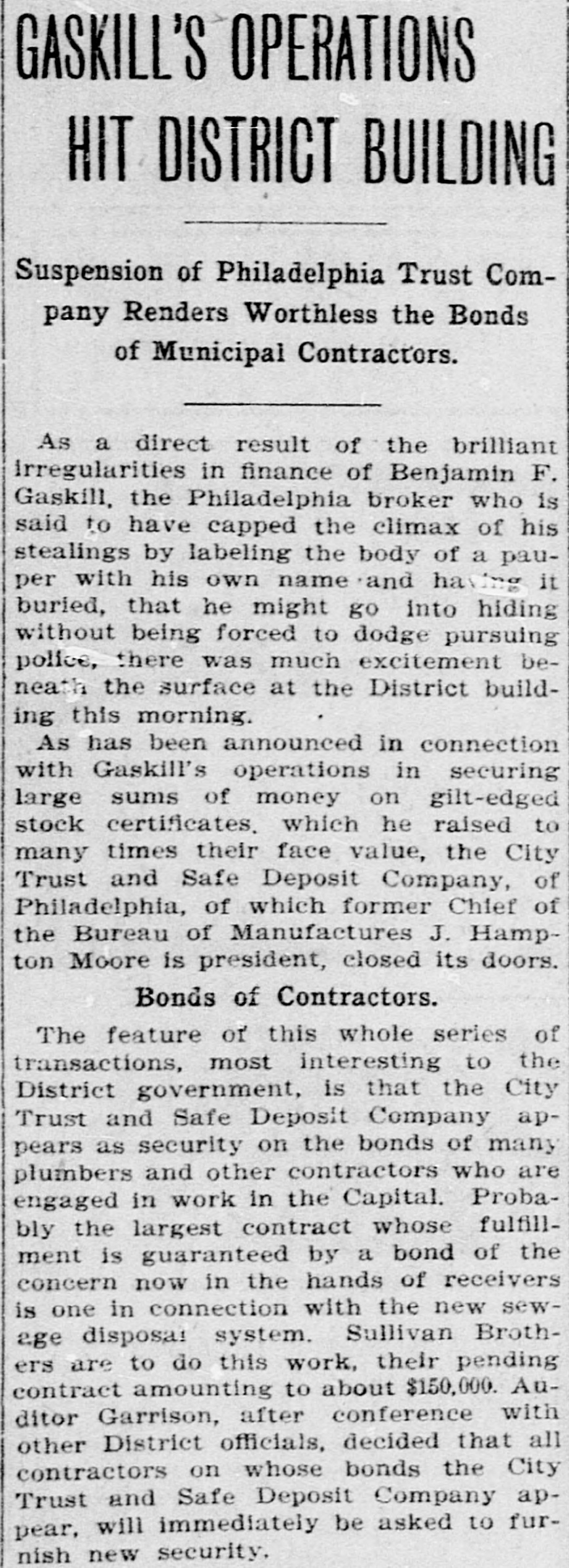 GASKILL'S OPERATIONS HIT DISTRICT BUILDING Suspension of Philadelphia Trust Company Renders Worthless the Bonds of Municipal Contractors. As a direct result of the brilliant irregularities in finance of Benjamin F. Gaskill, the Philadelphia broker who is said to have capped the climax of his stealings by labeling the body of a pauper with his own name and having it buried, that he might go into hiding without being forced to dodge pursuing police, there was much excitement beneath the surface at the District building this morning. As has been announced in connection with Gaskill's operations in securing large sums of money on gilt-edged stock certificates. which he raised to many times their face value, the City Trust and Safe Deposit Company, of Philadelphia, of which former Chief of the Bureau of Manufactures J. Hampton Moore is president, closed its doors. Bonds of Contractors. The feature of this whole series of transactions, most interesting to the District government, is that the City Trust and Safe Deposit Company appears as security on the bonds of many plumbers and other contractors who are engaged in work in the Capital. Probably the largest contract whose fulfillment is guaranteed by a bond of the concern now in the hands of receivers is one in connection with the new sewage disposal system. Sullivan Brothers are to do this work, their pending contract amounting to about $150,000. Auditor Garrison, after conference with other District officials, decided that all contractors on whose bonds the City Trust and Safe Deposit Company appear, will immediately be asked to furnish new security.