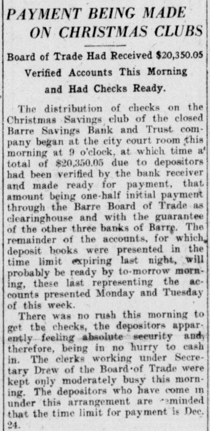 TALK OF THE TOWN Presbyterianş! Let's "go over the tope"-adv. A nice collection of Wallace Nutting pictures at Bell & Houston's.-adv. Extra fancy oranges at especially low prices at Marchetti's Fruit Store. -adv. Have you seen the great variety of home-made gift articles at the woman's exchange, 24 Elm street?-adv. The new Reo six touring car and the Reo truck are on display at the Palace garage, 308 North Main street.--adv 1921 calendars with beautifully hand painted scenes of Vermont on sale at Cummings and Lewis' for 65e and 75c. -adv. Dance, Montpelier armory, every Saturday night. Carroll's orchestra. Special car to Barre after the dance.adv. Mrs. Katherine Lawliss and daughter, Clara, left last night for Holyoke, Mass., where they will spend the holidays. Maccabees, attention! Pratice meeting of officers and guards for installation Monday evening at 7 o'elock sharp. Don't forget, music rolls, bags, cases, violins, bows, ukeleles and mandolins for Christmas at Bailey's Music Rooms. --adv. Clarence Rogers, a sophomore at Middlebury college, is passing the Christmas vacation with his parents, Mr. and Mrs. Frank G. Rogers, of 18 Richardson street. Vermont is second to no other state in natural scenery and color values and that is just what we are showing you in sepia prints at Cummings and Lewis' at the low price of $1.-adv. The five eighth grades of the Spaulding school collected the sum of $42.34 to send to the starving children of Europe, instead of having the usual Christmas celebrations in their rooms. Store will be open every evening till Christmas. A new assortment of Goddard and Spaulding rings just received. Special price on diamonds mounted on green gold with platinum head and otherwise. F. E. Burr. Salvation Army-Sunday services— Holiness 9:45 a. m. Sunday school at 10:30 a. m. Prayer and praise at 3 p. m. Y. P. Legion, 6 p. m. Power house, 6:45 p. m. Salvation service, 8 p. m. Other services Tuesdays, Thursdays and Saturdays. All welcome. The retail stores, members of the Barre Retall Merchants' association, Inc., will observe the following closing hours Christmas week: Monday and Tuesday at 5:30 p. m., as usual; Wednesday and Thursday at 9 p. m.; Friday at 10 p. m.; closed Saturday. Christmas day. E. M. Lyon, Pres., Frank W. Jackson, sec'y. Notice: The Quarry Savings Bank & Trust Co. will be pleased to assist depositors of the Barre Savings Bank & Trust Co. in proving their claims against that institution. May we suggest that books be left with us to be presented to the receiver for proof? This will facilitate the work and relieve creditors of the necessity of their personal attention.-adv. Just returned from New York and Boston with a stock of dry goods to sell at the new low prices: Percales, light and dark, 36 inches wide, 25c; outing flannel, 36 inches wide, 25c; bleached cotton, 36 inches wide, 19c; unbleached cotton, 40 inches wide, 21c; bleached sheets, 82x90, each $1.75. Call and see our stock and prices. Barre Dry Goods Store, 343 North Main street. adv. Depositors of the closed Barre Savings Bank and Trust company who have left their pass books with the People's National bank are requested, if convenient, to come to the People's National bank and sign proof of claim as the books have been verified and now await signature of owners. If you have not already sent in your pass books, please do so at once and we will attend to all matters in connection with the filing of your claim.