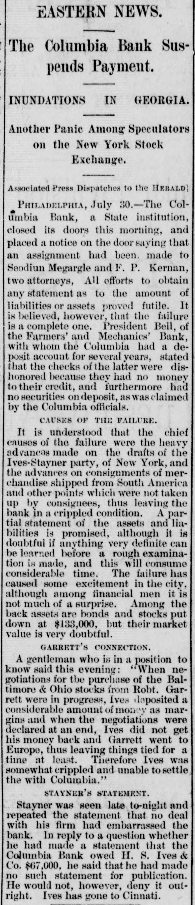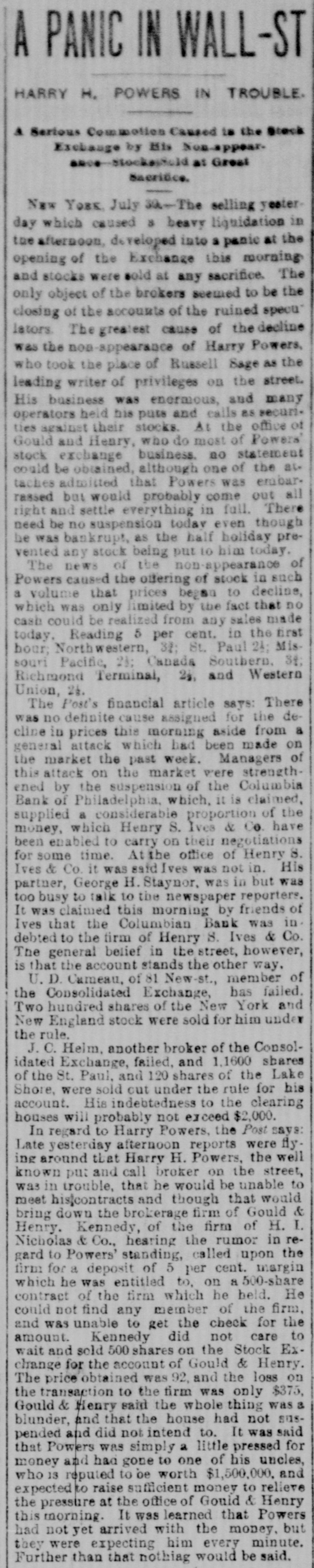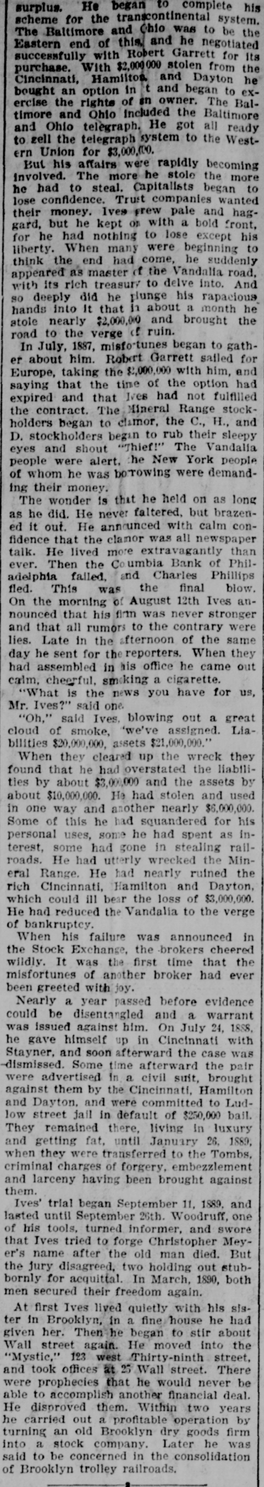 surplus. He began to complete his scheme for the transcontinental system. The Baltimore and Ohio was to be the Eastern end of this, and he negotiated successfully with Robert Garrett for its purchase. With $2,000 000 stolen from the Cincinnati, Hamilton, and Dayton he bought an option in t and began to exercise the rights of in owner. The Baltimore and Ohio included the Baltimore and Ohio telegraph. He got all ready to gell the telegraph system to the WestUnion for $3,000,000. But his affairs were rapidly becoming Involved. The more he stole the more had to steal. Capitalists began to confidence. Trust companies wanted money. Ives grew pale and hagbut he kept or with a bold front, he had nothing to lose except his iberty. When many were beginning to think the end had come, he suddenly ippeared as master of the Vandalia road, with its rich treasury to delve into. And deeply did he plunge his rapacious ands into It that h about a month he nearly $2,000,000 and brought the oad to the verge of ruin. In July, 1887, misfo-tunes began to gathabout him. Robert Garrett salled for Europe, taking the $2,000,000 with him, and aying that the time of the option had xpired and that Ives had not fulfilled he contract. The Mineral Range stockolders began to clamor, the C., H., and stockholders begin to rub their sleepy and shout "Thief!" The Vandalia eople were alert, the New York people whom he was borowing were demandtheir money. The wonder is that he held on as long he did. He never faltered, but brazenit out. He announced with calm condence that the clamor was all newspaper He lived more extravagantly than Then the Coumbia Bank of Phildelphia failed, and Charles Phillips This was the final blow. the morning of August 12th Ives anounced that his firm was never stronger that all rumors to the contrary were Late in the afternoon of the same he sent for the reporters. When they assembled in his office he came out cheerful, smoking a cigarette. "What is the news you have for us, Ives?" said one. "Oh," said Ives, blowing out a great loud of smoke, 'we've assigned. Liallities $20,000,000, assets $21,000,000." When they cleared up the wreck they that he had overstated the liabiliby about $3,000,000 and the assets by $10,000,000. He had stolen and used one way and another nearly $6,000,000. of this he had squandered for his ersonal uses, some he had spent as insome had gone in stealing railHe had utterly wrecked the MinRange. He had nearly ruined the Cincinnati, Hamilton and Dayton, hich could ill bear the loss of $3,000,000. had reduced the Vandalia to the verge bankruptcy. When his failure was announced in Stock Exchange, the brokers cheered It was the first time that the isfortunes of another broker had ever greeted with joy. Nearly a year passed before evidence be disentangled and a warrant issued against him. On July 24, 1888, gave himself up in Cincinnati with tayner, and soon afterward the case was smissed. Some time afterward the pair advertised in a civil suit, brought gainst them by the Cincinnati, Hamilton Dayton, and were committed to Ludstreet jail in default of $250,000 bail. remained there, living in luxury getting fat, until January 26, 1889, they were transferred to the Tombs, iminal charges of forgery, embezzlement larceny having been brought against trial began September 11, 1889, and until September 26th. Woodruff, one his tools, turned informer, and swore Ives tried to forge Christopher Meyname after the old man died. But jury disagreed, two holding out stubfor acquittal. In March, 1890, both secured their freedom again. first Ives lived quietly with his sisin Brooklyn in a fine house he had