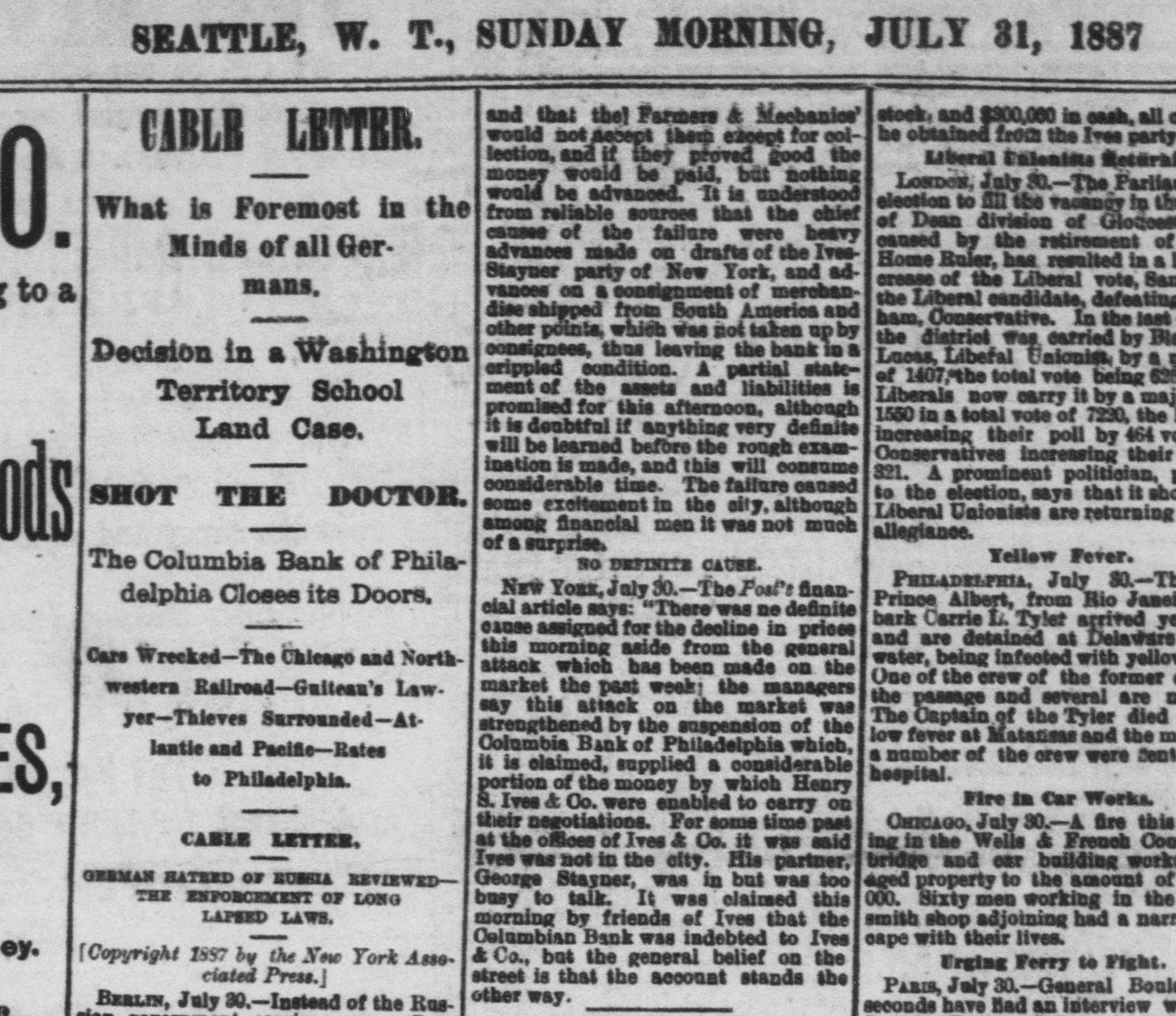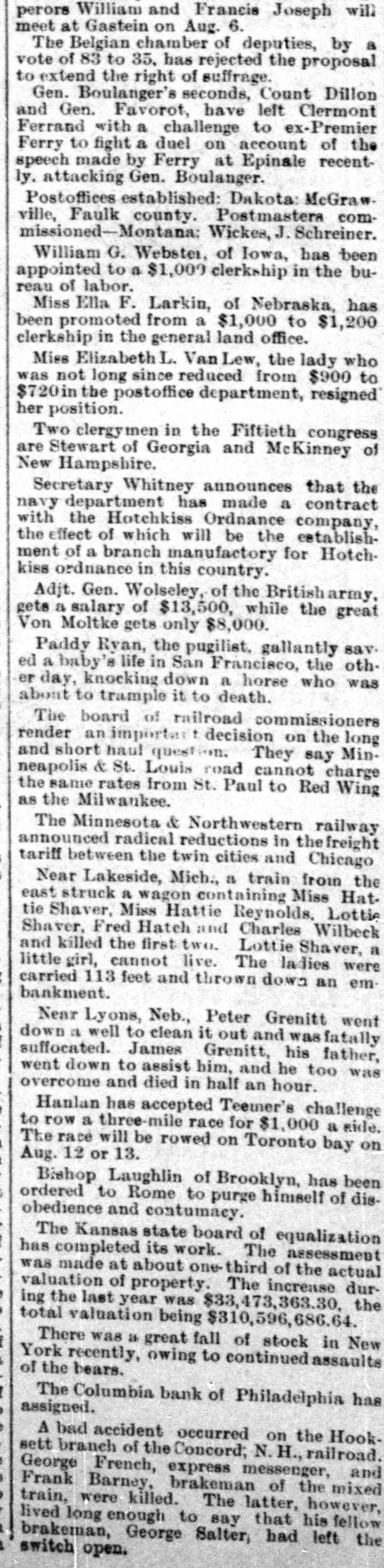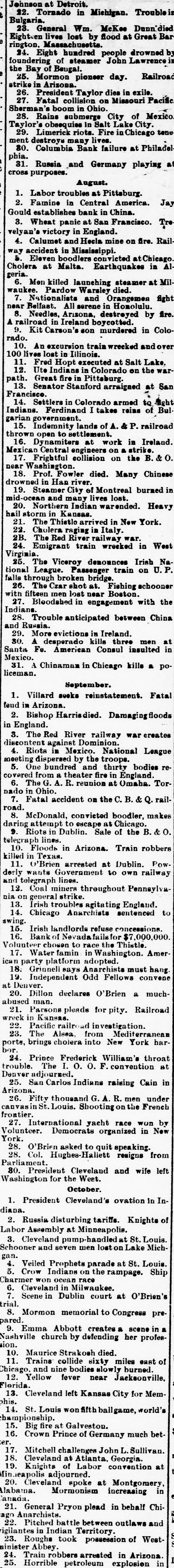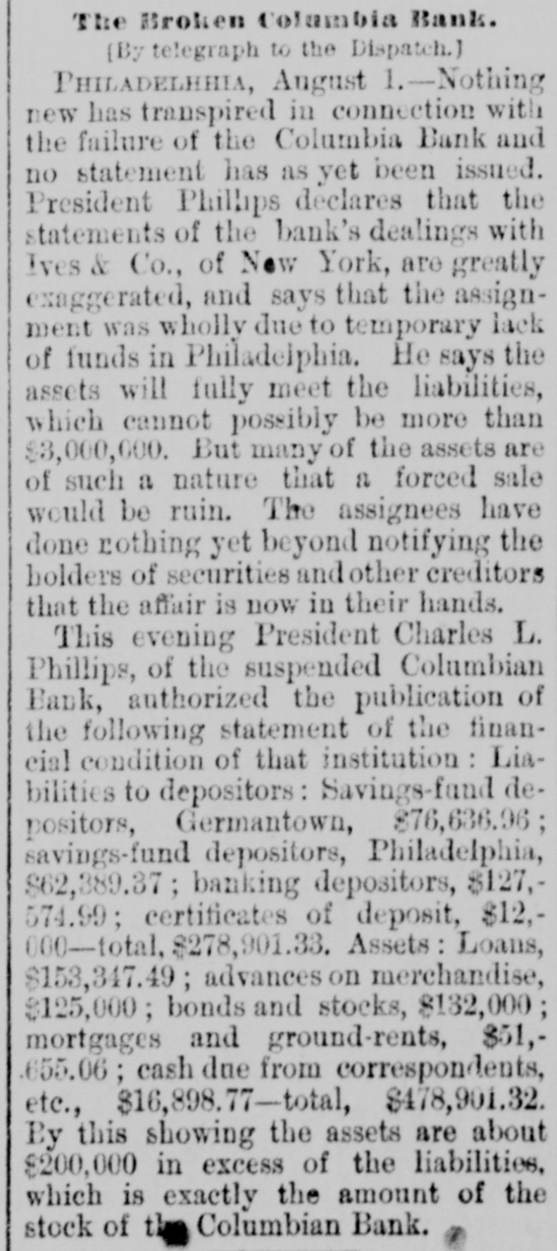 surplus. He began to complete his scheme for the transcontinental system. The Baltimore and Ohio was to be the Eastern end of this, and he negotiated successfully with Robert Garrett for its purchase. With $2,000 000 stolen from the Cincinnati, Hamilton, and Dayton he bought an option in t and began to exercise the rights of in owner. The Baltimore and Ohio included the Baltimore and Ohio telegraph. He got all ready to gell the telegraph system to the WestUnion for $3,000,000. But his affairs were rapidly becoming Involved. The more he stole the more had to steal. Capitalists began to confidence. Trust companies wanted money. Ives grew pale and hagbut he kept or with a bold front, he had nothing to lose except his iberty. When many were beginning to think the end had come, he suddenly ippeared as master of the Vandalia road, with its rich treasury to delve into. And deeply did he plunge his rapacious ands into It that h about a month he nearly $2,000,000 and brought the oad to the verge of ruin. In July, 1887, misfo-tunes began to gathabout him. Robert Garrett salled for Europe, taking the $2,000,000 with him, and aying that the time of the option had xpired and that Ives had not fulfilled he contract. The Mineral Range stockolders began to clamor, the C., H., and stockholders begin to rub their sleepy and shout "Thief!" The Vandalia eople were alert, the New York people whom he was borowing were demandtheir money. The wonder is that he held on as long he did. He never faltered, but brazenit out. He announced with calm condence that the clamor was all newspaper He lived more extravagantly than Then the Coumbia Bank of Phildelphia failed, and Charles Phillips This was the final blow. the morning of August 12th Ives anounced that his firm was never stronger that all rumors to the contrary were Late in the afternoon of the same he sent for the reporters. When they assembled in his office he came out cheerful, smoking a cigarette. "What is the news you have for us, Ives?" said one. "Oh," said Ives, blowing out a great loud of smoke, 'we've assigned. Liallities $20,000,000, assets $21,000,000." When they cleared up the wreck they that he had overstated the liabiliby about $3,000,000 and the assets by $10,000,000. He had stolen and used one way and another nearly $6,000,000. of this he had squandered for his ersonal uses, some he had spent as insome had gone in stealing railHe had utterly wrecked the MinRange. He had nearly ruined the Cincinnati, Hamilton and Dayton, hich could ill bear the loss of $3,000,000. had reduced the Vandalia to the verge bankruptcy. When his failure was announced in Stock Exchange, the brokers cheered It was the first time that the isfortunes of another broker had ever greeted with joy. Nearly a year passed before evidence be disentangled and a warrant issued against him. On July 24, 1888, gave himself up in Cincinnati with tayner, and soon afterward the case was smissed. Some time afterward the pair advertised in a civil suit, brought gainst them by the Cincinnati, Hamilton Dayton, and were committed to Ludstreet jail in default of $250,000 bail. remained there, living in luxury getting fat, until January 26, 1889, they were transferred to the Tombs, iminal charges of forgery, embezzlement larceny having been brought against trial began September 11, 1889, and until September 26th. Woodruff, one his tools, turned informer, and swore Ives tried to forge Christopher Meyname after the old man died. But jury disagreed, two holding out stubfor acquittal. In March, 1890, both secured their freedom again. first Ives lived quietly with his sisin Brooklyn in a fine house he had