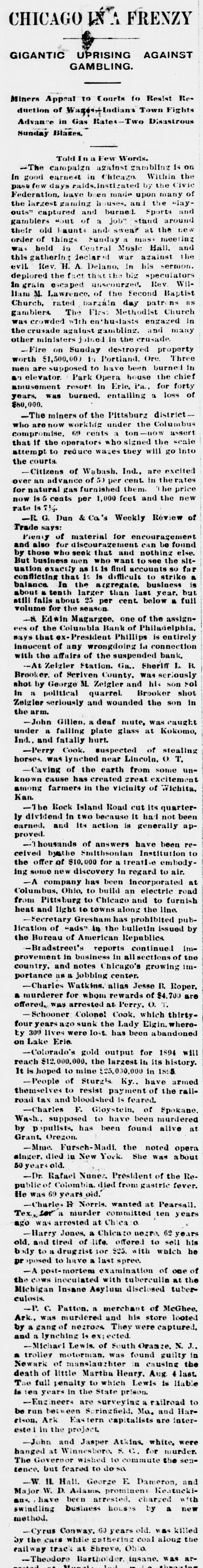 # CHICAGO IN A FRENZY # GIGANTIC UPRISING AGAINST GAMBLING. Miners Appeal to Courts to Resist Re-duction of Wagés Indians Town Fights Advance in Gas Rates-Two Disastrous Sunday Blazes, Told In a Few Words. -The campaign against gambling is on In good earnest in Chicago Within the past few days raids, instigated by the Civic Federation, have been made upon many of the largest gaming houses, and the "lay-outs" captured and burned. Sports and gamblers "out of a job" stand around their old haunts and swear at the new order of things. Sunday a mass meeting was held in Central Music Hall, and this gathering declared war azainst the evil Rev. H. A. Delano, in his sermon. deplored the fact that the big speculators in grain escaped unscourged. Rev. William M. Lawrence, of the Second Baptist Church, rated bargain day patrons as gamblers. The First Methodist Church was crowded with enthusiasts engaged in the crusade against gambling, and many other ministers joined in the crusade. -Fire on Sunday destroyed property worth $1,500,000 in Portland, Ore. Three men are supposed to have been burned in an elevator. Park Opera house the chief amusement resort in Erie, Pa, for forty years, was burned. entailing a loss of $60,000. -The miners of the Pittsburg district-who are now worklig under the Columbus compromise, 69 cents a ton-now assert that if the operators who signed the scale attempt to reduce wages they will go into the courts. -Citizens of Wabash, Ind., are excited over an advance of 50 per cent. in the rates for natural gas furnished them. The price now is 6 cents per 1,000 feet and the new rate is 7½. -R. G. Dun & Co's Weekly Review of Trade says: Pienty of material for encouragement and also for discouragement can be found by those who seek that and nothing else. But business men who want to see the situation exactly as it is find accounts so far conflicting that it is difficult to strike a balance. In the aggregate, business is about a tenth larger than last year, but still falis about 25 per cent. below a full volume for the season. -S. Edwin Magargee, one of the assign-ees of the Columbia Bank of Philadelphia, says that ex-President Phillips is entirely innocent of any wrongdoing la connection with the affairs of the suspended bank, --At Zeigler Station. Ga.. Sheriff L. B. Brooker. of Scriven County, was seriously shot by George M. Zeigler and his son sol in a political quarrel. Brooker shot Zeigler seriously and wounded the son in the arm. -John Gillen, a deaf mute, was caught under a falling plate glass at Kokomo, Ind., and fatally hurt. -Perry Cook, suspected of stealing horses. was lynched near Lincoln, O. T. -Caving of the earth from some unknown cause has created great excitement among farmers in the vicinity of Wichita, Kan -The Rock Island Road cut its quarterly dividend in two because it had not been earned, and its action is generally approved. -Thousands of answers have been re-ceived bythe Smithsonian Institution to the offer of $10,000 for a treatise embodying some new discovery in regard to air. -A company has been incorporated at Columbus, Ohio, to build an electric road from Pittsburg to Chicago and to furnish heat and light to towns along the line. -Secretary Gresham has prohibited publication of "ads" in the bulletin issued by the Bureau of American Republics. -Bradstreet's reports continued improvement in business in all sections of the country, and notes Chicago's growing importance as a jobbing center. -Charles Watkins, alias Jesse B. Roper, a murderer for whom rewards of $4.700 are offered, was arrested at Perry. O. T. -Schooner Colonel Cook, which thirty-four years ago sunk the Lady Elgin, whereby 300 lives were lost. has been abandoned on Lake Erie. -Colorado's gold output for 1894 will reach $12,000,000, the largest in its history. It is hoped to mine $25,000,000 in 1895. -People of Sturgis. Ky.. have armed themselves to resist payment of the railroad tax and bloodshed is feared. -Charles F. Gloystein, of Spokane, Wash., supposed to have been murdered by populists, has been found alive at Grant, Oregon. -Mme. Fursch-Madi, the noted opera singer, died in New York. She was about 50 years old. -Dr. Rafael Nunez, President of the Republic of Colombia, died from gastric fever. He was 69 years old. -Charles B Norris, wanted at Pearsall. Tex, for a murder committed ten years ago was arrested at Chicato -Harry Jones, a Chicago negro, 62 years old, and tired of life. offered to sell his body to a drugzist ior $25. with which he proposed to have a last spree. -A post-mortem examination of one of the cows inoculated with tuberculin at the Michigan Insane Asylum disclosed tuber-culosis. -P. C. Patton, a merchant of McGhee, Ark., was murdered and his store looted by a gang of negroes. They were captured, and a lynching is expected. --Michael Lewis, of South Orange, N. J.. a trolley motorman, was found guilty in Newark of manslaughter in causing the death of little Martha Henry. Aug. 4 last. The full penalty to which Lewis is liable is ten years in the State prison. -Engineers are surveying a railroad to be run between Springfield, Mo, and Harrison. Ark Eastern capitalists are inter-ested in the project, -John and Jasper Atkins, white, were hanged at Winnesboro, S. C. for murder. The Governor wished to commute the sentence, but feared to do so W. IH. Hall. George E. Dameron, and Major W. D. Adams, prominent Keatucki-ans, have been arrested, charged with swindling business houses by a new method. -Cyrus Conway, 60 years old. was killed by the cars while gathering coal along the eailway track at Shreve, Ohlo -Theodore Bartholder, insane, was ar-