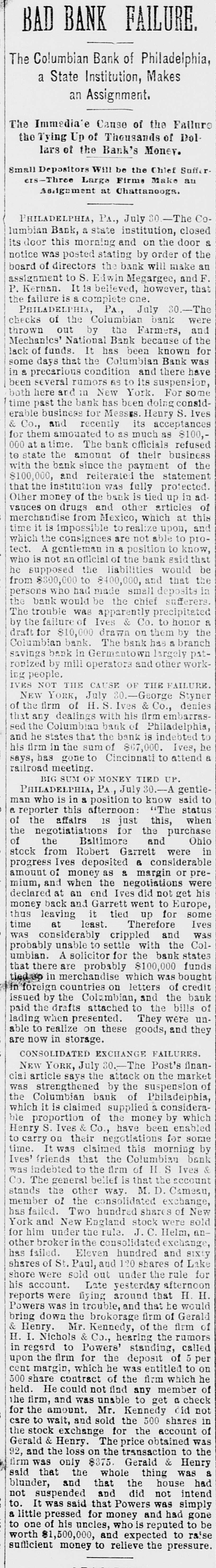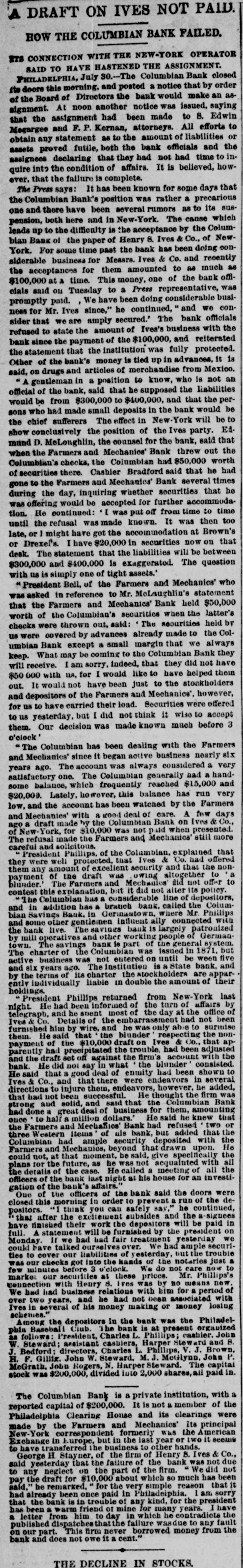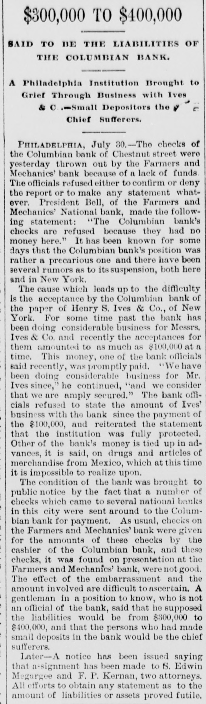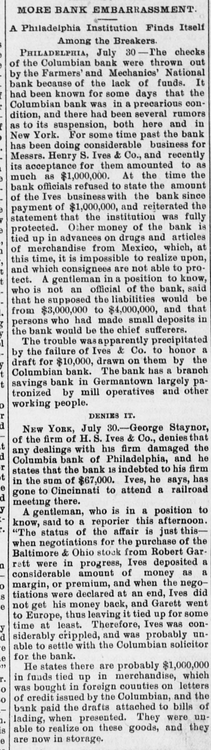 A DRAFT ON IVES NOT PAID. HOW THE COLUMBIAN BANK FAILED. HTS CONNECTION WITH THE NEW-YORK OPERATOR SAID TO HAVE HASTENED THE ASSIGNMENT. PHILADELPHIA, July 30.-The Columbian Bank closed its doors this merning, and posted a notice that by order of the Board of Directors the bank would make an assignment. At noon another notice was issued, saying that the assignment had been made to S. Edwin Megargee and F. P. Kernan, attorneys. All efforts to obtain any statement as to the amount of liabilities or the officials and bank the both futile, proved assignees declaring that they had not had time to inquire into the condition of affairs. It is believed, however. that the failure is complete. The Press says: It has been known for some days that the Columbian Bank's position was rather a precarious one and there have been several rumors as to its suspension, both here and in New-York. The cause which leads up to the difficulty is the acceptance by the Columbian Bank of the paper of Henry 8. Ives & Co., of NewYork. For some time past the bank has been doing considerable business for Messrs. Ives & Co. and recently the acceptances for them amounted to as much as $100,000 at time. This money, one of the bank officlais said on Tuesday to a Press representative, was promptly paid. We have been doing considerable business for Mr. Ives since," he continued, and we consider that we are amply secured.' The bank officials refused to state the amount of Ives's business with the bank since the payment of the $100,000, and reiterated the statement that the institution was fully protected. Other of the bank's money is tied up in advances, it 1s said, on drugs and articles of merchandise from Mexico. A gentleman in a position to know, who is not an official of the bank, said that he supposed the liabilities would be from $300,000 to $400,000, and that the persons who had made small deposits in the bank would be the chief sufferers The effect in York New-York will be to show conclusively the position of the Ives party. Ed. mund D. MeLonghlin, the counsel for the bank, said that when the Farmers and Mechanics' Bank threw out the Columbian's checks, the Columbian had $50,000 worth of securities there. Cashier Bradford said that he had gone to the Farmers and Mechanics' Bank several times during the day, inquiring whether securities that he was offering would be accepted for further accommodation. He continued: 'I was put off from time to time until the refusal was made known. It was then too late, or might have got the accommodation at Brown's or Drexel's. have $20,000 in securities now on that desk. The statement that the liabilities will be between $300,000 and $400,000 is exaggerated. The question with us is simply one of tight assets.' " President Bell, of the Farmers and Mechanics' who was asked in reference to Mr. McLaughlin's statement that the Farmers and Mechanics' Bank held $50,000 worth of the Columbian's securities when the latter's checks were thrown out, said: The securities held by us were covered by advances already made to the Columbian Bank except a small margin that we always keep. What may be coming to the Columbian Bank they will receive. am sorry, indeed, that they did not have $50 000 with na, for I would like to have helped them out. It would not have been just to the stockholders and depositors of the Farmers and Mechanics', however, for us to have carried their load. Securities were offered to us yesterday, but I did not think it wise to accept them. Our decision was made known much before 3 o'clock' Farmers the with been has dealing Columbian The and Mechanics' since it began active business nearly six years ago. The account was always considered a very satisfactory one. The Columbian generally had a handsome balance, which frequently reached $15,000 and $20,000. Lately, however, this balance has run very low, and the account has been watched by the Farmers and Mechanies' with a good deal of care. A few days ago a draft made by the Columbian Bank on Ives & Co., York, New-York, for $10,000 was not paid when presented. Mechanics' still more Farmers the made and refusal The solicitous. and careful President Phillips, of the Columbian, explained that they were well protected, that Ives had offered them any amount of excellent security and that the nonpayment of the draft was owing altogether to offer to not PIP Mechanics pur Farmers The blunder. contest this explanation, but it did not alter its policy. of line depositors, considerable has Columbian the and in addition has a branch bank, called the ColumMr. where Phillips Germantown, in Bank. bian Savings and some other gentlemen influent ally connected with the bank live. savings bank is largely patronized by mill operatives and other working people of Germanthe of general system. bank part The The savings town. but 1871, in Was issued Columbian the charter of The active business was not entered on until be ween five and six years ago. The institution is State bank, and by the terms of its charter the stockholders are apparently individually liable in double the amount of their holdings. President Phillips returned from New York last night. He had been informed of the turn of affairs by telegraph, and he spent most of the day at the office of Co. Details of the embarrassment had not been furnished him by wire, and he was only able to surmise them. He said He said that the blunder respecting the nonCo., draft that à on Ives the of $10,000 parently payment had precipitated the trouble, had been adjusted and the draft set off against the firm's account with the bank. He did not say in what the blunder consisted. said that a good deal of enmity had been shown to Ives & Co., and that there were endeavors in several directions to injure them, endeav however, he added, that had not been successful. He thought the firm was strong and solid, and said that the Columbian Bank had done great deal of business for them, amounting said knew that he He mil