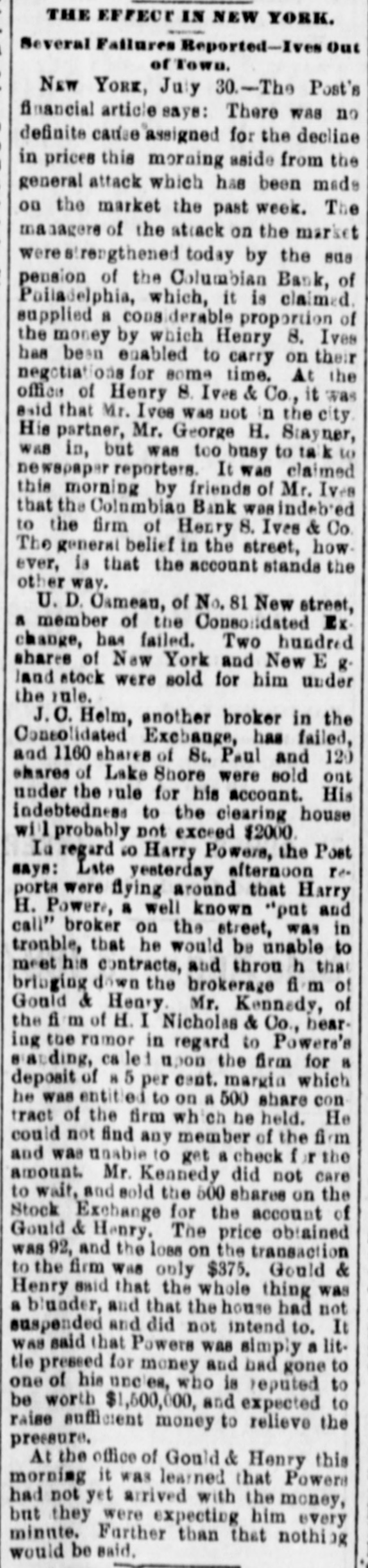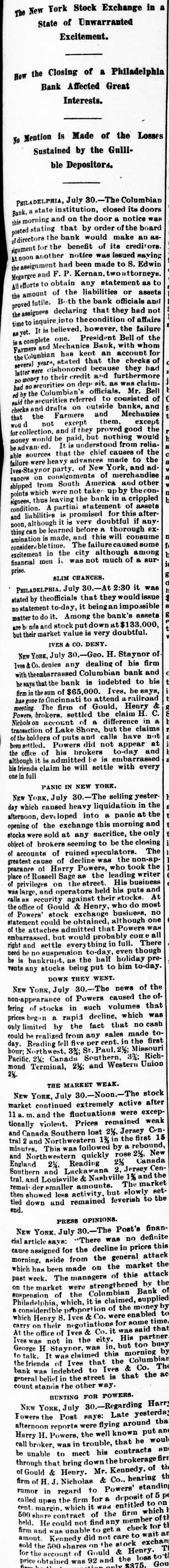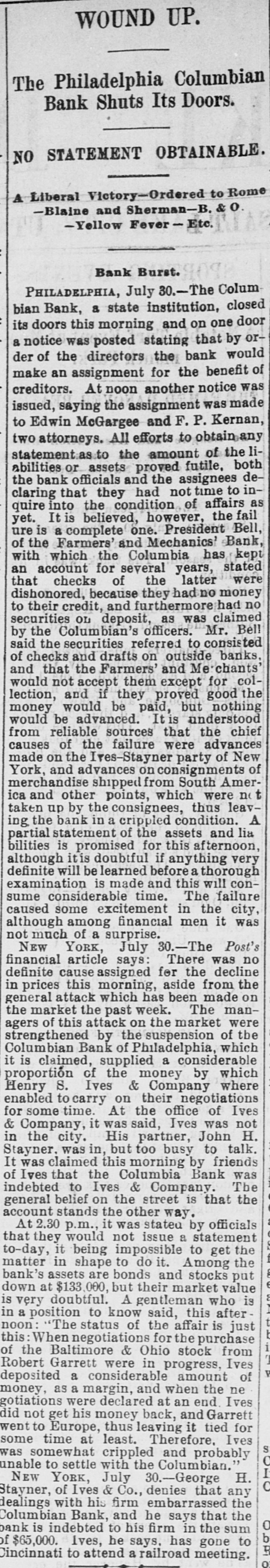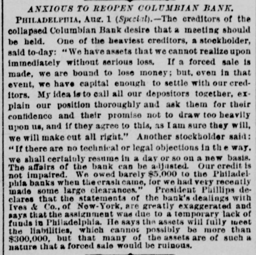 A DRAFT ON IVES NOT PAID. HOW THE COLUMBIAN BANK FAILED. HTS CONNECTION WITH THE NEW-YORK OPERATOR SAID TO HAVE HASTENED THE ASSIGNMENT. PHILADELPHIA, July 30.-The Columbian Bank closed its doors this merning, and posted a notice that by order of the Board of Directors the bank would make an assignment. At noon another notice was issued, saying that the assignment had been made to S. Edwin Megargee and F. P. Kernan, attorneys. All efforts to obtain any statement as to the amount of liabilities or the officials and bank the both futile, proved assignees declaring that they had not had time to inquire into the condition of affairs. It is believed, however. that the failure is complete. The Press says: It has been known for some days that the Columbian Bank's position was rather a precarious one and there have been several rumors as to its suspension, both here and in New-York. The cause which leads up to the difficulty is the acceptance by the Columbian Bank of the paper of Henry 8. Ives & Co., of NewYork. For some time past the bank has been doing considerable business for Messrs. Ives & Co. and recently the acceptances for them amounted to as much as $100,000 at time. This money, one of the bank officlais said on Tuesday to a Press representative, was promptly paid. We have been doing considerable business for Mr. Ives since," he continued, and we consider that we are amply secured.' The bank officials refused to state the amount of Ives's business with the bank since the payment of the $100,000, and reiterated the statement that the institution was fully protected. Other of the bank's money is tied up in advances, it 1s said, on drugs and articles of merchandise from Mexico. A gentleman in a position to know, who is not an official of the bank, said that he supposed the liabilities would be from $300,000 to $400,000, and that the persons who had made small deposits in the bank would be the chief sufferers The effect in York New-York will be to show conclusively the position of the Ives party. Ed. mund D. MeLonghlin, the counsel for the bank, said that when the Farmers and Mechanics' Bank threw out the Columbian's checks, the Columbian had $50,000 worth of securities there. Cashier Bradford said that he had gone to the Farmers and Mechanics' Bank several times during the day, inquiring whether securities that he was offering would be accepted for further accommodation. He continued: 'I was put off from time to time until the refusal was made known. It was then too late, or might have got the accommodation at Brown's or Drexel's. have $20,000 in securities now on that desk. The statement that the liabilities will be between $300,000 and $400,000 is exaggerated. The question with us is simply one of tight assets.' " President Bell, of the Farmers and Mechanics' who was asked in reference to Mr. McLaughlin's statement that the Farmers and Mechanics' Bank held $50,000 worth of the Columbian's securities when the latter's checks were thrown out, said: The securities held by us were covered by advances already made to the Columbian Bank except a small margin that we always keep. What may be coming to the Columbian Bank they will receive. am sorry, indeed, that they did not have $50 000 with na, for I would like to have helped them out. It would not have been just to the stockholders and depositors of the Farmers and Mechanics', however, for us to have carried their load. Securities were offered to us yesterday, but I did not think it wise to accept them. Our decision was made known much before 3 o'clock' Farmers the with been has dealing Columbian The and Mechanics' since it began active business nearly six years ago. The account was always considered a very satisfactory one. The Columbian generally had a handsome balance, which frequently reached $15,000 and $20,000. Lately, however, this balance has run very low, and the account has been watched by the Farmers and Mechanies' with a good deal of care. A few days ago a draft made by the Columbian Bank on Ives & Co., York, New-York, for $10,000 was not paid when presented. Mechanics' still more Farmers the made and refusal The solicitous. and careful President Phillips, of the Columbian, explained that they were well protected, that Ives had offered them any amount of excellent security and that the nonpayment of the draft was owing altogether to offer to not PIP Mechanics pur Farmers The blunder. contest this explanation, but it did not alter its policy. of line depositors, considerable has Columbian the and in addition has a branch bank, called the ColumMr. where Phillips Germantown, in Bank. bian Savings and some other gentlemen influent ally connected with the bank live. savings bank is largely patronized by mill operatives and other working people of Germanthe of general system. bank part The The savings town. but 1871, in Was issued Columbian the charter of The active business was not entered on until be ween five and six years ago. The institution is State bank, and by the terms of its charter the stockholders are apparently individually liable in double the amount of their holdings. President Phillips returned from New York last night. He had been informed of the turn of affairs by telegraph, and he spent most of the day at the office of Co. Details of the embarrassment had not been furnished him by wire, and he was only able to surmise them. He said He said that the blunder respecting the nonCo., draft that à on Ives the of $10,000 parently payment had precipitated the trouble, had been adjusted and the draft set off against the firm's account with the bank. He did not say in what the blunder consisted. said that a good deal of enmity had been shown to Ives & Co., and that there were endeavors in several directions to injure them, endeav however, he added, that had not been successful. He thought the firm was strong and solid, and said that the Columbian Bank had done great deal of business for them, amounting said knew that he He mil