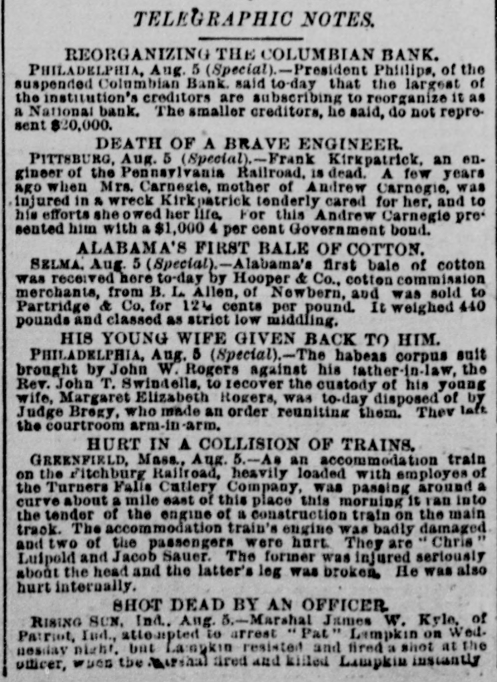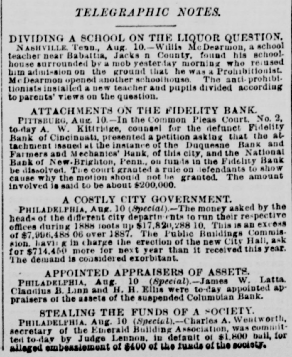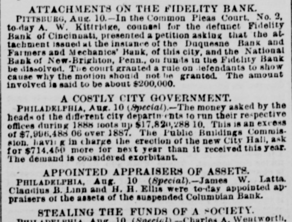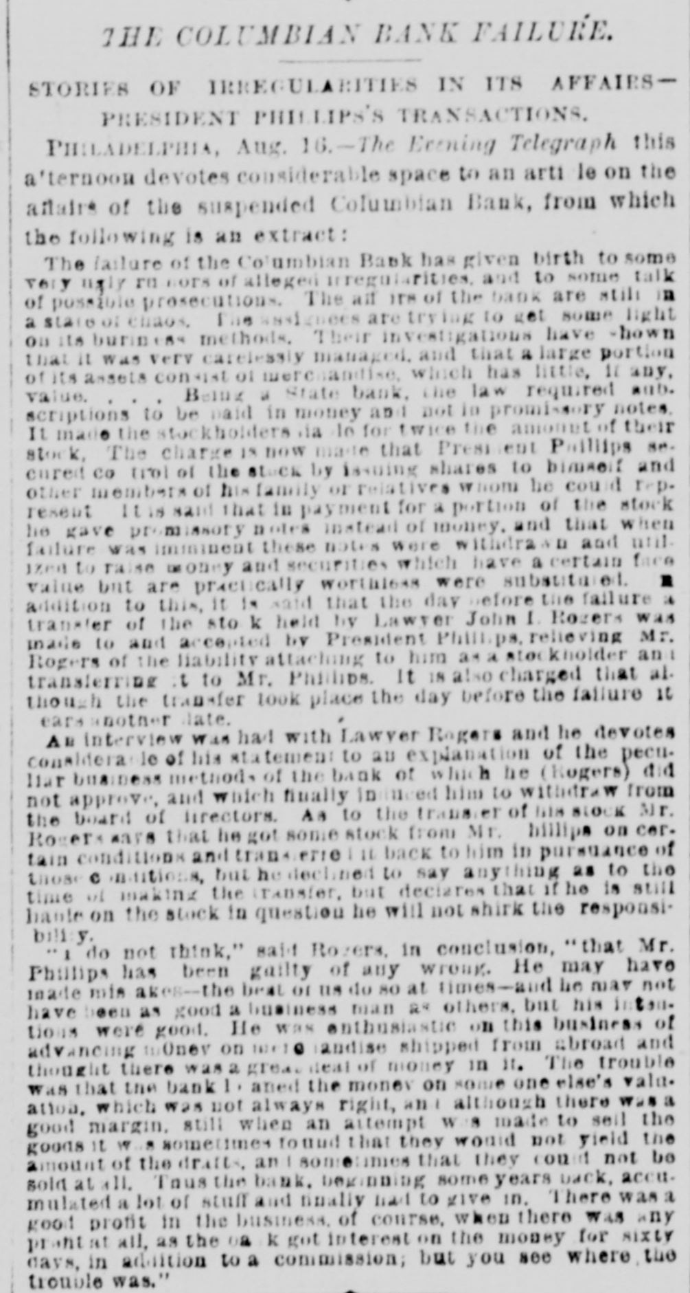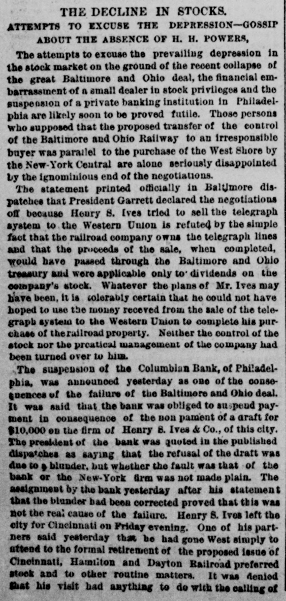 A DRAFT ON IVES NOT PAID. HOW THE COLUMBIAN BANK FAILED. HTS CONNECTION WITH THE NEW-YORK OPERATOR SAID TO HAVE HASTENED THE ASSIGNMENT. PHILADELPHIA, July 30.-The Columbian Bank closed its doors this merning, and posted a notice that by order of the Board of Directors the bank would make an assignment. At noon another notice was issued, saying that the assignment had been made to S. Edwin Megargee and F. P. Kernan, attorneys. All efforts to obtain any statement as to the amount of liabilities or the officials and bank the both futile, proved assignees declaring that they had not had time to inquire into the condition of affairs. It is believed, however. that the failure is complete. The Press says: It has been known for some days that the Columbian Bank's position was rather a precarious one and there have been several rumors as to its suspension, both here and in New-York. The cause which leads up to the difficulty is the acceptance by the Columbian Bank of the paper of Henry 8. Ives & Co., of NewYork. For some time past the bank has been doing considerable business for Messrs. Ives & Co. and recently the acceptances for them amounted to as much as $100,000 at time. This money, one of the bank officlais said on Tuesday to a Press representative, was promptly paid. We have been doing considerable business for Mr. Ives since," he continued, and we consider that we are amply secured.' The bank officials refused to state the amount of Ives's business with the bank since the payment of the $100,000, and reiterated the statement that the institution was fully protected. Other of the bank's money is tied up in advances, it 1s said, on drugs and articles of merchandise from Mexico. A gentleman in a position to know, who is not an official of the bank, said that he supposed the liabilities would be from $300,000 to $400,000, and that the persons who had made small deposits in the bank would be the chief sufferers The effect in York New-York will be to show conclusively the position of the Ives party. Ed. mund D. MeLonghlin, the counsel for the bank, said that when the Farmers and Mechanics' Bank threw out the Columbian's checks, the Columbian had $50,000 worth of securities there. Cashier Bradford said that he had gone to the Farmers and Mechanics' Bank several times during the day, inquiring whether securities that he was offering would be accepted for further accommodation. He continued: 'I was put off from time to time until the refusal was made known. It was then too late, or might have got the accommodation at Brown's or Drexel's. have $20,000 in securities now on that desk. The statement that the liabilities will be between $300,000 and $400,000 is exaggerated. The question with us is simply one of tight assets.' " President Bell, of the Farmers and Mechanics' who was asked in reference to Mr. McLaughlin's statement that the Farmers and Mechanics' Bank held $50,000 worth of the Columbian's securities when the latter's checks were thrown out, said: The securities held by us were covered by advances already made to the Columbian Bank except a small margin that we always keep. What may be coming to the Columbian Bank they will receive. am sorry, indeed, that they did not have $50 000 with na, for I would like to have helped them out. It would not have been just to the stockholders and depositors of the Farmers and Mechanics', however, for us to have carried their load. Securities were offered to us yesterday, but I did not think it wise to accept them. Our decision was made known much before 3 o'clock' Farmers the with been has dealing Columbian The and Mechanics' since it began active business nearly six years ago. The account was always considered a very satisfactory one. The Columbian generally had a handsome balance, which frequently reached $15,000 and $20,000. Lately, however, this balance has run very low, and the account has been watched by the Farmers and Mechanies' with a good deal of care. A few days ago a draft made by the Columbian Bank on Ives & Co., York, New-York, for $10,000 was not paid when presented. Mechanics' still more Farmers the made and refusal The solicitous. and careful President Phillips, of the Columbian, explained that they were well protected, that Ives had offered them any amount of excellent security and that the nonpayment of the draft was owing altogether to offer to not PIP Mechanics pur Farmers The blunder. contest this explanation, but it did not alter its policy. of line depositors, considerable has Columbian the and in addition has a branch bank, called the ColumMr. where Phillips Germantown, in Bank. bian Savings and some other gentlemen influent ally connected with the bank live. savings bank is largely patronized by mill operatives and other working people of Germanthe of general system. bank part The The savings town. but 1871, in Was issued Columbian the charter of The active business was not entered on until be ween five and six years ago. The institution is State bank, and by the terms of its charter the stockholders are apparently individually liable in double the amount of their holdings. President Phillips returned from New York last night. He had been informed of the turn of affairs by telegraph, and he spent most of the day at the office of Co. Details of the embarrassment had not been furnished him by wire, and he was only able to surmise them. He said He said that the blunder respecting the nonCo., draft that à on Ives the of $10,000 parently payment had precipitated the trouble, had been adjusted and the draft set off against the firm's account with the bank. He did not say in what the blunder consisted. said that a good deal of enmity had been shown to Ives & Co., and that there were endeavors in several directions to injure them, endeav however, he added, that had not been successful. He thought the firm was strong and solid, and said that the Columbian Bank had done great deal of business for them, amounting said knew that he He mil
