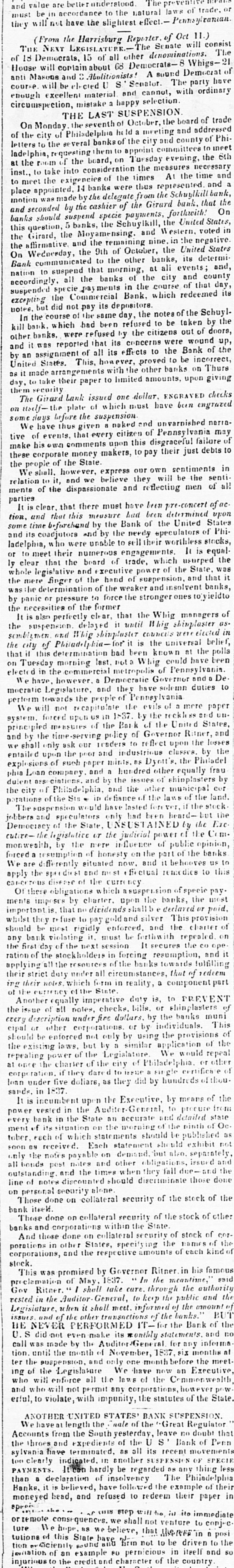 value of laws the natural consyltanian they must and will be in not accordance have the slightest effect.11.) Oct (From the Harrisburg Reporter The Senate will of will consis House THE NEXT LEGISLATU 15 of all other denominations. Whigsand Masons Abulitionists The Senator. of 13 Democrats, will contain about 68 Democrate- A sound Democrat party have with ordinary and course anti will be cied cannot, enough excellent mistake material happy selection. of trade circumspection, SUSPENSION board THE LAST of October, the and address On Monday of Philadelpina the seventh held a of the meeting city committees and county to of Phiroom of letters the city to the several banks them to appoint Tuesday evening the 6th consideration ladelphia, requesting of the board, on the measures the necessary time and at the take into of the times represented A and inst., meet to the exigen neies banks were thus the Schuylkillb bank forthwith place to appointed. was made 14 by the delegate of the from Girard bank. that On the question inotion and seconded by the cashier specie payments, the United States, in Moyamensing. in the banks should suspend banks, the Schuylkill, and Western. negative voted the this Girard, the and the remaining October, nine the United determit States On the firmative. Wednesday, the 9th to the of other at banks, ali events its and Bank communicated suspend that banks morning, of the city and of that county day, suspended Commercial nation accordingly to all the ayments Bank, in the which course redeemed its of the Schuy excepting but did the not pay its depositors day, the notes the by the HOLES In the course which of had the same been refused citizens to be taken out of doors, up, other kill bank banks, were refused that its by concerns to the Bank wound of the and it assignment was reported of all its effects provec 10 be on incorrect Thurs by an States. This, however, with the other banks giving their to take as United it made arrangements paper to limited amounts, upon checks ENGRAVED day, them The security Girard Lank issued of which one must dollar. have been narra unvarnished on before the suspension noked and may some We days have thus that every given a citizen of disgraceful Pennsy Ivania failure corporate make tive of his o w.n events. comments money makers, upon this pay their just debts in sentiments these the people of however the State express they our own will be the sen of all of the ments of relation We shall. to it, and dispassionate we believe and reflecting men ac re-concert that this of the Bank parties It is clear that there meusure must had have been determined United States upon Phi tion. time and beforehand by by the the nerry speculators worthless of stocks some and its coadjutors and unable to sell their It is equal ladelphia, who were engagements. usurped the or to meet that their the numerous board of trade, power which of the and State that it ly whole clear legislative finger of and the hand weaker of suspension and insol vent vieidto banks, pressure was the mere he termination in of force the the stronger ones 10 of by panic recessities or of the former that the Whig shimplaster managers the It is also perfectly delayed clear, it until council Whig this semblemen the suspension and Whig shimpluster for is the universal at the belief polls the city of determination Philadelphia- bad been Whig known could have been the that on Tuesday morning commercial last. metropoli not Gove of Pennsy mur and De to electri We have in Legislature, however. and Democratic they Penneylvania have solemn duties perform mocratic towards recapitulate the people of the evils reckle mere and paper on We will forced not upon US in 1-37. Park by of the the United and the Traders classes principled system: measures time-serving of the policy to of Governor flect upon Ranet, the by lostes the and we shall by only ask our the poor and industrious Dyett's the Philadel frau ass dulent explosions entailed upon of such paper and a hot dred other of shipplasters equally by Philadelphia, of the laws phia Loan company cintions. and by and the the issues other municipal the land cur would had been only intebre speculators the city marations of of the Sis in de have fiance lasted of for heard- if the but the the Exc by INSUSTAINED the Come fluence opinion Democracy of the State, OT the judicial power of public monwealth, cuties- by of mere honesty on the part be of hooves the banks us to forced a We differently resumption situated most now. finctual and it dics to this apply the disease of the curr of specie pay or these obligations charter. which upon the banks, declared the or paid. most ments important impost is. that by no dividends gold and silver the This charlet provision should whilet they be most r fuse rigidly to pay must enforced. be forthwith and repealed the CO ope on any bank violating of the next it. session It secures resumption, and it their duty ration the first of day the ckholders in of forcing the banks towards of fulfilling redeem in form which reality, applyi all the under all circumstances, a component that part ing decormency their other State. duty is to shinplasters PREVENT of Another equally imperative checks. Bills or the banks muni This be should the issue description of all notes, under fine dollars or by by individuals provisions a by but We would every cipal or other enforced corporations not only by similar using application the of the repeal the existing power laws. of the Legislature of Philadel er other repealing charlet of the city B FII certific of thou at once the if they dare d to did by hundre ds the loan corporation under five deliars, as they by means of sands. 1: IS in incumber 1837 upen Audito the Executive, General, and to detailed procure state in power vested in the the State an accurate morning of the ninth of Oc as which ment every of bank situation statements the should should be publisher exhibit tober. 08 rach received. of able Each on sta