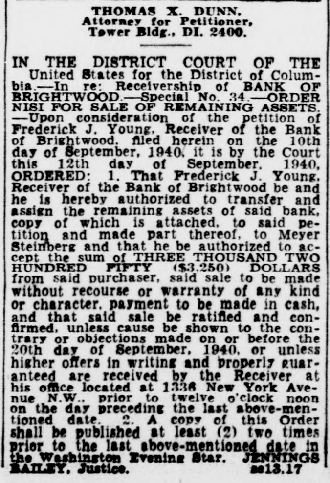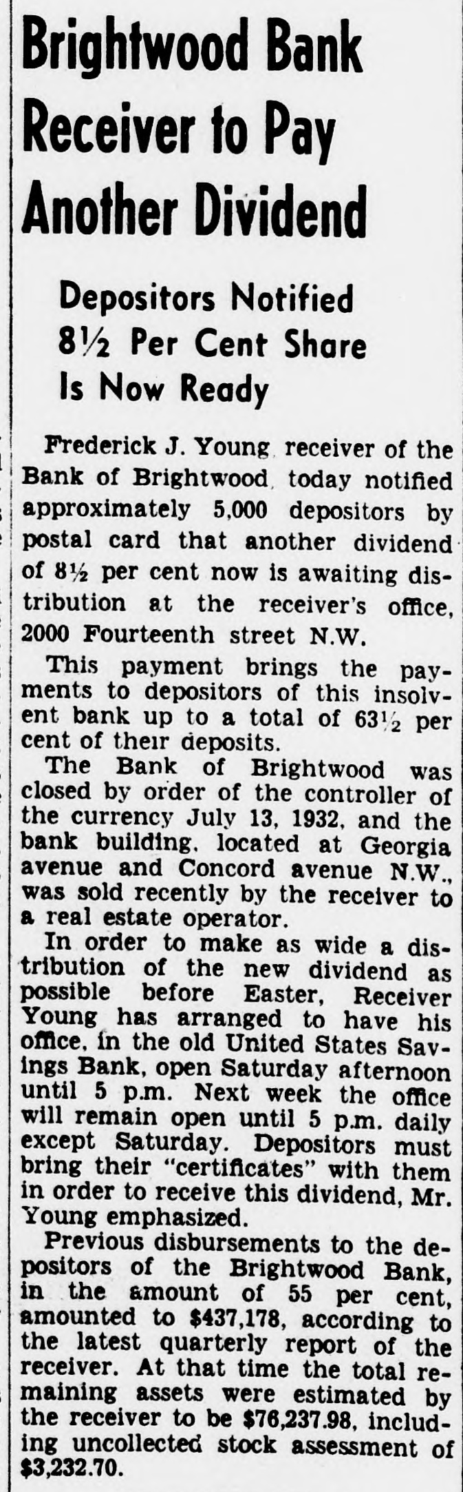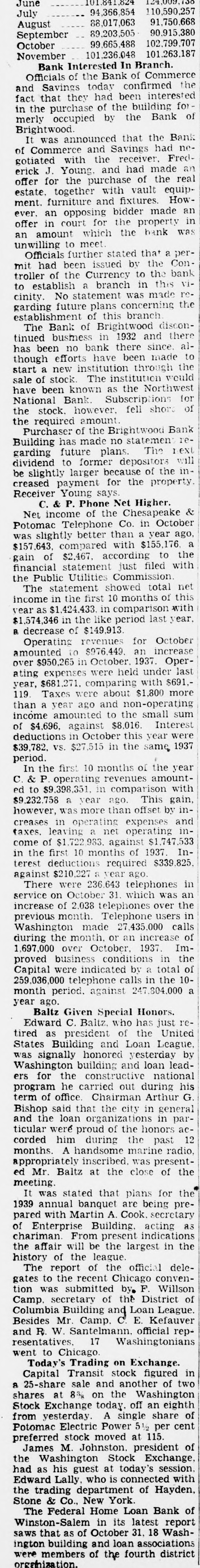 July August September 89,203,505 88,017,063 102.799.707 90.915.380 October 101.236.048 99,665,488 101.263.187 November Officials Bank Interested of the today Bank In confirmed of Branch. Commerce interested the and Savings they had been for merly fact in the that purchase occupied of by the the building Bank Bank of Brightwood - nounced was Savings that the had neIt and receiver. Fred- an with had of gotiated Commerce J. Young. the and of made the real erick for the purchase vault equipoffer estate. furniture together and with fixtures. made HOW- an ment. an opposing bidder the property was in amount ever. offer in court which for the bank unwilling an to meet stated tha+ a Con- perthe Officials further issued by the bank troller mit had of been the Currency branch to in this re- vicinity. to establish No future statement a plans concerning branch was made the there garding establishment Bank of of Brightwood this 1932 and disconThe business in since. albeen no have been the though institution has tinued efforts bank there through made to start sale of a stock new known The as institution the Northwest tions would for have been Subscripti of National the stock. Bank. however. fell shore Building the required of amount the Brightwood statement Bank replans Purchaser has made no The next will garding future to former because depositors of the increased dividend be slightly payment larger for the property. Receiver C. & Young P. Phone says. the Net Chesapeake Higher. & income of Co. in October a was Potomac Net slightly Telephone better than with a $155,176 year to ago, the of just $157.643, compared according with Commission gain financial statement $2,467. filed net the Public Utilities showed total statement months of this income The in the first in 10 comparison year. with year as $1.424.433. like period last of $149,913. $1,574,346 a decrease in the revenues for October amounted Operating $976.449. an increase $950.265 to in October were held 1937. under Oper- last over with $691.$681.271. $1.800 year, ating 119. Taxes expenses were comparing and about non-operating more sum than a year ago to the small against income amounted $8.016. Interest were year vs. $39,782. of deductions $4,696. in $27,515 October in the this same 1937 period. the first 10 months of amount- the year In & P operating revenues comparison gain, with C. $9.398.351. in This a year than offset by was expenses however, $9,232,758 ed to operating more ago. and in- inin operating creases a net $1,747,533 taxes. of $1.722.5 933. of 1937 Income first leaving 10 months against $339,825. in the deductions required ago against terest $210,227 236.643 a year telephones was an in service There were which increase on of October 2.038 telephones Telephone 31. over users calls the in month. 27.435.000 during Washington previous the month. made October. or an increase 1937. Im- the of 1,697,000 business over conditions a total in of Capital proved were indicated calls by in the 10- a month year 259,036,000 period. telephone against 247.304.000 ago. Given Special Honors. just Baltz who has retired Edward as president C. Baltz. and of Loan the League. United by States Building yesterday signally and loan was Washington building honored national leadconstructive his ers the during G. program term for of office. he carried Chairman the out city in Arthur general Bishop said that organizations in parloan honors acand the were proud of the the past 12 ticular him during marine radio, corded months. A handsome inscribed. was presentBaltz ed Mr. appropriately at the close of the for the plans meeting. stated that being preIt was annual banquet Cook. are secretary pared 1939 with Martin Building. A. acting as Enterprise present the chariman. be the of the affair will From league largest indications in deleof the the official Willson history The to report the recent of Chicago by. F. conven- of gates was submitted of the District Columbia tion Camp. secretary Building Camp. and C Loan E. Kefauver League. repBesides Mr. official resentatives. and R. W. Santelman-aningtonians 17 in went to Chicago Trading stock on Exchange. figured a on Capital 25-share Today's Transit sale and the another Washington of two eighth shares Exchange at today. A single off an share of from Stock yesterday. Power 5 1/2 per cent Potomac Electric moved at 115. James preferred M. stock Johnston. Stock president Exchange, of the Washington his guest at today's connected session. with had as Lally, who is of Hayden, & Co., New Home Loan Bank report Edward Stone the The trading Federal department York its latest of Winston-Salem that as of October in loan 31. associations 18 Washington members of the saws building and fourth district