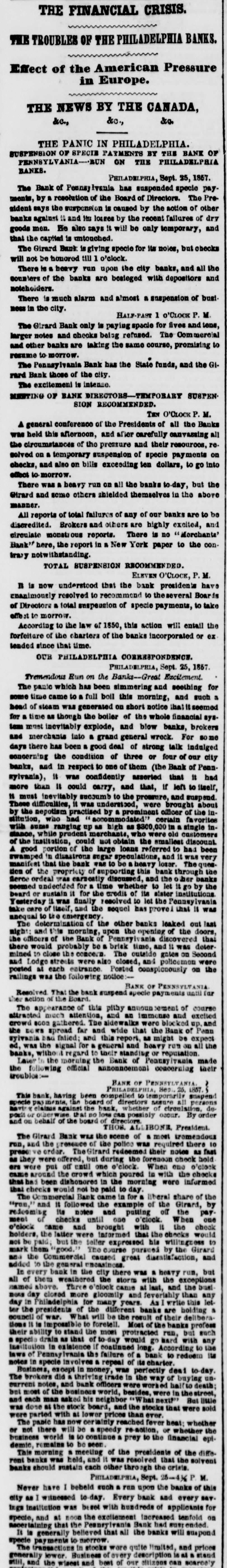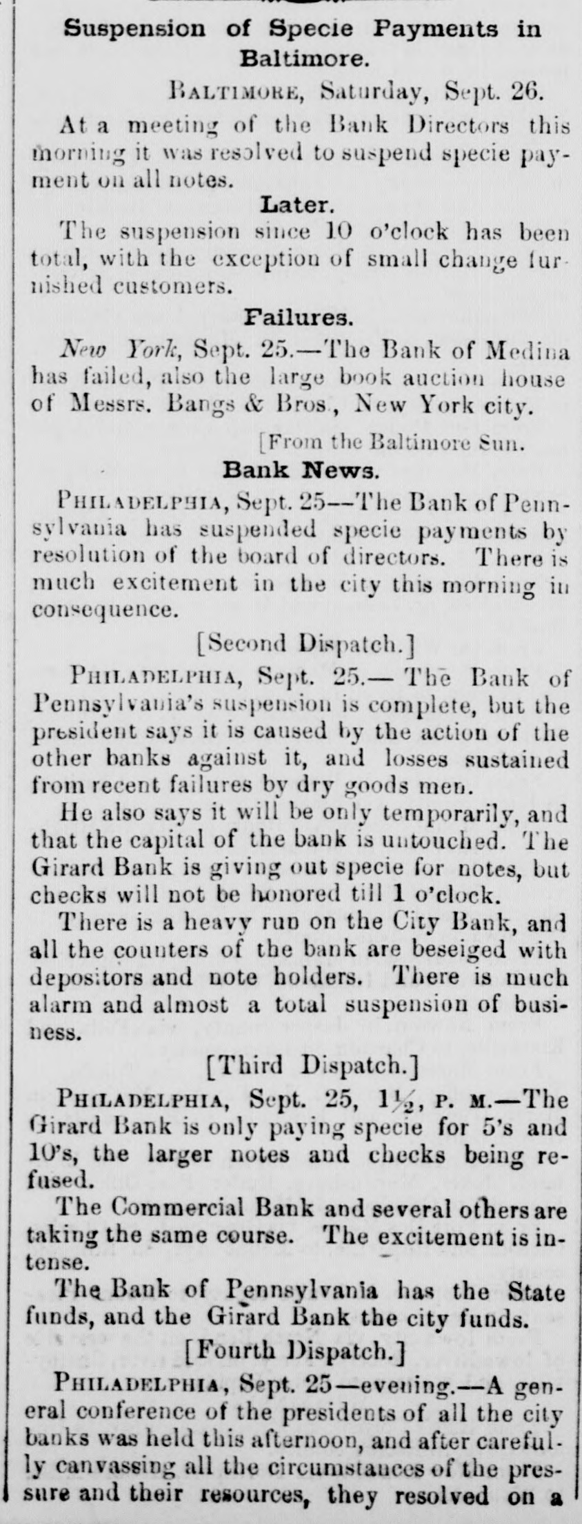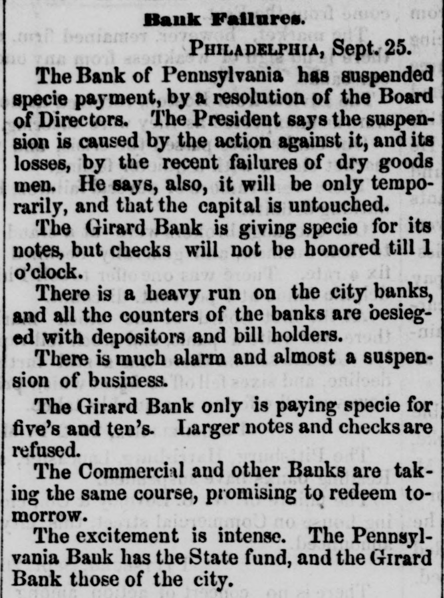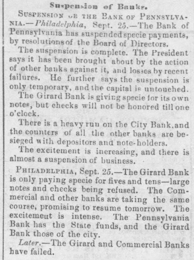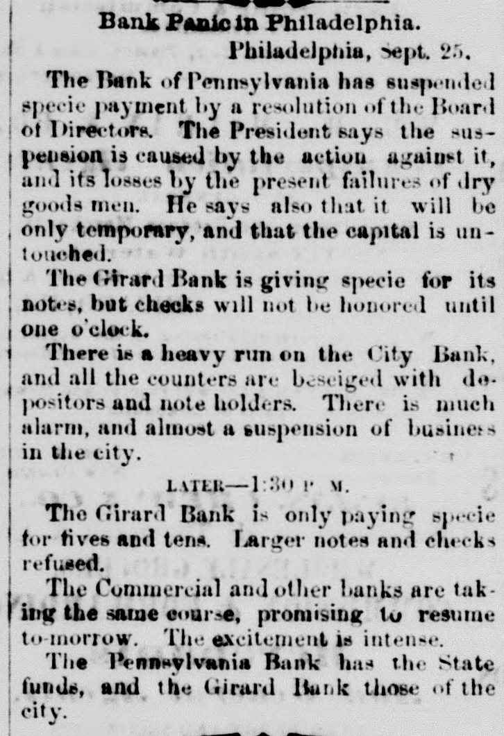 TELEGRAPHIC NEWS. FROM THE ASSOCIATED PRESS. Bank Suspensions. PHILADELPHIA, Sept. 25 --Fhe Bank of Pennsylvania, in this city, has suspended specie payments by a resolution of the Board of Directors. There is much excitement in consequence. [SECOND DISPATCH.] The Bank of Pennsylvania's suspension is complete; but the President says it was caused by the action of other Banks against it, and the losses sustained by recent failures of dry goods men. He also says that it will be only temporary, and that the capital is untouched. The Girard Bank is giving specie for its notes, but depositors' checks will not be honored until one o'clock. There is a heavy run on the City Bank. and all the counters of Banks are besieged with depositors and note holders. There is much alarm, and almost a suspension of business. 1½ p. m-The Girard Bank is only paying specie for "5's" and "10's," the larger notes and checks being refused. The Commercial Bank, and several others, are taking the same course, promising to resume full business to-morrow. The excitement is intense. The Bank of Pennsylvania has the State funds, and the Girard Bank the City funds.