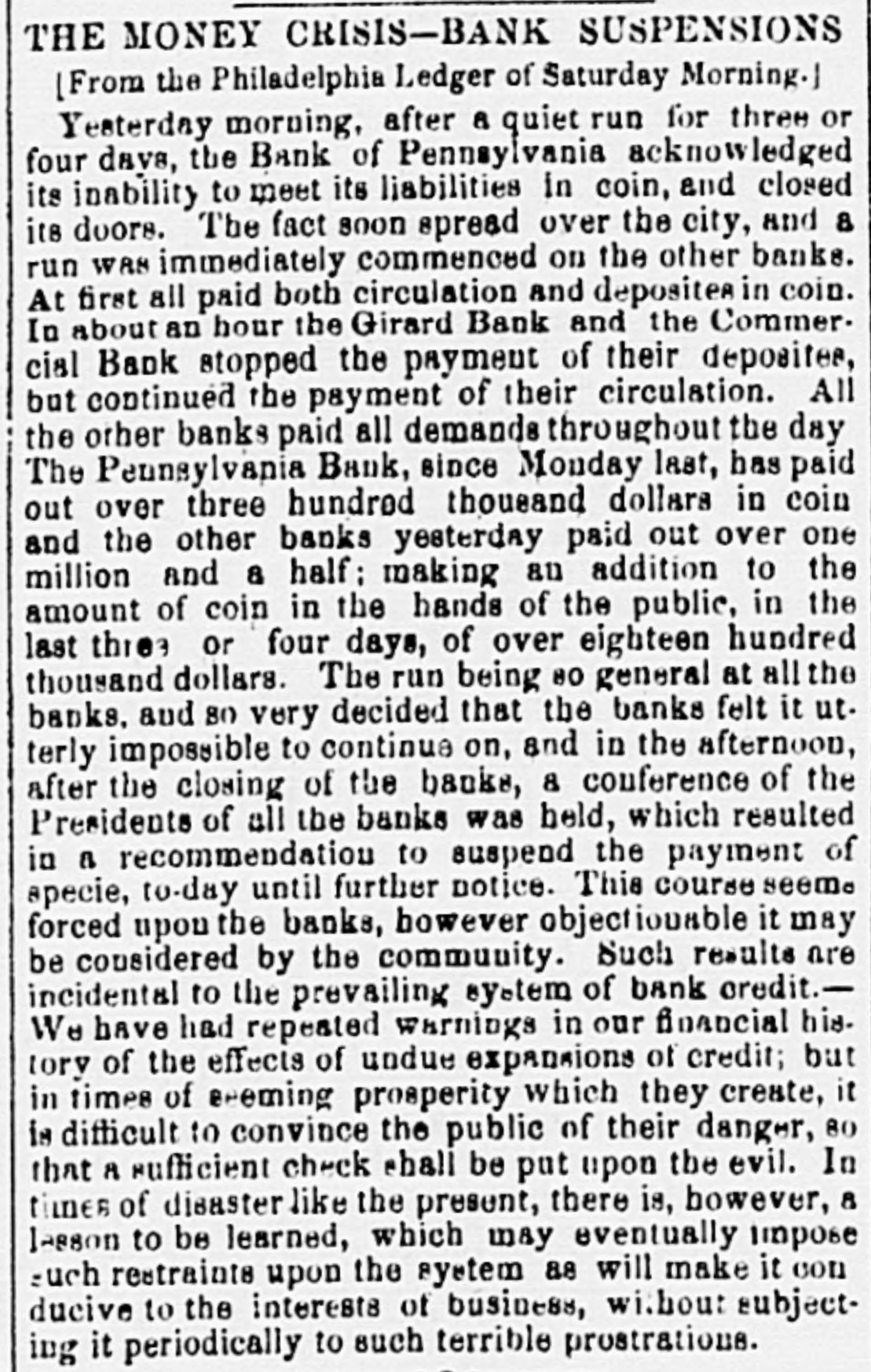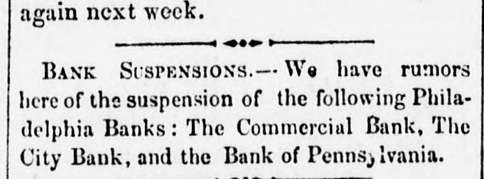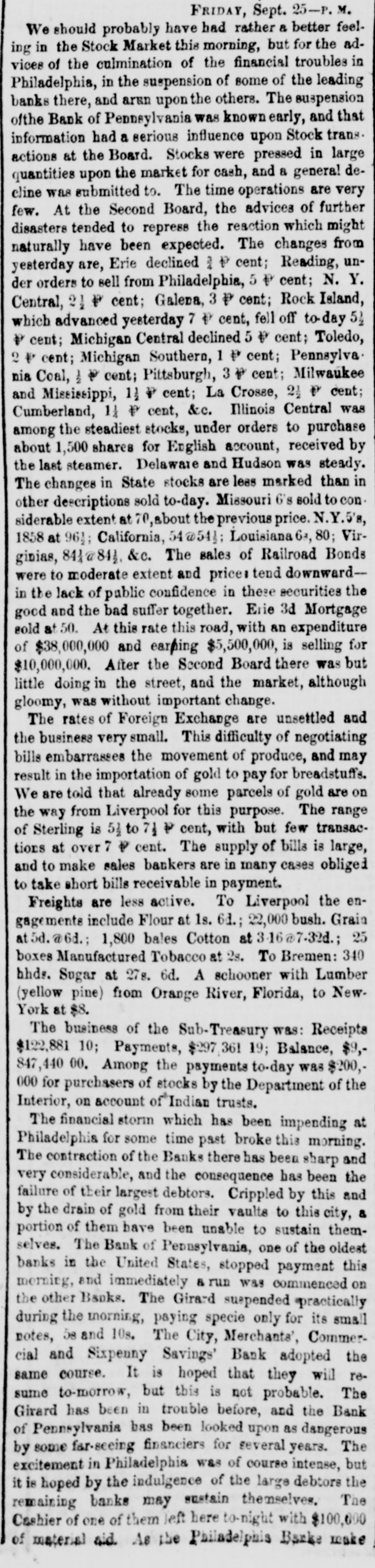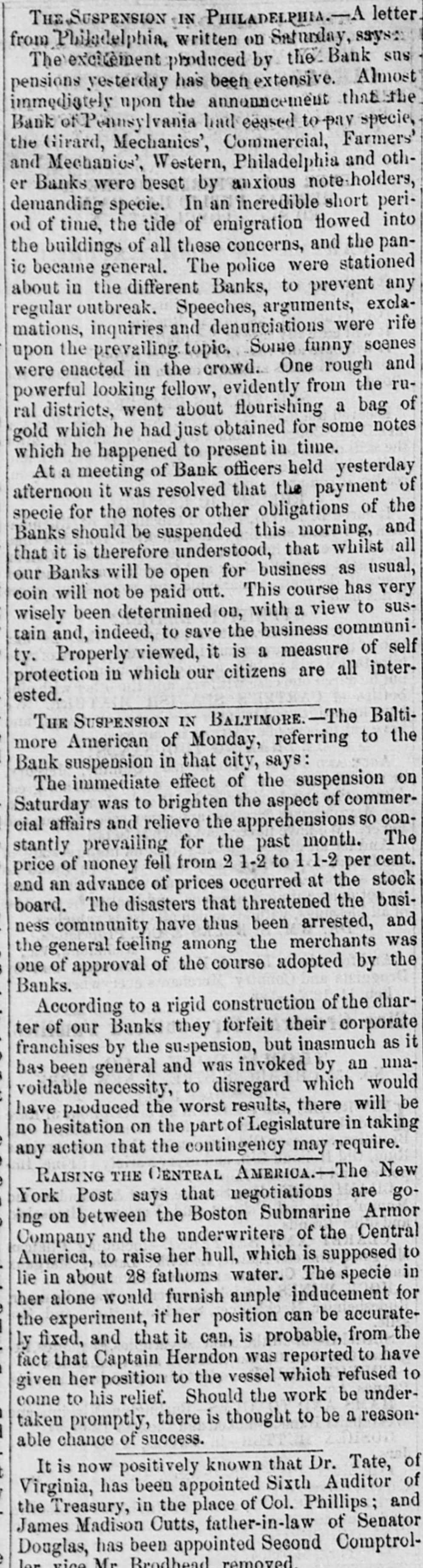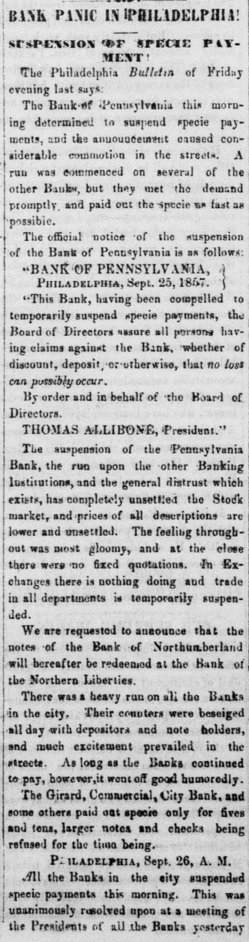 TELEGRAPHIC NEWS. FROM THE ASSOCIATED PRESS. Bank Suspensions. PHILADELPHIA, Sept. 25 --Fhe Bank of Pennsylvania, in this city, has suspended specie payments by a resolution of the Board of Directors. There is much excitement in consequence. [SECOND DISPATCH.] The Bank of Pennsylvania's suspension is complete; but the President says it was caused by the action of other Banks against it, and the losses sustained by recent failures of dry goods men. He also says that it will be only temporary, and that the capital is untouched. The Girard Bank is giving specie for its notes, but depositors' checks will not be honored until one o'clock. There is a heavy run on the City Bank. and all the counters of Banks are besieged with depositors and note holders. There is much alarm, and almost a suspension of business. 1½ p. m-The Girard Bank is only paying specie for "5's" and "10's," the larger notes and checks being refused. The Commercial Bank, and several others, are taking the same course, promising to resume full business to-morrow. The excitement is intense. The Bank of Pennsylvania has the State funds, and the Girard Bank the City funds.