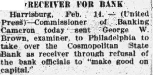 ORDER PHILADELPHIA BANK TAKEN OVER. of Banking Cameron today sent George Brown. examiner. to Philadelphia. to the Cosmopolitan State bank receiver through refusal of the bank officials to "make good on capital."