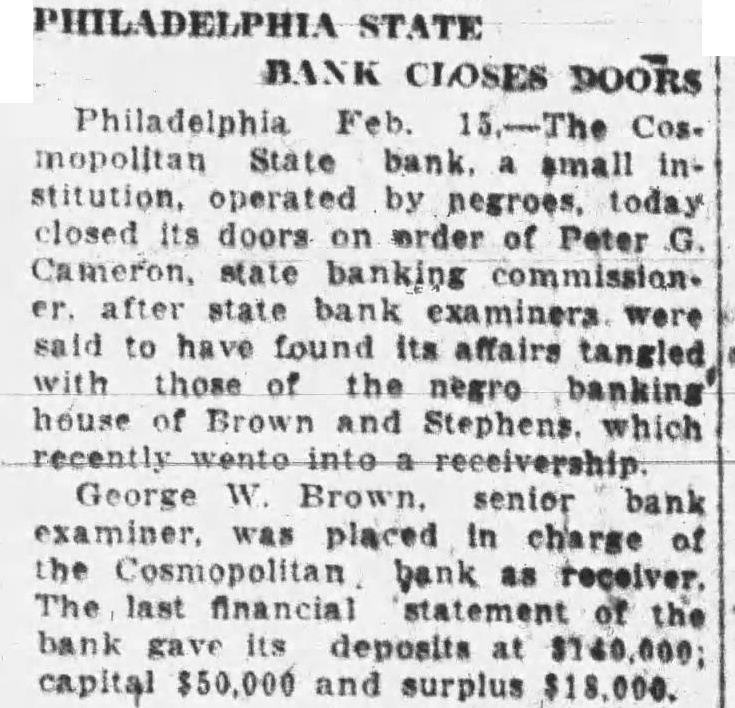 PHILADELPHIA STATE BANK CLOSES DOORS Philadelphia Feb. 15.-The Cos. mopolitan State bank. small institution, operated by negroes. today closed its doors on wrder of Peter Cameron, state banking commission. after state bank examiners were said to have found its affairs tangled with those the negro banking house of Brown and Stephens. which George Brown. senior bank examiner. was placed in charge the Cosmopolitan bank as receiver. last financial statement of the bank deposits capital $50,000 and surplus