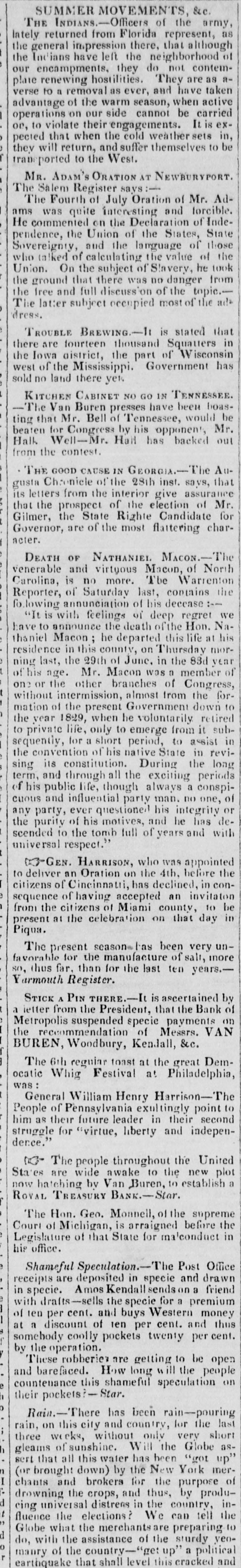 "It is with feelings of deep regret we have to announce the death of the Hon. Nathaniel Macon; he departed this life at his residence in this county, on Thursday morning last, the 29th of June, in the 83d year of his age. Mr. Macon was a member of one or the other branches of Congress, without intermission, almost from the formation of the present Government down to the year 1829, when he voluntarily retired to private life, only to emerge from it subsequently, for a short period, to assist in the convention of his native State in revising its constitution. During the long term, and through all the exciting periods of his public life, though always a conspicuous and influential party man, no one, of any party, ever questioned his integrity or the purity of his motives, and he has descended to the tomb full of years and with universal respect."