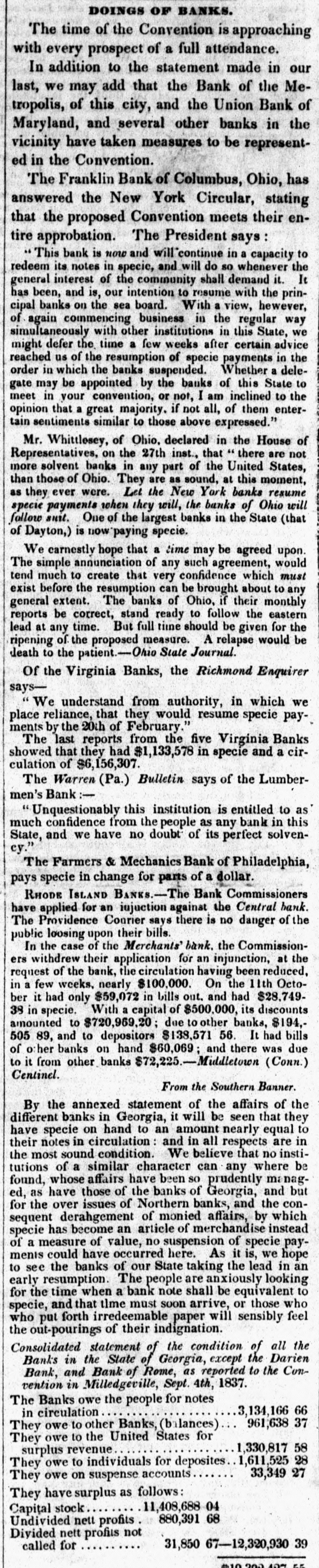 In addition to the statement made in our last, we may add that the Bank of the Metropolis, of this city, and the Union Bank of Maryland, and several other banks in the vicinity have taken measures to be represented in the Convention. The Franklin Bank of Columbus, Ohio, has answered the New York Circular, stating that the proposed Convention meets their entire approbation. The President says This bank is now and will continue in a capacity to redeem its notes in specie, and will do so whenever the general interest of the community shall demand it. It has been, and is, our intention to resume with the principal banks on the sea board. With a view, hewever, of again commencing business in the regular way simultaneously with other institutions in this State, we might defer the time a few weeks after certain advice reached us of the resumption of specie payments in the order in which the banks suspended. Whether a delegate may be appointed by the banks of this State to meet in your convention, or not, I am inclined to the opinion that a great majority. if not all, of them entertain sentiments similar to those above expressed." Mr. Whittlesey, of Ohio. declared in the House of Representatives, on the 27th inst., that "there are not more solvent banks in any part of the United States, than those of Ohio. They are as sound, at this moment, as they ever were. Let the New York banks resume specie payments when they will, the banks of Ohio will follow suit. One of the largest banks in the State (that of Dayton,) is now paying specie. We earnestly hope that a time may be agreed upon. The simple annunciation of any such agreement, would tend much to create that very confidence which must exist before the resumption can be brought about to any general extent. The banks of Ohio, if their monthly reports be correct, stand ready to follow the eastern lead at any time. But full time should be given for the ripening of the proposed measure. A relapse would be death to the patient.-Ohio State Journal. Of the Virginia Banks, the Richmond Enquirer saysWe understand from authority, in which we place reliance, that they would resume specie payments by the 20th of February." The last reports from the five Virginia Banks showed that they had $1,133,578 in specie and a circulation of $6,156,307. The Warren (Pa.) Bulletin says of the Lumbermen's Bank " Unquestionably this institution is entitled to as much confidence from the people as any bank in this State, and we have no doubt of its perfect solvency. The Farmers & Mechanics Bank of Philadelphia, pays specie in change for parts of a dollar. RHODE ISLAND BANKS.-The Bank Commissioners have applied for an injuction against the Central bank. The Providence Courier says there is no danger of the public loosing upon their bills. In the case of the Merchants' bank. the Commissioners withdrew their application for an injunction, at the request of the bank, the circulation having been reduced, in a few weeks. nearly $100,000. On the 11th October it had only $59,072 in bills out. and had $28,74938 in specie. With a capital of $500,000, its discounts amounted to $720,969.20 due to other banks, $194, 505 89, and to depositors $138,571 56. It had bills of her banks on hand $60,069; and there was due to it from other banks $72,225.-Middletown (Conn.) Centinel. From the Southern Banner. By the annexed statement of the affairs of the different banks in Georgia, it will be seen that they have specie on hand to an amount nearly equal to their notes in circulation and in all respects are in the most sound condition. We believe that no institutions of a similar character can any where be found, whose affairs have been so prudently managed, as have those of the banks of Georgia, and but for the over issues of Northern banks, and the consequent derahgement of monied affairs, by which specie has become an article of merchandise instead of a measure of value, no suspension of specie payments could have occurred here. As it is, we hope to see the banks of our State taking the lead in an early resumption. The people are anxiously looking for the time when a bank note shall be equivalent to specie, and that time must soon arrive, or those who who put forth irredeemable paper will sensibly feel the out-pourings of their indignation. Consolidated statement of the condition of all the Banks in the State of Georgia, except the Darien Bank, and Bank of Rome, as reported to the Convention in Milledgeville, Sept. Ath, 1837. The Banks owe the people for notes 3,134,166 66 in circulation 961,638 37 They owe to other Banks, (balances) They owe to the United States for 1,330,817 58 surplus revenue They owe to individuals for deposites 1,611,525 2 33,349 2 They owe on suspense accounts They have surplus as follows: 11,408,688 0 Capital stock 880,391 68 Undivided nett profits Divided nett profits not 31,850 67-12,320,930 39 called for 10200009