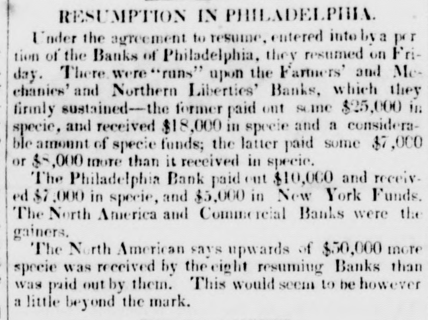 Philadelphia. Corresponsence of the Herald.] PHILADELPHIA, March 1842 A full Resumption of Specie Payments-All non-specie paying Banks discredited and closed-Habeus Corpus es-Suicide All our banks to day entered upon a full and unconditional resumption of specie payments. Every demand of every character is met in coin-even the relief notes, of such of them as issued these bills, are redeemed in specie, the same as the banks' own promises to pay. We have now but nine banks, to wit :-Philadelphia, Commercial, North America, Farmers' and Mechanics', Southwark, Northern Liberties, Western, Kensington, and Germantown. All the others are in course of liqui. dation. The Moyamensing and the Manufacturers' and Me chanics' did not open this morning-making eight broken banks in our city out of seventeen, with an aggregate capital of $46,250,000 ! So we go. The resumption was agreed upon last night, and has been well sustained. Oa three or four of them there was something of a run. but they all met it without finching, and so confident are the people that they can stand it, or NO tired are they of suspension, that hundreds of thousands of dollars have already been carried in and deposited with them. It is well ascertained that in the aggregate more specie has been deposited with the banks than has been drawn from them. There has been great commotion throughout our city all day, and little or no business of any sort transacted. The people were so rejoiced got the sight of gold and silver, that they could think nor talk of nothing else. By to-morrow evening, the vacuum created by the withdrawal or dis. crediting of small irredeemable paper will be filled with specie, and on Monday, the banks will be found puisuing their avocations as of old. Success to every honest move they make. To-day the decision of the Judges of the Court of General Sessions was given in the case of the write of habeas corpus taken out by Nicholas Biddle, Joseph Cowperth aite, and John Andrews, which were originally heard by the Court of Common Sessions, Pleas, and sustaining remanded from the motion that Court of to the the Attorney General General to dismiss the write and bind the relators to answer at the present term of the General Sessions. The Court then ordered the parties to give bail each in the sum of$10,000 for their appearance from day o day. By the advice of their respective counsel, the defendants were committed into the custody of the Sheriff, when write of habeas corpus were sued out before the judges of the court with the view of having them discharged, and Monday, the 28th instant, fixed for hearing them. several coun in reference to the An sel argument and the Attorney took place General between the hearing of the cases separately or together, the Attorney General being anxious to have them heard jointly, and the counsel for the relators urging that they may be heard singly. The matter was left undetermined, the Court suggesting that the question might he left open until the time of hearing. Last evening, Sydney Freeman. blind manufacturer, in Second Street, below Dock, committed suicide by hanging himself. He was about 35 year of age, with a wife and two children, and appeared to be doing a good business. During the day he appeared to be much indisposed, and was left in room in the where his 8 about five o'clock afternoon, about o'clock he was discovered hanging by the bed post. The Coroner held an inquest up. n the body at 10 o'clock. Verdict accordingly. The family of the deceased is from East Jersey, or from New York. At the stock board there was but one sale to-day -10 sbares of Farmers' and Mechanics' Bank at 20, an advance of $1 on last sale. Exchange on New York prem. The paper of the banks which have slopped within the last two or three days is at a discount of about 25 per cent. The following is a statement of the condition of the Moyamensing Bank, March 2, 1842:STATEMENT OF MOYAMENBING Bank, MARCH 2, 1842.