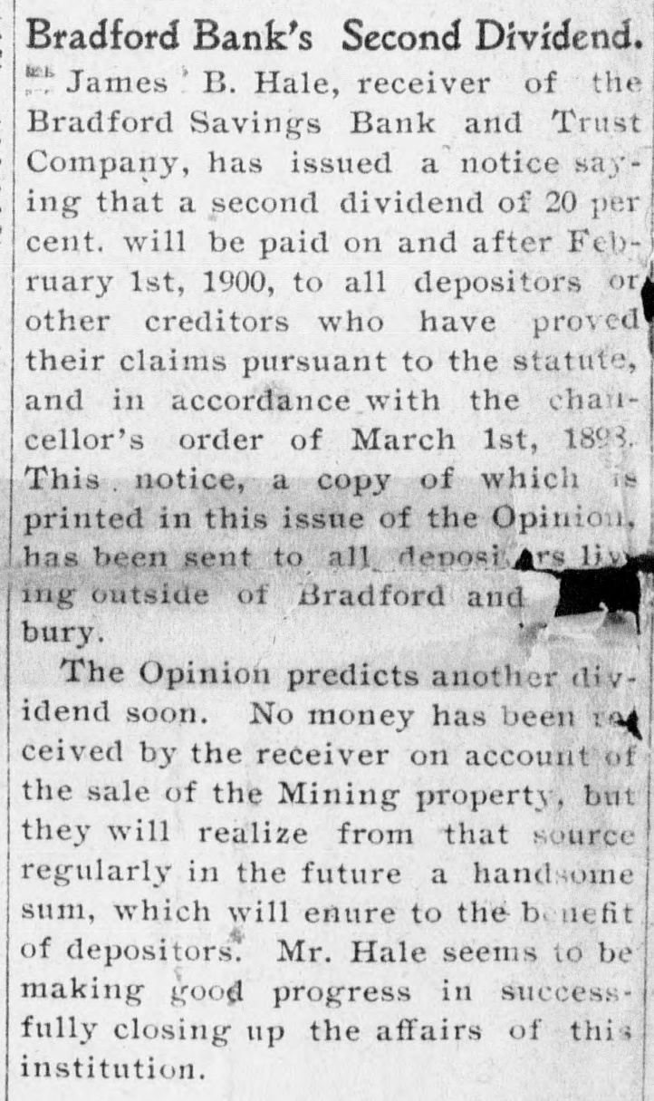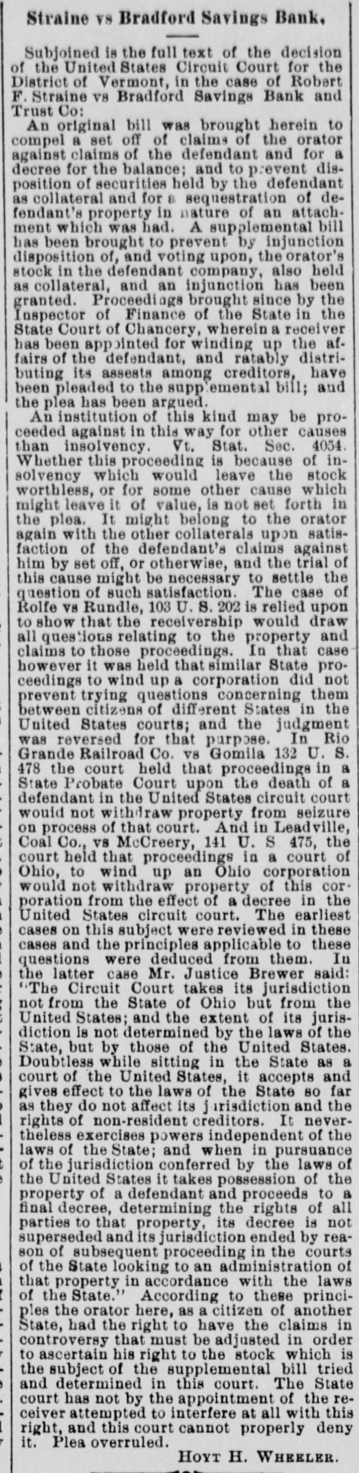 The progress of the Investigation ha beer necessarily slow 84 many objections have been interposed wl en the production of PA. per was called for, It ppeared that Hor ace F Bailey and William E S Celley in September, 1897. were appointed by the trustees auditors to audit and did audit and allow a bill of services and ex penses for E. O. Leonard to the amount of $1 566; their report was accepted by the trustees but Mr. Hale testified that no such bill of $1,566 can now be found in the bank and the witness did not know the items hat made up the bill, or what had become of the bill. This certainly had the element of novelty about it. Strange that the president and receiver can not produce the items of a hill of that magnitude. Mr. Hale testified that the attorney of the bank was not paid a salary but according to work, and was allowed to bring and de fend suits according to his discretion, and that, he, Mr Hale, left the whole matter of the bank's litigation to the attorney Loans to the Copperfield Mining and Smelting Company (secured by mortgage) to the amount of $40,000 were shown, and $10,000 to Mr. Kaigen, with E M F. Krause as en dorser On this $40,000 no interest had been paid since 1893, and the bank, in 1896, naturally wished to unload, and did discharge its mortgages when the Ely Copper field Mining Company was organized, and took the deed of the property as stated in report of yesterday '8 hearing. Charles A. Lamson, of the United Telegram Company is here as an interested speciator, and full of information as to the affairs of that company It is apparent.that this investigation will be quite protracted, and as was remarked on the street here, 'There is no knowing where lightning will strike THURSDAY The hearing of Straine V. Bradford SavBank and Trust Company has occupied the entire ings day, and Receiver James B. Hale has been under examination by Attorney Stockbridge. The interest in the developments contin- of unabated and exclamations, not all them ues pious, are heard upon the street as the different facts brought out are narrated and discussed. The deposit account of E. o. Leon ard from January 1. 1896, to January 1, 1898 was obtained and it was found that with an overdraft of $16 12, January 1, 1896, these overdrafts continued in an ascending series until they touched high water mark Dec. 1, 1897, at $6504 70. On January 1, 1898, it had been reduced to $5215 72 and this was wiped off January 3, 1898, by the two notes of $2,200.00 and L. $3075.00 respectively, signed by Irene Leonard. These notes remain unpaid. d Receiver Hale, for all the time of these overdrafts a trustee, and for a part of the rer time the president of the bank, could k call no vote of the trustees authorizing these overdrafts, or ratifying them after e wards. There is no record of any such <notes. Mr Hale professed almost absolute le ignorance of these overdrafts, but thought that at least once he personally did object d to it. yet, he has been unable to find any items of expenses amounting to $1,566. In e 68 for which Mr. Leonard had been paid that amount in drafts up to September 14, to 1897. Mr. Hale, under the advice of counsel, '8 refused point blank to produce bills of ex8penses and documents that orator's solicie tors called for, and was notified more than 3. once that applications would be made to a Judge Wheelor to compel him to produce as there documents We do not undertake 8say who right about this production. a 0, The solicitor for orator went into ly lengthy examination about the appearance ed of George M. Dickey, Esq ostensibly 18 the attorney of John B. Arnold, about the pg purchase of Mr. Straine's sixty. four shares be 8, of stock. Mr. Hale's memory seemed to he verymuch in fault about it. but he admitted nt that Mr. Dickey had made and presented Cto him as receiver a bill against the bank in for these services, which he had declined to 18pay unless directed to do so by Chancellor m Tyler. Mr. Hale refused to produce Mr. Dickey' bill. Mr. Straine claims this sale 10 of his stock was a sham. It was further developed that at no time 100 had this bank had a trial balance made 60 month as required by the Vermont Statutes, had it had its affairs investigated by of committee nor of not less than three of its 15 ficers. It was brought out that, in June 1896, Mr 00 Hale was informed that Mr. Straine was dangerous man, that he believed this infor 100 mation to be correct, and never changed his mind on that matter, and yet afterwards he 75 and three others of the trustees went to 50 Bostor, met Mr. Straine at the Parker House, and on July 23, 1896, entered into 36 the contract of that date with Mr. Straine at discharged all the claims of the bank on th of Ely Copperfield mining property, and took ees the $51,000 note, with $100,000 of the Ely Copperfield Mining Company bonds as col rd zes lateral. Mr. Hale testified that in his judgmen a this $51,000 note was thereby amply secur as ed and these bonds a good safe investment ent proper to be sold by this bank, but admit am ted that the bank had made no effort to se Mr. them, so far as he knew It is for this ne of glect, in view of the terms of this contract July 23, 1896, that the orator, Mr. Straine further ink seeking to recover damages. It my appeared that instead of trying to sell thes to bonds, this bank, in February, 1897, brough the a suit in New Jersey against Mr. Strain M ard for $13,000 and endeavored to attach in Straine's stock in the United Telegrar Company. This suit is one of a series M ver attacks on him by this bank that ted Straine claims were designed to cripple an on ruin him. On the other hand, the ban claims that it was doing nothing.mor tha had a right to do in order to collect a M gitimate debt that it had against the and Straine. The handsome brick block of the Brad net ford Savings Bank and Trust Compan the stands as a monument to the memory of this financial wreck. In the early days It its existence, this bank was content 