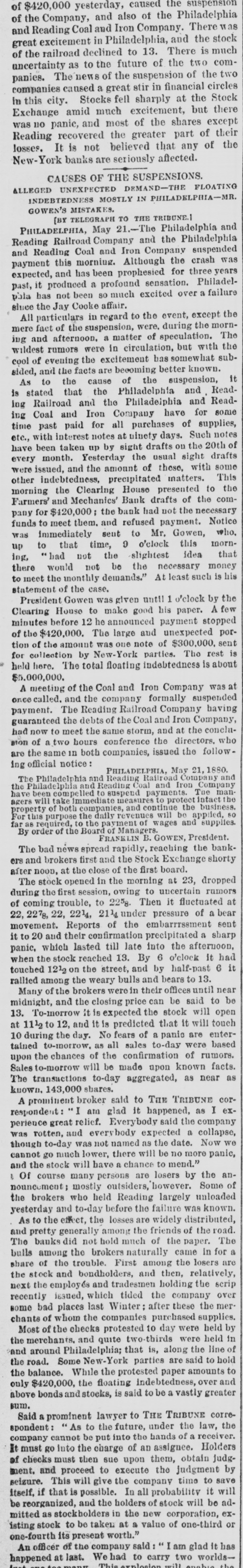 $420,000 yesterday, caused the Philadelphia suspension of Company, and also of the There was of the Coal and Iron Company. stock and Reading excitement in Philadelphia, There and the is much great the railroad declined to 13. two comof as to the future of the the two uncertainty The news of the suspension of circles panies. caused a great stir in financial Stock companies city. Stocks fell sharply at the but there in this amid much excitement, except Exchange panic, and most of the shares of their was no recovered the greater part of the Reading It is not believed that any losses. New-York banks are seriously affected. CAUSES OF THE SUSPENSIONS. FLOATING UNEXPECTED DRMAND-THE PHILADELPIIA-MR. ALLEGED INDEBTEDNESS MOSTLY IN GOWEN'S MISTAKES. TELEGRAPH TO THE TRIBUNE.1 [BX May 21.-The Philadelphia Philadelphia and PHILADELPHIA, Railroad Company and the suspended Reading and Reading this Coal morning. and Iron Although Company the for three crash years was expected, payment and has been prophesied sensation. Philadelpast, phia it has produced not been a so profound much excited over a failure sluce the Jay Cooke affair. the except particulars in regard to the event, the mornAll fact of the suspension, were. of speculation. during The mere ing and afternoon. were a in matter circulation, but with sub- the wildest evening rumors the excitement has somewhat known. it cool of the facts are becoming better suspension, sided, and the cause of the ReadAs to that the Philadelphia and Readis stated Railroad and the Philadeiphia have and for some ing ing Coal and paid Iron for all Company purchases of Such supplies, notes time past interest notes at ninety days. the 20th of etc., with taken up by sight drafts ou sight drafts have been Yesterday the usual with some every issued, month. and the amount of these, matters. This were indebtedness, precipitated presented to the other the Clearing House of the commorning and Mechanics' Bank drafts the necessary Farmers' $420,000 : the bank had not Notice pany for meet them. and refused payment. Gowen, who, funds immediately to seut to Mr. mornwas time, 9 o'clock this that up to had that not the slightest idea money ing, " not be the necessary is his of the case. to there meet would the monthly demands." At least such statement Gowen was given until 1 o'clock by A few the President House to make good his paper. stopped Clearing before 12 he announced payment unexpected porminutes $420,000. The large and $300,000. sent of the amount was one note of The rest is tion of the by New-York parties. is about held for collection here. The total floating indebtedness at $5,000,000. of the Coal and Iron Company suspended was A meeting and the company formally having called. The Reading Railroad Company Company, payment. the debts of the Coal and Iron at the concluguaranteed had now to meet the same conference storm, the and directors. who ing official notice: BION are the of same a two in hours both companies, issued the follow- 1880. PHILADELPHIA, May Company 21, and The Philadelphia and Reading Reading Coal Railroad and Iron Tue Company manthe Philadelphia compelled and to suspend measures payments. to protect intact the agers property of both companies, the revenues of wages will be and supplies. By have For this been will required, purpose take immediate to the payment Managers. and continue the President. applied, so business. far as order of the Board o FRANKLIN B. GOWEN, banknews spread rapidly, reaching Exchange the shorty The bad brokers first and the Stock board. ers and at the close of the first at 23, during after noon, opened in the morning uncertain dropped rumors Then The stock the first session, owing to it fluctuated at of coming 22, trouble, 22 14, to 21 st 2258. under embarrrsement pressure of a bear sent 22, 227g, Reports of the a sharp movement. and their confirmation precipitated the afternoon, the it to lasted till late into it had stock by panic, which reached 13. By 6 o'clock 6 it half-past touched when 1212 on the street, and and bears to 13. rallied among the weary were bulls in their offices until near be Many of the brokers the closing price can be said will to open midnight, and it is expected the stock will touch 13. To-morrow and it is predicted that it enterat 1112 during to the 12, day. No fears sales of to-day a panic were are based 10 to-morrow. as all of rumors. tained chances of the confirmation known facts. upon the will be made upon near as Sales The transactions to-morrow to-day aggregated, as 143,000 shares. known. A prominent broker am glad said it to happened, THE TRIBUNE as company I cor- exrespondent relief. Everybody said the a collapse, perience great and everybody expected date. Now we was rotten, was not named as the more panic, though to-day nuch lower, there will be mend." no cannot go will have a chance to by and the stock persons are losers Some the an- of 1 Of course outsiders, however. unloaded brokers many mostly failure largely nouncement; who held Reading was known. the and to-day before the widely distributed, effect, the losses are of the road. yesterday As to the generally among the friends paper. The a and pretty not hold much of the In for The banks did the brokers naturally came the losers are bulls among trouble. First among relatively, share of the bondholders, and then, the scrip the stock employés and and tradesmen holding company over next the which tided the the merrecently issued, last Winter: after these supplies. some bad of whom places the companies to purchased day were held by chants of the checks protested were held in Most merchants. and quite two-thirds is, along the line of and the around Philadelphia; New-York that parties are said to hold to the road. Some protested paper amounts and the balance. While floating the indebtedness, over above bonds only $420,000, and the stocks, is said to be a vastly greater sum. Said a prominent lawyer future, to THE under TRIBUNE the receiver. law, corre