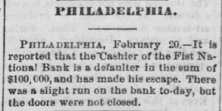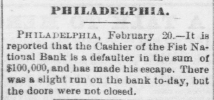 PHILADELPHIA. PHILADELPHIA, February 20.-It is reported that the Cashier of the Fist National Bank is & defaulter in the sum of $100,000, and has made his escape. There was a slight run on the bank to-day, but the doors were not closed.
