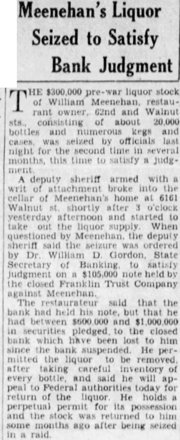 $300,000 liquor stock William restauowner, 62nd and Walnut consisting about bottles kegs and seized night for the time in months, this time satisfy deputy sheriff armed with writ attachment cellar of home 6161 Walnut shortly afternoon and take the liquor When the deputy sheriff seizure Dr William Gordon, State Secretary Banking satisfy judgment $105,000 the closed Franklin Trust Company said that the had and securities pledged the bank which been him since the He after taking inventory every bottle, and said will peal Federal authorities today return holds its the him some months ago being raid.
