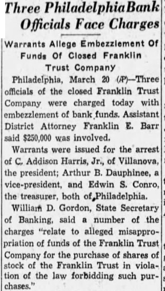 Warrants Allege Embezziement Of Funds Of Closed Franklin Trust Company Philadelphia, March 20 (/P)-Three officials of the closed Franklin Trust Company were charged today with embezzlement of bank funds. Assistant District Attorney Franklin E. Barr