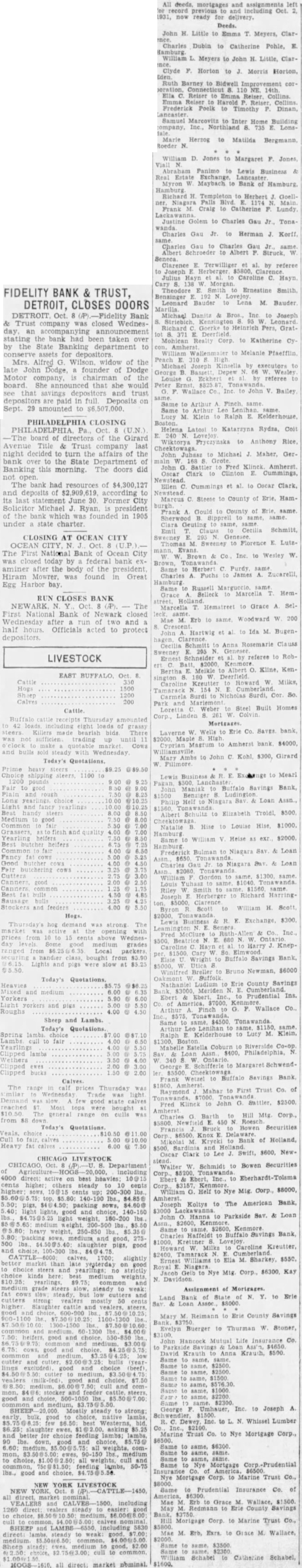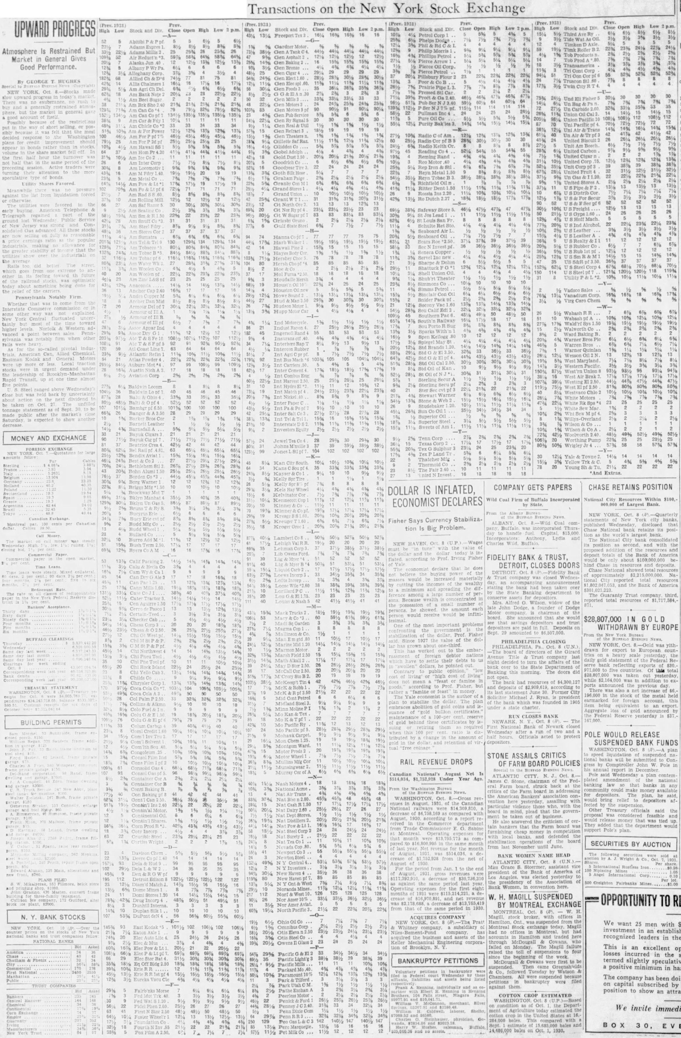 Prev. (Prev. 1931) Prev. (Prev. 1931) Prev. (Prev. 1931) Prev. Open High Low Open High Low High Stock and Div. Close Low Stock and Div. Close Open High Low High Low Stock and Div. Close High Low Stock and Div. Close Open High 16 16 5% 4% 151/4 Third Ry Freeport Tex 161/4 16% Petrol Corp 3% 7% Tide Oil. 52 Phelps Abitibi Phil Rd Timken Adams Expres % Motor 23% Timk Roller 25 26 26 Gen Tank Philip Morris Adams 1% Tob Products 64% 64% Asphalt Phillips Petrol 52 9% Gen 14 Prod 13% 13% 15% 15% Pierce Arrow Alaska 25% 14% Pierce Transamerica Albany Bronze 3% Pierce Petrol Cont Cigar 52% 52% 22% 51 Con Cor 37 201/4 Pillsbury 68 Allied 24% 13% Poor Truscon 14 Gen Prairie Pipe Twin Am 6% Pressed Stl 18 Am Bank 201/4 221/2 .30 46% 30 30 30 Proct 30 33% 75% Und 4% Am Gen Mills 3 64 7% 7% Ser 38 Am 21% 21% 48 Gen Un Bag 139% 103% Gen Motors Pullman Inc Union Gen Service Oil 5% 112 981/4 Union Pacific Purity 14% pf 33 1% 1% Uni Pacific 48% 15% Uni Trans 51% Gen 12% 13% Gen Theaters 10% Radio of Am 12% Air Gillette Radio Cor United Glidden Co Radio Am Bosch. 10% 521/4 54% 55 United Carbon 4.20 Gobel Adolph Reading Gold Reming Rand United 31% 75. 12% 12% Goodrich Motor United Corp Am Corp 30% Am 9% Goodyear Tire Rep 43% Goth Hose Reyn Metal Reyn 38% 9% Gas Graham Am 19 19 Granby Richfield 13 102 Grand Ritter Dent 10 Ins Cor. 8% 8% Grand Union 3½ Mill 25% Grant 42% Dutch 52 Gt Store 301/2 Freight Gt 38% Safeway 26 22% 23% 23% Gt 30% 91/4 12% Hoff 1% 62% San 23% Alcohol. 22 221/4 23% 8% Gulf State Steel 6% Schulte Ret Ind 8% Seaboard Leather 3% 4% Sumatra Hanna Seaboard 12 12 12 12 129% 129% Roe Realty 17% Rubber Co Hawaii 12 12 Hayes Copper 15 14% 14% 103% Hershey 11% Servel 104 Sharpe S&R Shattuck 12% 152% 621/4 Hoe 40 20 22% Hol Furna Shell Union Theater 31 Houdaille 3% Shub'rt 19 23% Simmons Co Anaconda 141/2 Simms Petrol Vadsco 36 131/4 Oil 18 17% 121/4 Vanadium Snider % Hud Virg Caro Chem Dan Socony 60 20 Hudson Motor Armour 28% Edi Armour 3% Hupp Wabash Armour 18 Wabash 4% Ind Motorcycle 1% 17% Wald'rf Appar Ind Indust Walworth Co Assoc Ingersoll B. Ward Baking 4% Warner Pic Interboro Rap Warren 59 64 Rubber Warner Quinlan 23% Atlantic 10% Int 121/4 Wesson Atlas 22% 103% 105 West Oil Auburn 97 Carriers 3% Western Austin Cement 95 30% 31 2% 2% 2% 2% 281/4 Corp Int West Brak Sterling Secur Int Westing 9% Sterling Locom Int Int Match 10% 10% Stewart Int 13% Stone 47% 23 25 25 25 Bambgr Int 26% 66% Bangor 28 10% Superior Oil Int Superior Steel Barnett Interstate Wilson Sweets 4% 5% Investors Wilson 33 Bayuk Cigars 21 49% 49% 521/2 42½ Woolworth 2% 2% 2% MONEY AND EXCHANGE 90 2% Tenn 25 25 711/2 28 20 Worthing Pump 25 24 29% 81 Texas 57% 58 58 57% 57% 80% 50% Wrigley 24 20 FOREIGN EXCHANGE 80% Bel 55% 63 102 Jones NEW Bendix 15% 30 14 14 14 121/4 Yale Towne 22 Thatcher Par 3% Yellow Trk 4% 4% 5% 45 101/4 2% Sterling 22 22 22 22 78 20 Young Sh & Tu. 10 France 43 20% Bohn Alumi 24% Kayser 16 18 18 18 *And Extras. Borden Belgium Germany Borg Warner Holland COMPANY GETS PAPERS CHASE RETAINS POSITION Poland DOLLAR IS INFLATED, Kelvinator Cor 7% Spain 40% 40% 12 Wild Coal Firm of Buffalo Incorporated National City Resources Within $100,Greece ECONOMIST DECLARES by 000,000 of Largest Bank. Argentina 42.44 Bruns Tokyo From the NEW YORK Oct 8 -Quarterly Kresge Fisher Says Currency Stabiliza- statements New York city banks, Canadian Budd ALBANY Coal comMontreal cents 5% Wednesday that Groc 20% 20% tion Is Big Problem. Thurs Chase bank retains its posiday to handle fuel Capital. $15,000 Bullard tion the bank Call Money 10 Lydia and Burro 11% The City Wages Charles NEW ruling Bush Term its as and with the the 69% Byers 17% must the and 17% 7% and the dollar today is Commercial Paper Lib deposit totals of the Bank of America Fisher FIDELITY BANK & TRUST. market 39 according to Irving flated would be only about $100,000 000 be53 14% 50% DETROIT, CLOSES DOORS hind Chase in resources and deposits. Time Co economist declare that he does The Chase National showed total resources Time collateral 16% Bank believe buying the not of approximately $2,215,000,000. Na& Trust was closed Wednesmasses be tional City reported total resources day, an accompanying 38% by the the wealthy and the Bank of America Loose Cann .60 stating the bank had been taken over Rediscount 12% and the dif $301 of by the State Banking to among number per The Trust third, 23 23 23 York Reserve assets for concentrated in 111 41 sons reported total resources of $1,717,584,Mrs. Alfred G. Wilson widow of the the of small number of 871. Bankers' Acceptance late John Dodge, founder of Dodge Thirty persons he the 15% Mack company is of the days person would receive would be infiniboard She she would Ninety days Checker Cab $28,807,000 GOLD tesimal Garden 3% see and trust One of the most important problems are paid in full Deposits on WITHDRAWN BY EUROPE the the Six months Sept. 29 amounted to $6,507,000. dollar, Prof. Fisher From the New York Bureau stabilization the BUFFALO CLEARINGS 1927 the dol- EVENING Since the value PHILADELPHIA CLOSING Thursday 241/4 141/4 NEW YORK Oct -Gold was yithlar PHILADELPHIA, Pa., Oct. (U.N.) Motor This has out to the embar- drawn for export to European coun-The board of directors of the Girard 32% 15% nations of foreign debtor tries on heavy scale yesterday. the Avenue Title & Trust company last their debts to daily gold the Federal Renight decided turn the affairs of the Clearings week ending 2.50. in dollars, pointed out. serve bank reflecting of $30, the of 971,000 five countries Of this total last Contrary opinion Banking this morning. The doors did Bank 51% of cost of $28,807 000 was taken out yesterday, cost or not Childs Corresponding last 42 does "feast or famine while 000 was in addition to ex11% 1031/2 The bank had resources of $4,300,127 but ports announced the day according to previous TREASURY STATEMENT Coca Cola 104 McK and deposits of $2,909,619, There was also a net increase of $6.22 rather "famine in money i