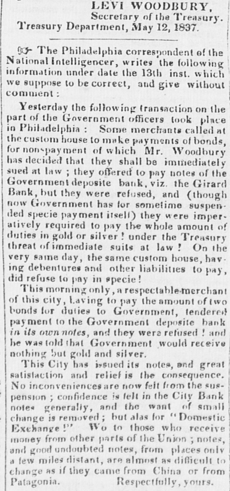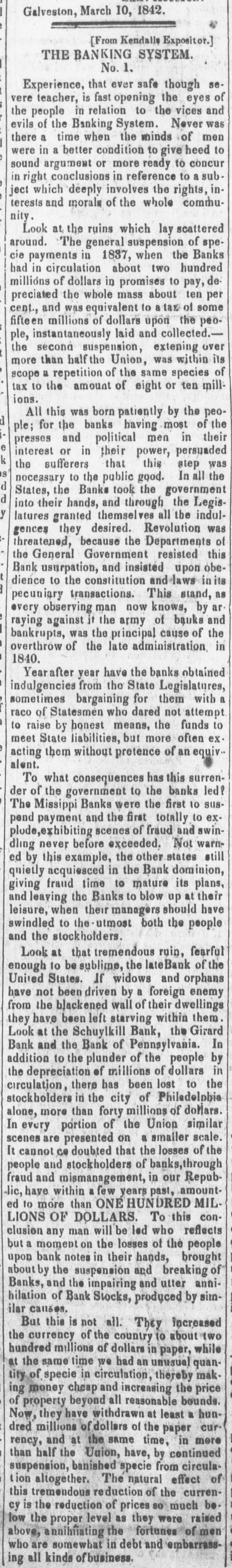 Galveston, March 10, 1842. [From Kendalls Expositor.] THE BANKING SYSTEM. No. 1. Experience, that ever safe though severe teacher, is fast opening the eyes of the people in relation to the vices and evils of the Banking System. Never was there a time when the minds of men were in a better condition to give heed to sound argument or more ready to concur in conclusions in reference to a subright which deeply involves the rights, ject interests and morals of the whole community Look at the ruins which lay scattered specie Banks around. payments The in general 1837, suspension when the of had in circulation about two hundred millions of dollars in promises to pay, de preciated the whole mass about ten per a some fifteen cent., and millions was equivalent of dollars to upon tax the of people, the second over more was its instantaneously than half suspension, the Union, laid and extening collected.- within scope a repetition of the same species of tax to the amount of eight or ten mill ions. All this was born patiently by the people; for the banks having most of the presses and political men in their interest or in their power, persuaded the was to the nocessary sufferers the public that good. this step In all d States, the Banks took the government d into their hands, and through the Legislatures granted themselves all the indulwas of threatened, gences they because desired. the Revolution Departments the General Government resisted this Bank usurpation, and insisted upon obedience to the constitution and laws in its pecuniary transactions. This stand, as every observing man now knows, by ar raying against it the army of banks and bankrupts, was the principal cause of the overthrow of the late administration in 1840. Year after year have the banks obtained sometimes indulgencies bargaining from the State for them Legislatures, with raco of Statesmen who dared not attempt to raise by honest means, the funds to meet State liabilities, but more often ex. acting them without pretence of an equiv. alent. To what consequences has this surrender of the government to the banks led? The were 10 susto exscenes swinplude,exhibiting pend Missippi payment Banks and the first of the fraud totally first and dling never before exceeded. Not warned by this example, the other states still to giving quietly fraud acquiesced time in the mature Bank dominion, its plans, and leaving the Banks to blow up at their leisure, when their managers should have swindled to the utmost both the people and the stockholders. Look at that tremendous ruin, fearful to enough United States. be sublime, If widows the lateBank and orphans of the a from they have have not the blackened been been driven left starving wall by of their foreign within dwellings enemy them. Look at the Schuylkill Bank, the Girard Bank and the Bank of Pennsylvania. In addition to the plunder of the people by the depreciation of millions of dollars in circulation, there has been lost to the more stockholders alone, than in the forty city millions of Philadelphia of dollars. scenes are on a In every portion presented of the Union smaller similar scale. It our people fraud cannot and and ce mismanagement, stockholders doubted that of the in banks,through losses Repub- of the have within a few years past, amounted to more than NE HUNDRED MIL. LIONS OF DOLLARS. To this conclusion any man will be led who reflects a moment on upon notes and of but about by bank the suspension in the their losses hands, of breaking the brought people and utter hilation Banks, and of Bank the impairing anniStocks, produced by similar callses. But this is not all They increased the currency of the to about t of dollars in while at we an unusual hundred the same time millions country had paper, quaning the money specie cheap in circulation, and increasing thereby price makof all reasonable at dred Now, property millions they have beyond of withdrawn dollars least bounds. a hunof the cur rency, at same more than half and the Union, the have, time, by paper continued in circulaof this tion suspension, tremendous altogether. banished reduction The specie natural of from effect cy as raised low is the the proper reduction level of prices they so were the much curren- be above, a annihiating the fortunes of men who are somewhat in debt and embarrassing all kinds of business.