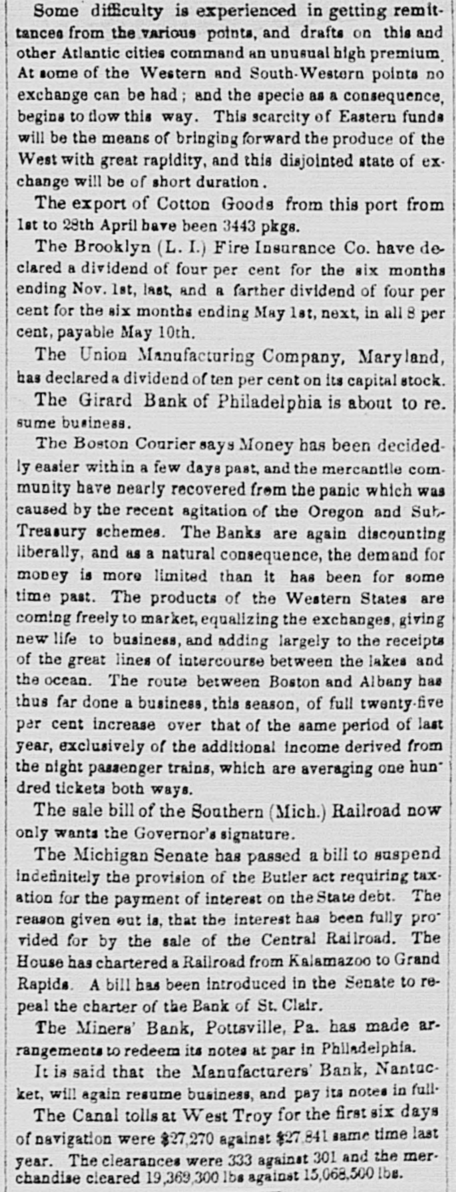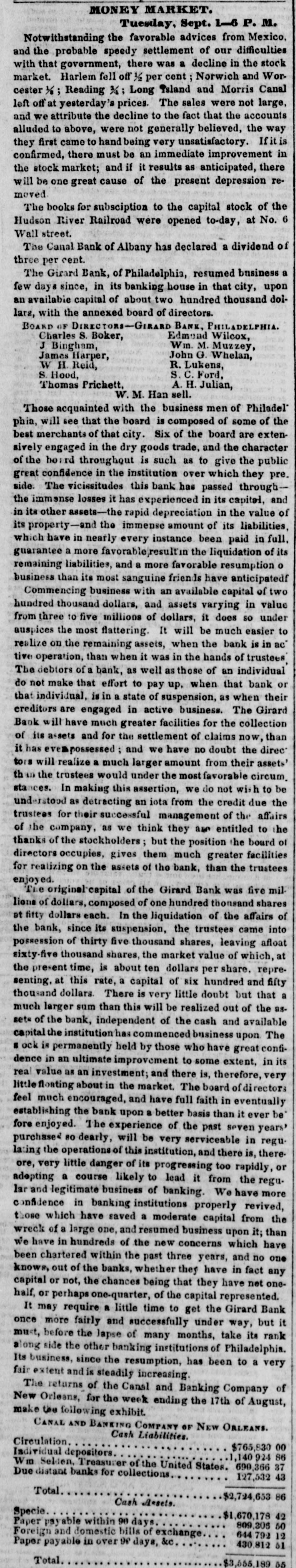 The original capital of the Girard Bank was five millions of dollars, composed of one hundred thousand shares at fitty dollars each. In the liquidation of the affairs of the bank, since its suspension, the trustees came into possession of thirty five thousand shares, leaving afloat sixty-five thousand shares, the market value of which, at the present time, is about ten dollars per share, representing, at this rate, a capital of six hundred and fifty thousand dollars. There is very little doubt but that a much larger sum than this will be realized out of the assets of the bank, independent of the cash and available capital the institution has commenced business upon. The sock is permanently held by those who have great confidence in an ultimate improvement to some extent, in its real value as an investment; and there is, therefore, very little floating about in the market. The board of directors feel much encouraged, and have full faith in eventually establishing the bank upon a better basis than it ever before enjoyed. The experience of the past seven years' purchase so dearly, will be very serviceable in regulating the operations of this institution, and there is, therefore, very little danger of its progressing too rapidly, or adopting a course likely to lead it from the regular and legitimate business of banking. We have more confidence in banking institutions properly revived, those which have saved a moderate capital from the wreck of a large one, and resumed business upon it; than we have in hundreds of the new concerns which have been chartered within the past three years, and no one knows, out of the banks, whether they have in fact any capital or not, the chances being that they have not one-half, or perhaps one-quarter, of the capital represented.