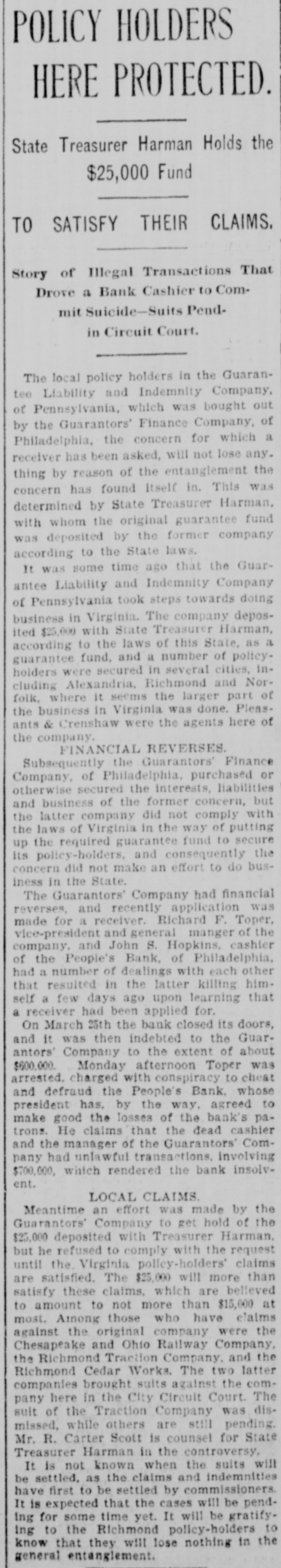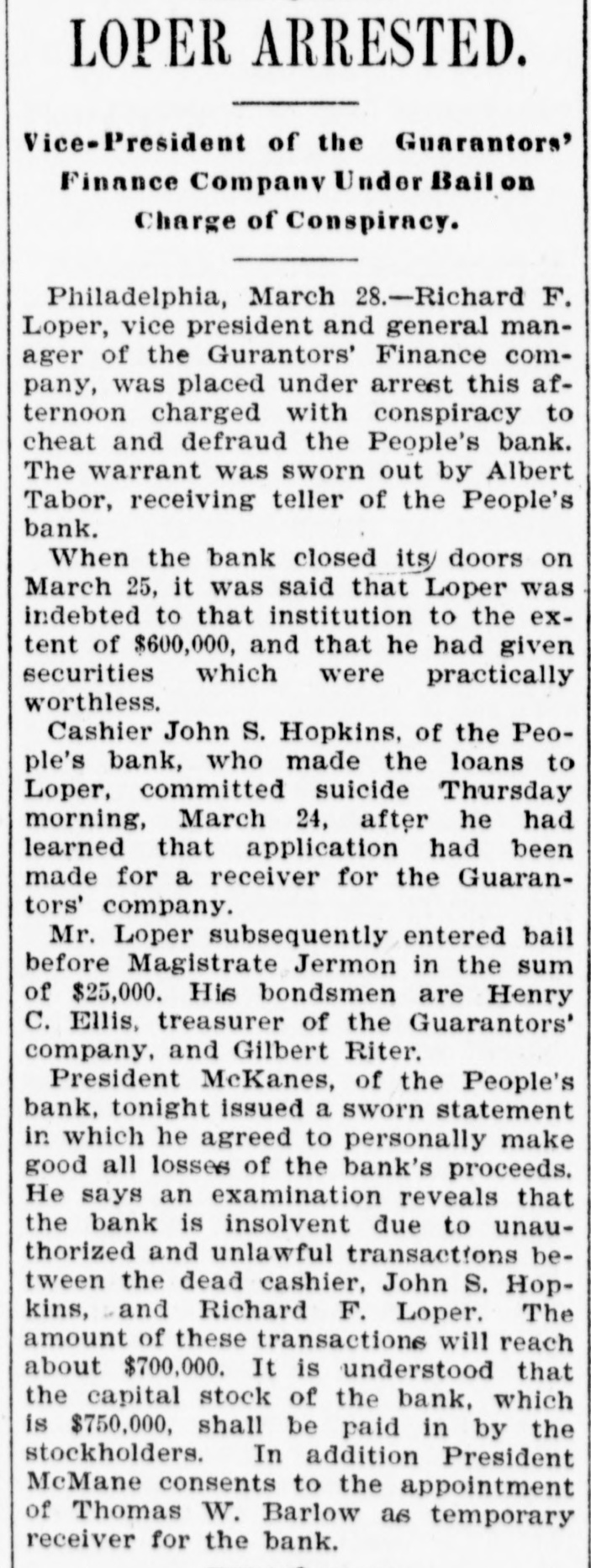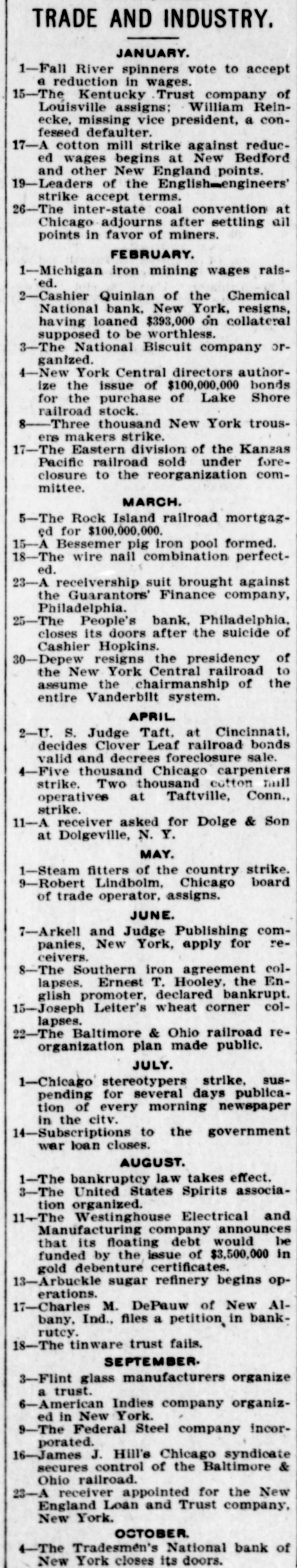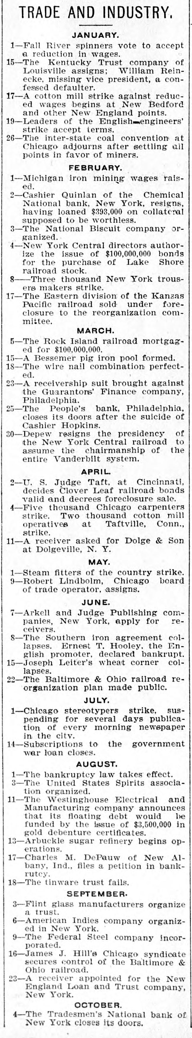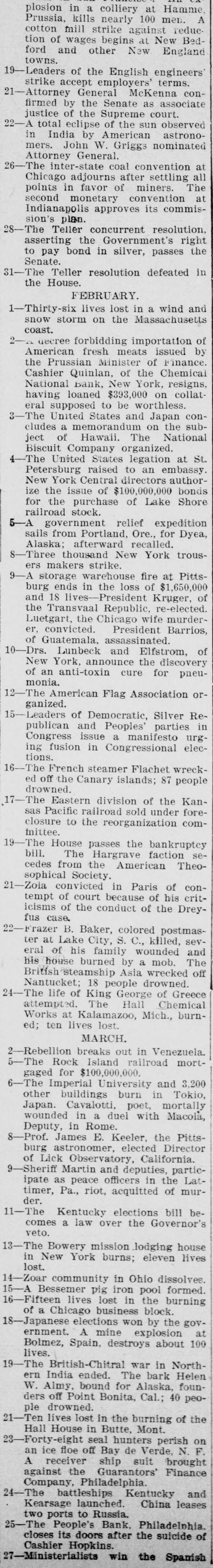 plosion in a colliery at Hamme, Prussia, kills nearly 100 men. A cotton mill strike against reduction of wages begins at New Bedford and other New England towns. 19-Leaders of the English engineers' strike accept employers' terms. 21-Attorney General McKenna confirmed by the Senate as associate justice of the Supreme court. 22-A total eclipse of the sun observed in India by American astronomers. John W. Griggs nominated Attorney General. 26 -The inter-state coal convention at Chicago adjourns after settling all points in favor of miners. The second monetary convention at Indianapolis approves its commission's plan. 28-The Teller concurrent resolution, asserting the Government's right to pay bond in silver, passes the Senate. 31-The Teller resolution defeated in the House. FEBRUARY. 1-Thirty-six lives lost in a wind and snow storm on the Massachusetts coast. 2-4 decree forbidding importation of American fresh meats issued by the Prussian Minister of Finance. Cashier Quinlan, of the Chemical National bank, New York, resigns, having loaned $393,000 on collateral supposed to be worthless. 3-The United States and Japan concludes a memorandum on the subject of Hawaii. The National Biscuit Company organized. 4- -The United States legation at St. Petersburg raised to an embassy. New York Central directors authorize the issue of $100,000,000 bonds for the purchase of Lake Shore railroad stock. 5-A government relief expedition sails from Portland, Ore., for Dyea, Alaska; afterward recalled. 8- -Three thousand New York trousers makers strike. 9-A storage warehouse fire at Pittsburg ends in the loss of $1,650,000 and 18 lives-President Kruger, of the Transvaal Republic, re-elected. Luetgart, the Chicago wife murderer, convicted. President Barrios, of Guatemala, assassinated. 10-Drs. Lunbeck and Elfstrom, of New York, announce the discovery of an anti-toxin cure for pneumonia. 12-The American Flag Association organized. 15-Leaders of Democratic, Silver Republican and Peoples' parties in Congress issue a manifesto urging fusion in Congressional elections. 16--The French steamer Flachet wrecked off the Canary islands; 87 people drowned. 17-The Eastern division of the Kansas Pacific railroad sold under foreclosure to the reorganization committee. 9-The House passes the bankruptcy bill. The Hargrave faction secedes from the American Theosophical Society. 21-Zoia convicted in Paris of contempt of court because of his criticisms of the conduct of the Dreyfus case. 22 -Frazer B. Baker, colored postmaster at Lake City, S. C., killed, several of his family wounded and his house burned by a mob. The British steamship Asia wrecked off Nantucket; 18 people drowned. 24-The life of King George of Greece attempted. The Hall Chemical Works at Kalamazoo, Mich., burned; ten lives lost. MARCH. 2-Rebellion breaks out in Venezuela. 5-The Rock Island railroad mortgaged for $100,000,000. 6-The Imperial University and 3,200 other buildings burn in Tokio, Japan. Cavalotti, poet, mortally wounded in a duel with Macola, Deputy, in Rome. 8-Prof. James E. Keeler, the Pittsburg astronomer, elected Director of Lick Observatory, California. 9 9-Sheriff Martin and deputies, participate as peace officers in the Lattimer, Pa., riot, acquitted of murder. 11-The Kentucky elections bill becomes a law over the Governor's veto. 13-The Bowery mission .lodging house in New York burns; eleven lives lost. 14-Zoar community in Ohio dissolves. 15-A Bessemer pig iron pool formed. 16-Fifteen lives lost in the burning of a Chicago business block. 18-Japanese elections won by the government. A mine explosion at Bolmez, Spain, destroys about 100 lives. 19-The British-Chitral war in Northern India ended. The bark Helen W. Almy, bound for Alaska, founders off Point Bonita, Cal.; 40 people drowned. 21-Ten lives lost in the burning of the Hall House in Butte, Mont. 23-Forty-eight seal hunters perish on an ice floe off Bay de Verde, N. F. A receiver ship suit brought against the Guarantors' Finance Company, Philadelphia. 1-The battleships Kentucky and Kearsage launched. China leases two ports to Russia. 25-The People's Bank. Philadelphia. closes its doors after the suicide of Cashier Hopkins. / 27-Ministerialists win the Spanish