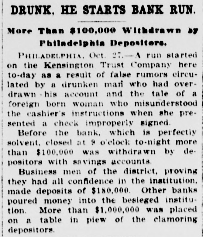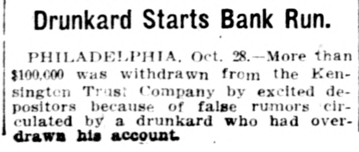 Drunkard Starts Bank Run. PHILADELPHIA, Oct. 28.-More than $100,000 was withdrawn from the Kensingten Trust Company by excited depositors because of false rumors circulated by a drunkard who had overdrawn his account.