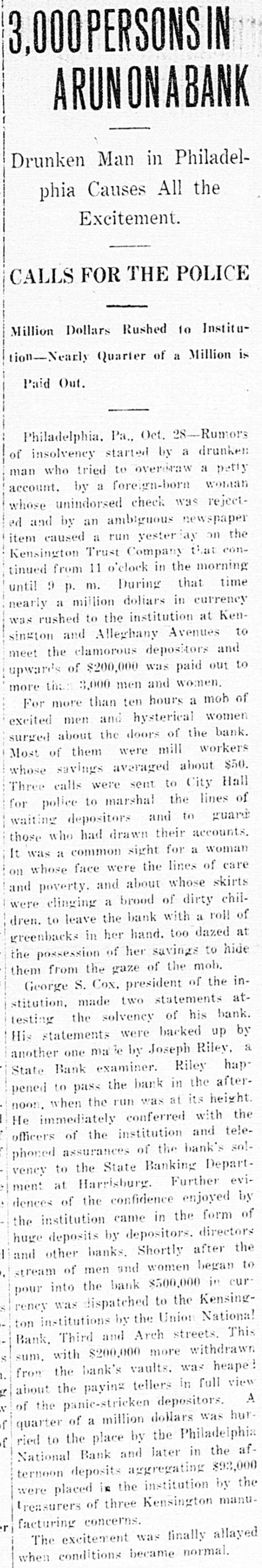 3.000PERSONSIN ARUN ON LABANK Drunken Man in Philadelphia Causes All the Excitement. CALLS FOR THE POLICE Million Dollars Rushed to Institution-Nearly Quarter of a Million is Paid Out. Philadelphia. Pa., Oct. 28-Rumors of insolvency started by a drunken man who tried to overdraw a petty account. by a foreign-born woman whose unindorsed check was rejected and by an ambiguous newspaper item caused a run yesterday on the Kensington Trust Company that continued from 11 o'clock in the morning until 9 p. m. During that time a million dollars in currency to the institution at nearly was rushed Avenues Ken- to sington and Alleghany meet the clamorous depositors and upwards of $200,000 was paid out to more that 3,000 men and women. For more than ten hours a moh of excited men and hysterical women surged about the doors of the bank. Most of them were mill workers whose savings averaged about $50. Three calls were sent to City Hall for police to marshal the lines of and to waiting depositors accounts. guard those who had drawn their It was a common sight for a woman whose face were the lines of care and on poverty. and about whose skirts were clinging a brood of dirty chilto leave the bank with a roll of in her hand. too of her to dren. greenbacks the possession savings dazed hide at them from the gaze of the mob. George S. Cox. president of the institution, made two statements attesting the solvency of his bank. His statements were backed up by another one made by Joseph Riley, a State Bank examiner. Riley hap pened to pass the bank in the afterwhen the run was at its height. the noon. He immediately conferred with officers of the institution and telephoned assurances of the bank's so!vency to the State Banking Depart- eviment at Harrisburg. Further by dences of the confidence enjoyed the institution came in the form of huge deposits by depositors. directors the and other banks. Shortly after stream of men and women began to into the bank $500,000 in cur pour was dispatched to the Kensingrency institutions by the Union National This ton Bank, Third and Arch streets. S with $200,000 more withdrawn . from sum. the bank's vaults. was heape view If about the paying tellers in full A v of the panic-stricken depositors. f of a million dollars was hurf quarter ried to the place by the Philadeiphia af National Bank and later in the ternoon deposits aggregating $93,000 the were placed is the institution by treasurers of three Kensington manur facturing concerns. The excitement was finally allayed when conditions became normal.