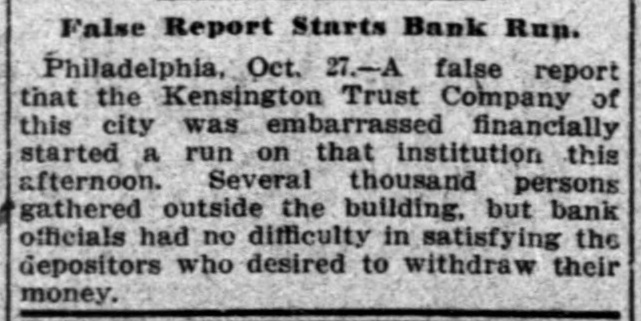 False Report Starts Bank Run. Philadelphia, Oct. 27.-A false report that the Kensington Trust Company of this city was embarrassed financially started a run on that institution this afternoon. Several thousand persons gathered outside the building, but bank officials had no difficulty in satisfying the depositors who desired to withdraw their money.