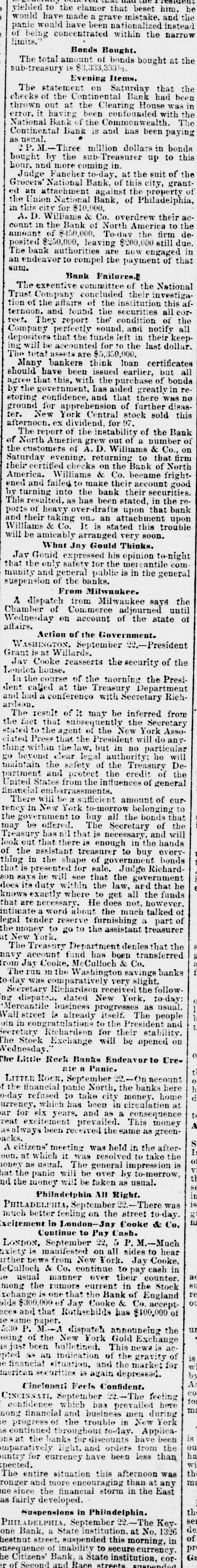 resultion he vielded to the clamor that mistake, beset him. and the would have made been nationalized instead narrow limits. panic of being would concentrated have within the Bonds Bought. $83,333.3 The total amount of bonds bought at the sub-treasury Evening Items. that the statement on Saturday Bank had been The of the Continental House was in thrown checks out at the Clearing confounded with The the error. it having been Commonwealth Continental National Bank Bank if the is and has been paying bonds as usual. Three million dollars in to this P.M by the sub- Treasurer up the bought hour. and more coming in at the suit of Judge National Fancher Bank, to-day. of this the city, property grant of the Union $10,000. ed Grocers' an attachment National Bank, against of Philadelphia, in this city for Co. overdrew their acA. D. Williams Bank & of North America te decount in the $450,000. To-day the still firm due an amount posited $250,000, of leaving are $200,000 now engaged in that sum. The endeavor bank authorities to compel the payment of Bank Failures.E of the National tion The executive committee concluded their investiga this at the found Trust of Company the affairs of the securities institution all corof the reet. ternoon. They and report sound, the condition and their keep- notify all accounted Company depositors perfectly that the funds for left to the in last dollar ing will total be assets are $5,350,000. loan certificates The Many bankers thick issued earlier, but should have this. been with the purchase greatly in of bonds agree the that government, has aided that there was no ter. New storing by confidence. apprehension and of further disas- this 97. for ground for York Central stock sold dividend, Bank afternoch. The report ex of the instability of a of number the of the customers to returning of North America of A. grew D. out Williams & that Co., firm on Saturday evening checks on the Bank of fright- North their certified Williams & Co. became account good America. failed to make their their securities. as that by ened turning and into has the been bank stated, in the bank reThis resulted. ports of heavy over-drafts attachment upon upon will and their taking one It is an stated this trouble Williams amicably & Co. arranged very soon. his -night be What Jay Gould Thinks. opinion Jay Gould safety expressed for the mercantile general com that the only general public is in the munity suspension and of the banks. From Milwaukee. the A diepatch from Milwaukee adjourned says until Wednesday Chamber of on Commerce account of the state of affairs. Action of the Government. September 22.-President Grant is at reasserts the security Jav WASHING Cooke Willards. of the London of the morning In the called house. course at the Treasury Secretary Department the Presi- Richdent and had a conference with ardson. result of it may be inferred Secretary from The that New the York Assostated the fact to the agent the of President the will do any ciated within Press that the law. but authority; in no particular he will the maintain the credit go thing beyond clear safety legal of the Treasury of De- the partment States and from protect the influences of general curfinancial United abarrassments. amount of will be a sufficient belonging to rency There in New York to to-morrow buy all the bonds of that the the go vernment offered The Secretary and will may be all that is necessary, hands Treasury out that has there is enough to in buy the every in the thing for sale. Judge of look the assistant shape treasurer of governmet Richard- bonds that is presented he will see that law, the government ard that he son does says its exactly duty within where the to get not, all the however, funds knows necessary He does talked that are word about the much part of the money intimate a reserve furnishing a treasurer at legal tender to go to the assistant New York. Department denies that the The Treasury fund has been transferred banks navy from Jay account Cooke, Mo Washington Culloch & savings Co. The run on comparatively the very slight. o-day was Richardson received the follow Secretary dispatch dated New York, as to-day usual ng Mercantile business progresses itself. The people Wall street is atulations already to the President stability. and oin in conj for their The cretary Stock Richardson Exchange will be opened on Wednesday Rock Banks Endeavor to CreThe Little ate a Panic. panic LITTLE Rock. September North, 22 the On banks account here f o-day the financial refused to take city money, circulation home at currency, which has and been as in a consequence ar for six years. prevailed. This money reat asalways excitement been received the same as greenacks. citizens' meeting was held in to the take after- the A which it was resolved impression is onn. at usual. The general to-morrow, honey as panic will be over by usual. nd hat the the money will be taken as Philadeiphia All Right. September There to-day. was III PHILADELPHIA, better feeling on the street & Co. much excitement in London- Jay Cooke Continue to Pay 22, Cash. 5 M.-Much LONDON. manifested September on all sides to Cooke, hear ixiety is from New York. Jay cash in rther eCulloch news & Co. continue over their to pay counter. to usual the manner rumors current in the England Stock mong one that the Bank of of rehange of Jay Cooke & Co. accept nces and that olde $300,000 Rathschilds has $100,000 of un same paper. M.-A dispatch announcing the 5:30 P. of the New York Gold Exchange 18 acosing been bulletined. This news is s just an indication of the gravity for of pted as situation. and the market merican e financial securities 18 again depressed. Cincinnati Feels Confident. 2.-The feeling for ma men CINCINNATI, confidence September which has prevaile during here mong financial and the trouble business in New York is e continued progress, of throughout to-day. have Applica- been ou the banks for discounts from the ha ons at light. and orders less than i