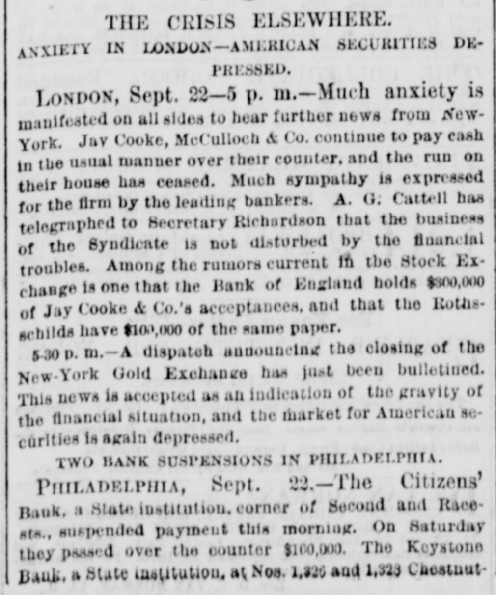 THE CRISIS ELSEWHERE. ANXIETY IN LONDON-AMERICAN SECURITIES DEPRESSED. LONDON, Sept. 22-5 p. m.-Much anxiety is manifested on all sides to hear further news from NewYork. Jay Cooke, McCulloch & Co. continue to pay cash in the usual manner over their counter, and the run on their house has ceased. Much sympathy is expressed for the firm by the leading bankers. A. G: Cattell has telegraphed to Secretary Richardson that the business of the Syndicate is not distorbed by the financial troubles. Among the rumors current in the Stock Exchange is one that the Bank of England holds $800,000 of Jay Cooke & Co.'s acceptances. and that the Rothsschilds have $100,000 of the same paper. 5-30 p. m.-A dispatch announcing the closing of the New-York Gold Exchange has just been bulletined. This news is accepted as an indication of the gravity of the financial situation, and the market for American securities is again depressed. TWO BANK SUSPENSIONS IN PHILADELPHIA. PHILADELPHIA, Sept. 22.-The NN. Citizens' Bauk, a State institution. corner of Second and Racests., suspended payment this morning. On Saturday they passed over the counter $100,000. The Keystone Bank, a State institution. at Nos. 1,826 and 1,328 Chestnut-