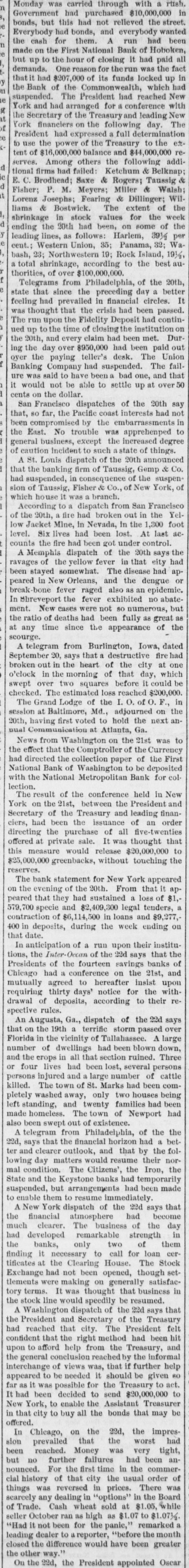 Monday was carried through with a ritsh Government had purchased $10,000,000 in bonds, but this had not relieved the street. Everybody had bonds, and everybody wanted the cash for them. A run had been made on the First National Bank of Hoboken, but up to the hour of closing it had paid all demands. One reason for therun was the fact that it had $207,0 of its funds locked up in the Bank of the Commonwealth, which had suspended. The President had reached New York and had arranged for conference with the Secretary of the Treasury and leading New York financiers on the following day. The President had expressed full determination to use the power of the Treasury to the etc. tent of $16,000,000 balance and $44,000,000 reserves. Among others the following addid tional firms had failed Ketchum & Belknap E. C. Brodhead; Saxe & Rogers; Taussig & Fisher; P. M. Meyers; Miller & Walsh Lorenz Josephs; Fearing & Dillinger; Wil liams & Bostwick. The extent of the shrinkage in stock values for the week ending the 20th had been, on some of the leading lines, as follows: Harlem, 393 per cent.; Western Union, 35; Panama, 32: Wa bash, 23; Northwestern 19: Rock Island, 191/2 total shrinkage, according to the best authorities, of over $100,000,000. Telegrams from Philadelphia, of the 20th, state that since the preceding day a better feeling had prevailed in financial circles. It was thought that the crisis had been passed. The run upon the Fidelity Deposit had continued up to the time of closing the institution on the 20th, and every claim had been met. Dur ing the day over $950,000 had been paid out over the paying teller's desk. The Union Banking Company had suspended. The failure was said to have been bad one, and that it would not be able to settle up at over 50 cents on the dollar. San Francisco dispatches of the 20th say that, so far, the Pacific coast interests had not been compromised by the embarrassments in the East. No trouble was apprehenped to general business, except the increased degree of caution Incident to such state of things. A St. Louis dispatch of the 20th announced that the banking firm of Taussig, Gemp & Co. had suspended, in consequence of the suspension of Taussig, Fisher & Co. of New York, of which house it was branch. According to a dispatch from San Francisco of the 20th, fire had broken out in the Yellow Jacket Mine, In Nevada, In the 1,300 foot level. Six lives had been lost. At last accounts the fire had been got under control. A Memphis dispateh of the 20th says the ravages of the yellow fever in that city had been stayed somewhat. The disease had ap peared in New Orleans, and the dengue or break bone fever raged also as an epidemic, In Shreveport the fever exhibited no abate ment. New cases were not so numerous, but the ratio of deaths had been fully as great as at any time since the appearance of the scourge. A telegram from Burlington, Iowa, dated September 20, says that a destructive fire had broken out in the heart of the city at one o'clock in the morning of that day, which swept over two squares before it could be checked. The estimated loss reached $200,000. The Grand Lodge of the I. O. of O.F., in session at Baltimore, Md., adjourned on the 20th, having first voted to hold the next annual Communication at Atlanta, Ga. to News from Washington on the 21st was the effect that the Comptroller of the Currency had directed the collection paper of the First National Bank of Washington to be deposited with the National Metropolitan Bank for collection. The result of the conference held in New York on the 21st, between the President and Secretary of the Treasury and leading financiers, had been the issuance of an order directing the purchase of all five-twenties offered at private sale. It was thought that this measure would release $20,000,000 to $25,000,000 greenbacks, without touching the reserves. The bank statement for New York appeared on the evening of the 20th. From that it appeared that they had sustained loss of $1,579,700 specie and $2,409,300 legal tenders, contraction of $6,114,500 in loans and $9,277, 400 in deposits, during the week ending on that date. In anticipation of a run upon their institutions, the Inter-Occan of the 22d says that the Presidents of the fourteen savings banks of Chicago had conference on the 21st, and mutually agreed to hereafter insist upon requiring thirty days' notice for the with drawal of deposits, according to their respective rules. An Augusta, Ga., dispatch of the 22d says that on the 19th a terrific storm passed over Florida in the vicinity of Tallahassee. A large number of dwellings had been blown down, and the crops in all that section ruined. Three or four lives had been lost, several persons persons injured and large number of cattle killed. The town of St. Marks had been completely washed away, only two houses being left standing, and twenty families had been made homeless. The town of Newport had also been swept out of existence. A telegram from Philadelphia, of the the 22d, says that the financial horizon had better and clearer outlook, and that by the following day matters would resume their normal condition. The Citizens', the Iron, the State and the Keystone banks had temporarily suspended, but arrangements had been made to enable them to resume immediately. A New York dispatch of the 22d says that the financial atmosphere had become much clearer. The business of the day had developed remarkable strength in the banks, only two of them finding it necessary to call for loan certificates at the Clearing House. The Stock Exchange had not been opened, though set tlements were making on generally satisfacin tory terms. It was thought that business the stock line would speedily be resumed. A Washington dispatch of the 22d says that the President and Secretary of the Treasury had reached that city. The President felt confident that the right method had been hit upon to afford help from the Treasury, and the general conclusion r
