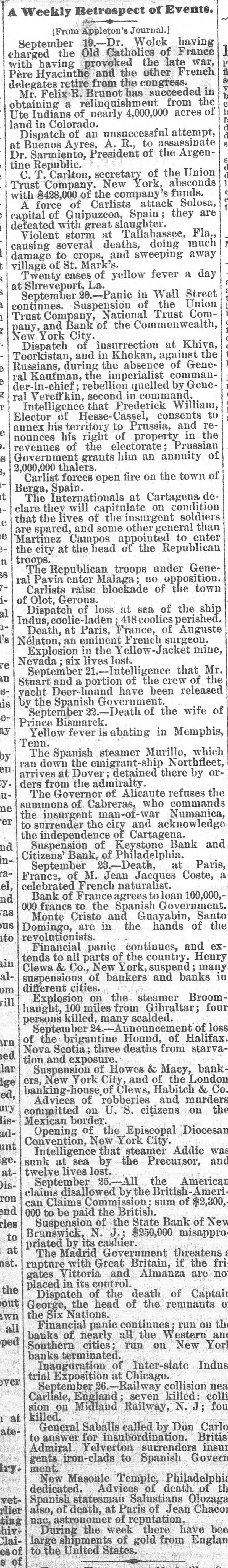 A Weekly Retrospect of Events. Appleton's Journal.] having September [From Old 19.-Dr. Catholics Wolck of late France war, charged having the provoked the the other French in with Pere Hyacinthe from and the congress. succeeded delegates retire R. Brunot has from the Ute Indians of obtaining Mr. Felix a relinquishment nearly 4,000,000 acres of Colorado. an unsuccessful attempt, at Sarmiento, Dispatch Buenos-Ave President of A. R., to of the ArgenDr. tine C.T Republic. Carlton, secretary New York of the absconds funds. Union Trust Company of the company's attack Solosa, with force $428,000 of Carlists Spain; they are A of Guipuzcoa slaughter. deteated capital with great Tallahassee, much Fla Violent storm at deaths, doing away causing to several crops, and sweeping day Twenty cases village damage of St. Mark's of yellow fever a at Shreveport, La. -Panic in Wall the Street Union September Suspension of Trust ComTrust continues. and Company, Bank of Natio Commonwealth the Khiva, pany, New York City. insurrection against at the Dispatch and in of Geneduring the comman- GeneRussians, the by Toorkistan, ral Kaufman, of rebellion imperialist Khokan, absence quelled command. der-in-chief; ral Vereffkin, second that Frederick in consents William, to e of territory to in . his right electorate nounces Elector annex Intelligence his Hesse- Cassel, of Prussia, annuity and the re- of revenues of grants the him an 3, of Carlist t 8 2,000,000 Government thalers. forces open fire on the town deBerga, Internationals at Cartagena on condition clare The they will of capitulate the insurgent soldiers than - that the lives and some other general to enter :Martinez are spared, Campos the head appointeR of the troops. Republican troops no . n e e the city at under opposition. Gene- town Carlists raise 38 ral The Pavia enter Malaga blockade of the the ship of Olot, Gerona. of loss at sea coolies of perished. 's al i- Indus.coolie-lader Dispatch France, of surgeon. Auguste in Nelaton, Death, an at eminent Paris, the ellow-Jacket French mine, SExplosion six lives 21.-If Intelligence lost. of the crew that of Mr. and a portion have been ye n Nevada; Stuart September released the of September vacht by the -Death the wife ay e- is Prince Yellow Bismarck. fever is abating in Memphis, which by en Tenn. Spanish steamer Murillo, Northfleet, ory ran The down the Dover; emigrant-ship detained there by une ders arrives at from the admiralty. Alicante refuses commands the The Governor of who Numanica, er summons insurgent of Cabreras, man-of-war city and acknowledge the surrender the Cartagena nd inthe to independence of of Keystone Bank and Suspension Bank, of Philadelphia. at a September M. Jean Jacques el, nd France, French to loan as Citizens' celebrated of 23. Death, naturalist. Government. Coste, 100,000, Paris, a Bank of France agrees the Spanish Santo us in are to 000 Monte francs Cristo to and the Guayabin, hands of the in revolutionistanic Domingo, continues, and Henry exalFinancial parts of the country suspend; many in om will suspensions Clews tends to & all Co., of New bankers York, and banks Broom different cities. the steamer four Explosion miles on from Gibraltar; haught,100 killed, many scalded. of loss arn ed persons September 24. brigantine Hound, deaths from of starvalar and exposure. & Ige Suspension City, and Habitch & ed, tion Nova of the New Scotia; York three of Howes Clews, of Macy, the murders London bank Co. ury ers, banking-h of robberies and on the lisAdvices of on U. S. citizens adunt Mexican committed border of the Episcopal City. Diocesan was Ige. Opening New York steamer Addie and atConvention, Intelligence that by the Precursor, issunk twelve lives at sea lost. 25.-All the American Ameri rou disallowed by sum of end Claims British. claims September Commission: the British $2,300, of New rles to Brunswick its cashier. 000 can Suspension to be paid N. of the J.; the State $250,000 Bank misapproat nst. if the The with Great Almanza are the priated ruptivitio Madrid by Government and Britain, threatens Captain fri no out wn placed gates Dispatch in its of control. the of death the remnants of of George, Nations. the head the on all the Six panic continues Western run an ped banks Financial of nearly cities; all run the on New York Chicago. banks Southeterminated of Inter-state Indus ever 26.- Railway killed: trial Inauguration September at seven collision colli nea fou at Carlisle, Midland England Railway, N. J; atesion killed. on called by Don Britis Carlo General for Saballabordination surrenders insur Iry. to Admiral answer Yelverton to Spanish Govern gents iron-clads Philadelphia ment. Masonic Temple, of death of th vetrlier alustians of Jean Chacon ting hivalso, Spanish of death, at of reputation. have Clainac, dedicatestatesman.Sa astronomeweek Advices there Olozaga Englan bee es of During shipments the of gold from large to the United States,