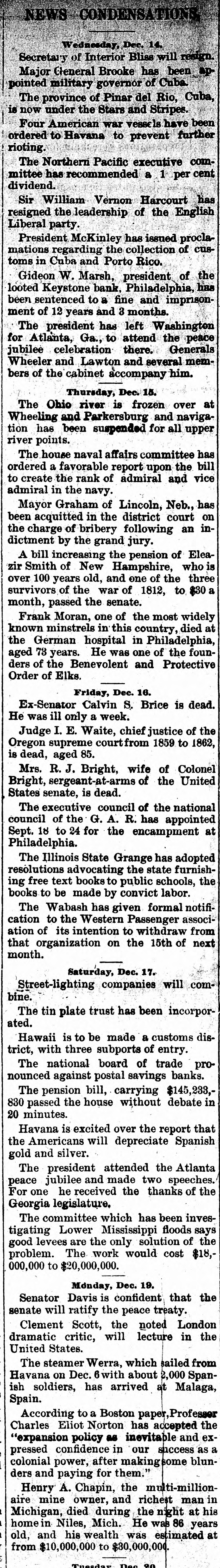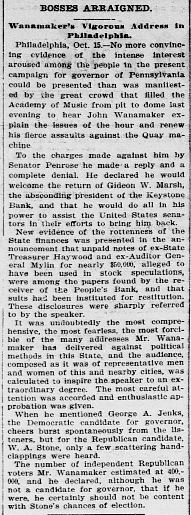 BOSSES ARRAIGNED. Wanamaker's Vigorous Address in Philadelphia. Philadelphia, Oct. 15.-No more convincing evidence of the intense interest aroused among the people in the present campaign for governor of Pennsylvania could be presented than was maniiested by the great crowd that filled the Academy of Music from pit to dome last evening to hear John Wanamaker explain the issues of the hour and renew his fierce assaults against the Quay machine To the charges made against him by Senator Penrose he made a reply and a complete denial. He declared he would welcome the return of Gideon W. Marsh, the absconding president of the Keystone Bank, and that he would do all in his power to assist the United States senators in their efforts to bring him back. New evidence of the rottenness of the State finances was presented in the announcement that unpaid notes of ex-State Treasurer Haywood and ex-Auditor General Mylin for nearly $50,000, alleged to have been used in stock speculations, were among the papers found by the receiver of the People's Bank, and that suits had been instituted for restitution. These disclosures were sharply referred to by the speaker. It was undoubtedly the most comprehensive, the most fearless, the most forcible of the many addresses Mr. Wanamaker has delivered against political methods in this State, and the audience, composed as it was of representative men and women of this and nearby cities, was calculated to inspire the speaker to an extraordinary degree. The most careful attention was accorded and enthusiastic approbation was given. When he mentioned George A. Jenks, the Democratic candidate for governor, cheers burst spontaneously from the listeners, but for the Republican candidate, W. A. Stone, only a few scattering handclappings were heard. The number of independent Republican voters Mr. Wanamaker estimated at 400,000. and he declared, although he was not a candidate for governor, that if he were, he certainly should not be content with Stone's chances of election.