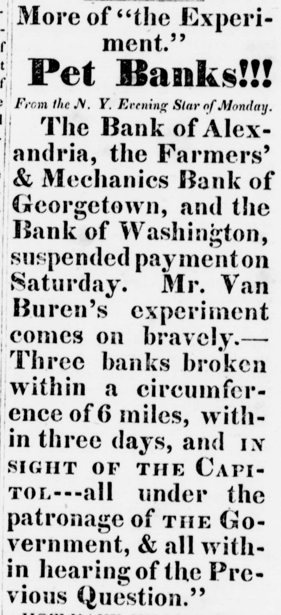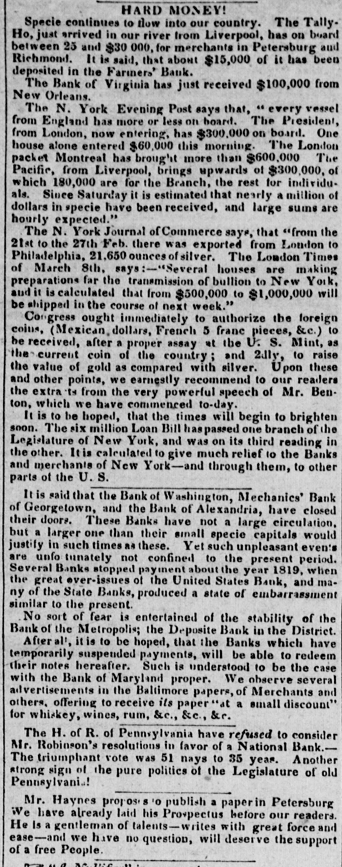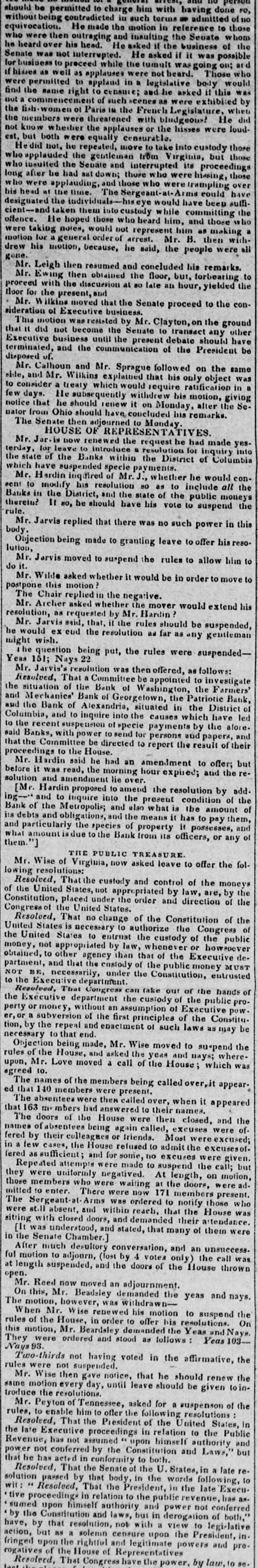 KenuraT arrest, and no person should be permitted to charge him with having done FO, without being contradicted in such terms - admitted of equivocation. He made the motion in reference to those who were then outraging and insuling the Senate whom he heard over his head. He asked it the business of the Senate was not interrupted. He asked if it was possible for business to proceed while the tumult rasgoing on; and if hisses as well as applauses were not heard. Those who were permitted to applaud in a legislative body would find the same right to censure; and he asked it this was not a commencement of such scenes as were exhibited by the fish women of Paris in the French Legislature, when the members were threatened with bludgeous? He did not know whether the applauses or the hisses were loudest, but both ere equally censurable. Hedid not, he repeated, move to take into custody those who applauded the gentleman from Virginia, but those n who insulted the Senate and interrupted its proceedings long after be had sat down; those who were hissing, those who were applauding, and those W ho were trampling over his head at the time The Sergeant-al-Arms could have designated the individuals-Inseye would have been sufficient-and taken them into custody while committing the offence. He hoped those who heard him, and those " ho were taking notes, would not represent him as making a motion for general order of arrest. Mr. B. then withdrew his motion, because, he said, the people were all gone. Mr. Leigh then resumed and concluded his remarks Mr. Ewing then obtained the floor, but, forbeating to proceed with the discussion at so late an hour, yielded the floor for the present, and Mr. ilkins moved that the Senate proceed to the consideration of Executive business. This motion was resisted by Mr. Clayton, on the ground that it did not become the Senate to transact any other Executive business until the present debate should have terminated, and the communication of the President be disposed of. Mr. Calhoun and Mr. Sprague followed on the same side, and Mr. Wilkins explained that his only object was to consider a treaty which would require ratification in few He days. withdrew subsequently his motion, giving notice that he should renew it on Monday, alter the Se. nator from Ohio should have concluded his remarks. The Senate then adjourned to Monday. HOUSE OF REPRESENTATIVES Mr. Jar.is now renewed the request he had made yes. terday, for leave to introduce a resulution for inquiry into the state of the Banks within the District of Columbia which have suspended specie payments. Mr. H ardin inquired of Mr. J., whether he would consent to modify his resolution so as to include all the Banks in the District, and the state of the public moneys therein? It 80, he should have his vote to suspend the rule. Mr. Jarvis replied that there was no such power in this body Objection being made to granting leave to offer hisreso. lution, Mr. Jarvis moved to suspend the rules to allow him to it. do Mr. Wilde asked whether it would be in order to move to postpone this motion ? The Chair replied in the negative. Mr. Archer asked whether the mover would extend his resolution, as requested by Mr. Hardin Mr. Jarvis said, that, it the rules should be suspended, he would ex end the resolution as far as any gentleman might wish. he question being put, the rules were suspendedYeas 151; Nays 22 Mr. Jarvis's resolution was then offered, as follows: Resolved, That a Committee be appointed to investigate the situation of the Bank of Washington, the Farmers' and Mechanies' Bank of Georgetown, the Patriotic Bank, and the Bank of Alexandria, situaled in the District of Columbia, and to inquire into the causes which have led said to the recent suspension of specie payments by the afore. Banks, h power send for persons and papers, and that the Committee be directed to report the result of their proceedings to the House. Mr. Hardin said he had an amendment to offer; but before it was read, the morning hour expired; and the resolution and amendment lie over. [Mr. Hardin proposed to amend the resolution by add. ing- and to inquire into the present condition of the Bank of the Metropolis; and also what is the amount of debts and obligations, and the means it has to pay them, and particularly the species of property it possesses, what amount to the its officers, or any and of them."] Mr. Wise of THE Virginia, PUBLIC now asked TREASURE. leave to offer the following resolutions: Resolved, the That the custody and control of the of United States, not appropriated by law, are, moneys the Constitution, placed under the order and direction by of the Congress of the United States. United Resolved. That no change of the Constitution of the the United States is necessary to authorize the Congress of States to entrust the custody of the money, not appropriated by law, whenever or public obtained, to other agency than that of the Executive howsoever partment, and that the custody of the public money deto NOT BE, necessarily, under the Constitution, entrusted MUST the Executive department. Resolved, That Congress can take our of the hands the Executive department the custody of the public of perty or money, without an assumption of Executive proer,or a subversion of the first principles of the Constitu- pow. tion, by the repeal and enactment of such laws as may be necessary to that end. Objection being made, Mr. Wise moved to suspend the rules of the House, and asked the year and pays; whereupon, Mr. Love moved a call of the House; which was agreed 10. ed The that names 140 members of the members were present. being called over it appearthat The 163 absentees were then called over, when it appeared m mbers had answered to their names. The of doors of the House were then closed, and fered names absentees being again called, excuses the in by their colleagnes or friends. Most were offered few cases, the House refused to admit the excused; susficient and for