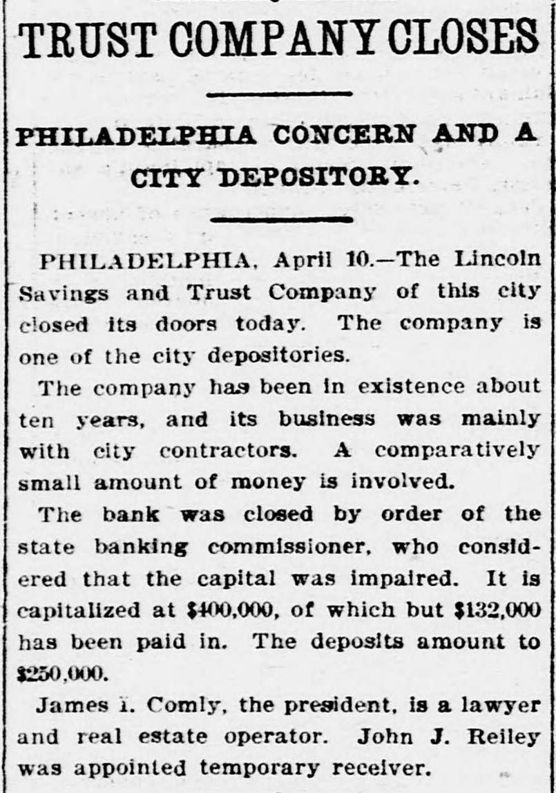 TRUST COMPANY CLOSES PHILADELPHIA CONCERN AND A CITY DEPOSITORY. PHILADELPHIA, April 10.-The Lincoln Savings and Trust Company of this city closed its doors today. The company is one of the city depositories. The company has been in existence about ten years, and its business was mainly with city contractors. A comparatively small amount of money is involved. The bank was closed by order of the state banking commissioner, who considered that the capital was impaired. It is capitalized at $400,000, of which but $132,000 has been paid in. The deposits amount to $250,000. James 1. Comly, the president, is a lawyer and real estate operator. John J. Reiley was appointed temporary receiver.