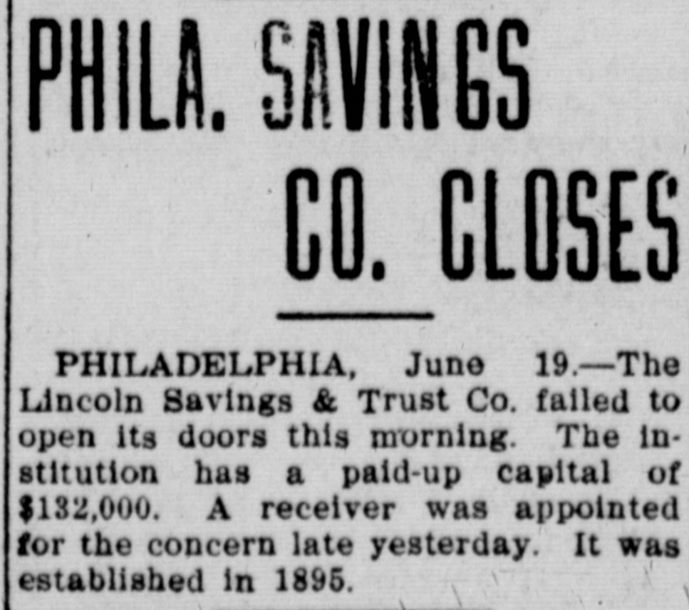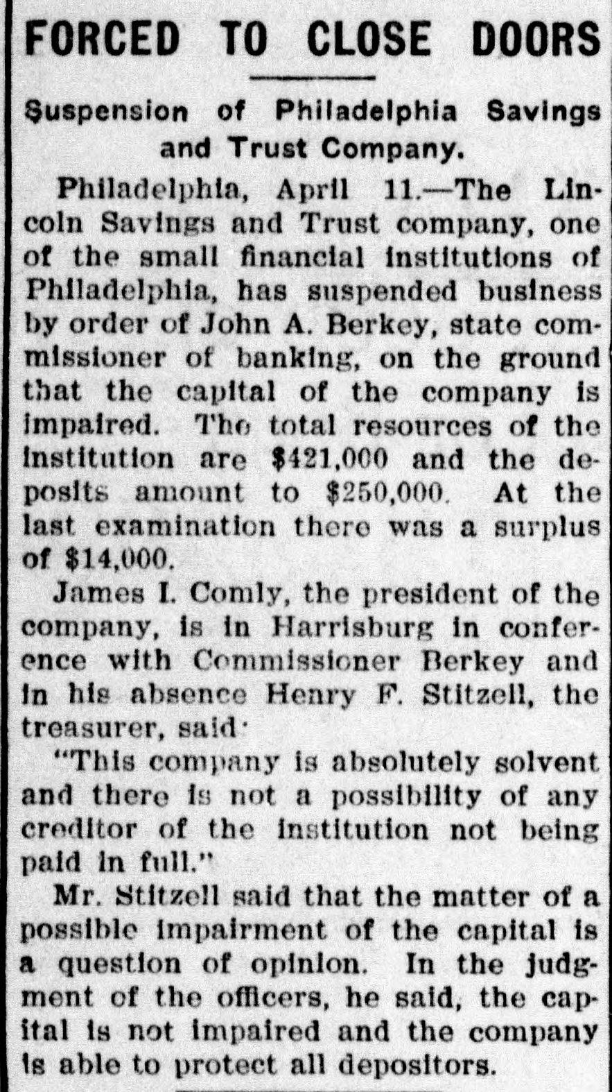 FORCED TO CLOSE DOORS Suspension of Philadelphia Savings and Trust Company. Philadelphia, April 11.-The Lincoln Savings and Trust company, one of the small financial institutions of Philadelphia, has suspended business by order of John A. Berkey, state commissioner of banking, on the ground that the capital of the company is impaired. The total resources of the Institution are $421,000 and the deposits amount to $250,000. At the last examination there was a surplus of $14,000. James I. Comly, the president of the company, is in Harrisburg in conference with Commissioner Berkey and in his absence Henry F. Stitzell, the treasurer, said: "This company is absolutely solvent and there is not a possibility of any creditor of the institution not being paid in full." Mr. Stitzell said that the matter of a possible impairment of the capital is a question of opinion. In the judgment of the officers, he said, the capital is not impaired and the company is able to protect all depositors.