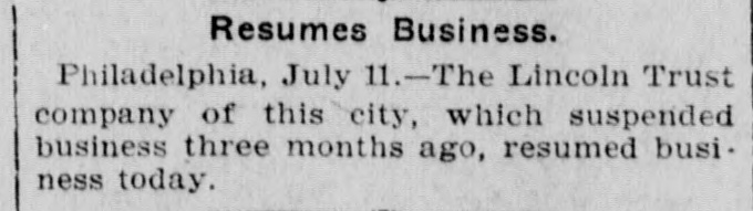 Resumes Business. Philadelphia, July 11.-The Lincoln Trust company of this city, which suspended business three months ago, resumed busi. ness today.