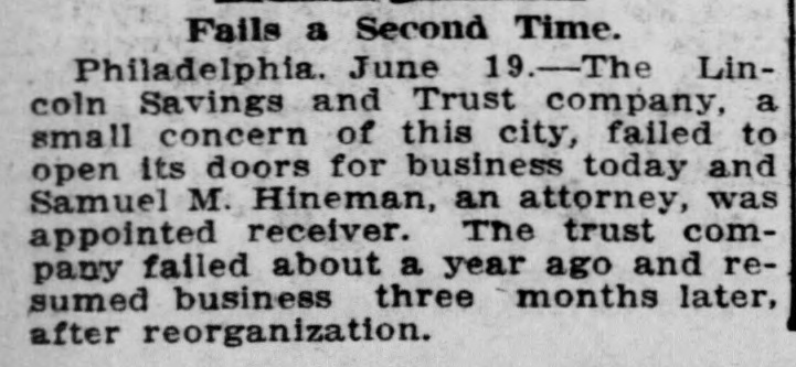Fails a Second Time. Philadelphia. June 19.-The Lincoln Savings and Trust company, a small concern of this city, failed to open its doors for business today and Samuel M. Hineman, an attorney, was appointed receiver. The trust company failed about a year ago and resumed business three months later, after reorganization.