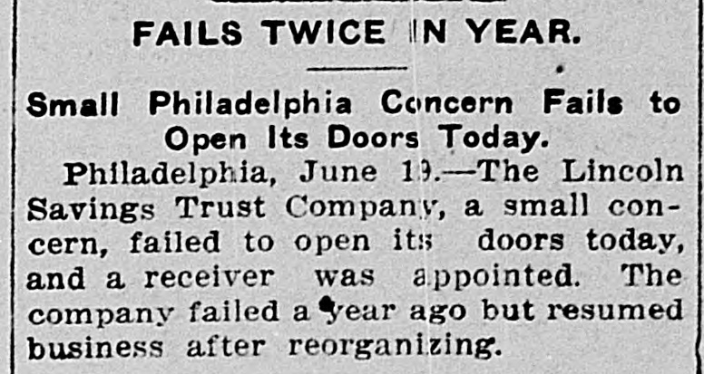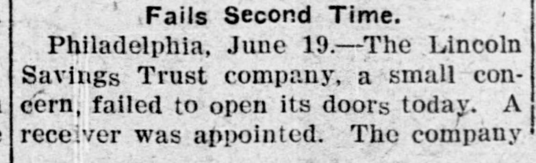 FAILS TWICE IN YEAR. Small Philadelphia Concern Fails to Open Its Doors Today. Philadelphia, June 19.-The Lincoln Savings Trust Company, a small concern, failed to open its doors today, and a receiver was appointed. The company failed a year ago but resumed business after reorganizing.