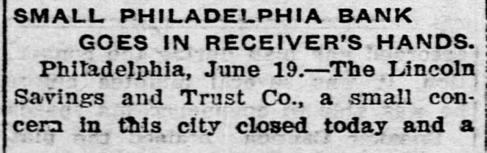 SMALL PHILADELPHIA BANK GOES IN RECEIVER'S HANDS. Philadelphia, June 19.-The Lincoln Savings and Trust Co., a small concern in this city closed today and a