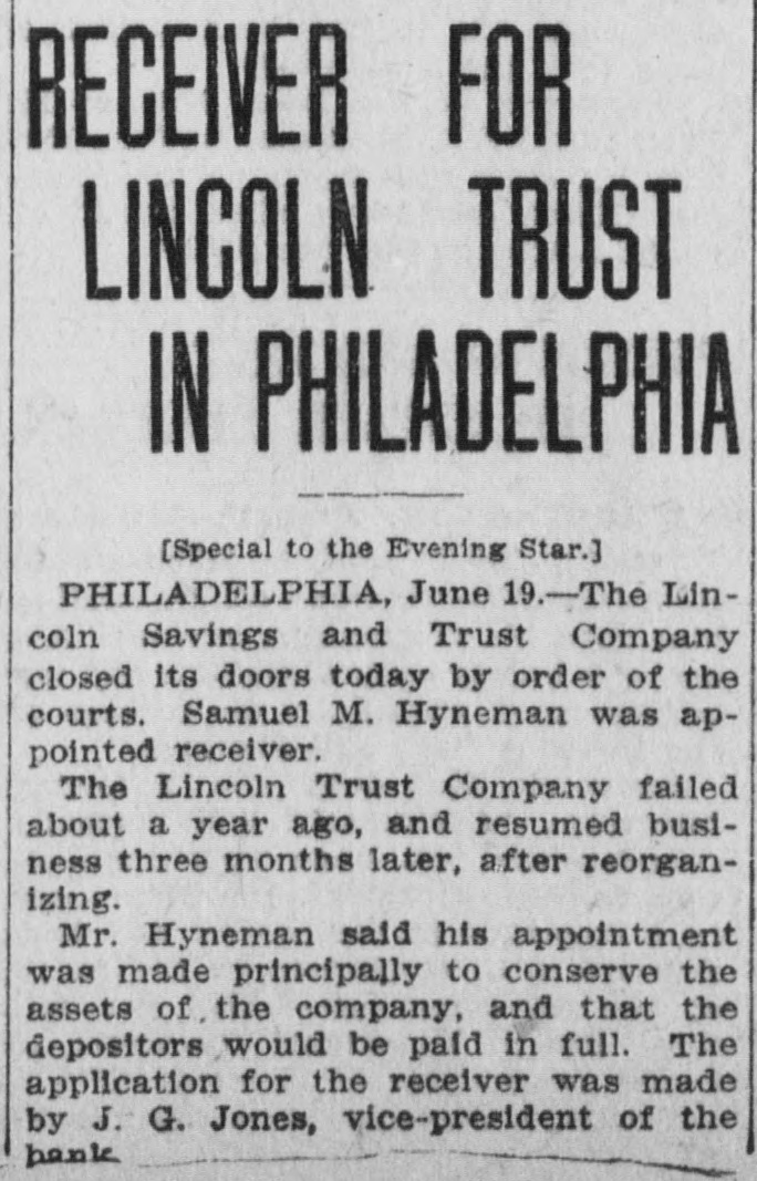 RECEIVER FOR LINCOLN TRUST IN PHILADELPHIA [Special to the Evening Star.] PHILADELPHIA, June 19.-The Lincoin Savings and Trust Company closed its doors today by order of the courts. Samuel M. Hyneman was appointed receiver. The Lincoln Trust Company failed about a year ago, and resumed business three months later, after reorganizing. Mr. Hyneman said his appointment was made principally to conserve the assets of the company, and that the depositors would be paid in full. The application for the receiver was made by J. G. Jones, vice-president of the bank