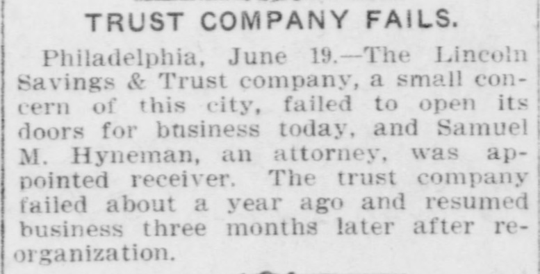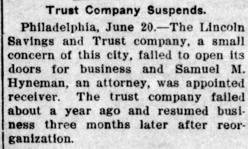 Trust Company Suspends. Philadelphia, June 20.-The Lincoln Savings and Trust company, a small concern of this city, failed to open its doors for business and Samuel M. Hyneman, an attorney, was appointed receiver. The trust company failed about a year ago and resumed business three months later after reorganization.