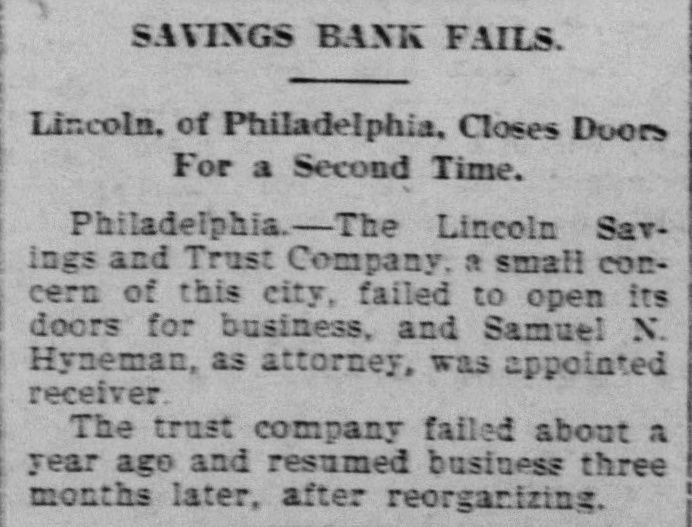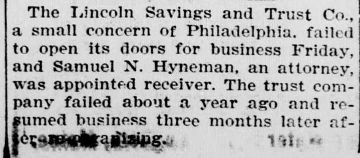 The Lincoln Savings and Trust Co., a small concern of Philadelphia. failed to open its doors for business Friday, and Samuel N. Hyneman, an attorney, was appointed receiver. The trust company failed about a year ago and resumed business three months later afteremp rapising 191.**