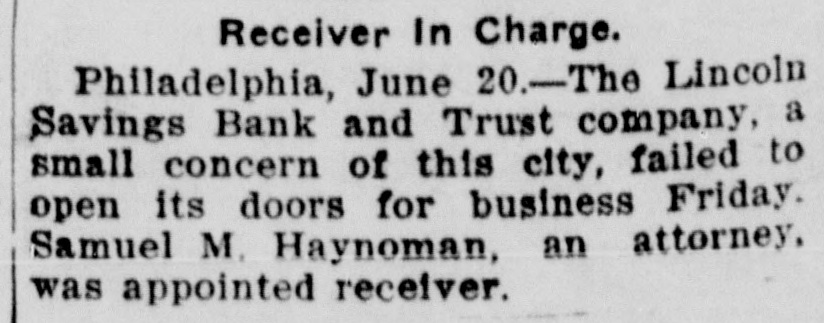 Receiver In Charge. Philadelphia, June 20.-The Lincoln Savings Bank and Trust company, a small concern of this city, failed to open its doors for business Friday. Samuel M. Haynoman, an attorney. was appointed receiver.