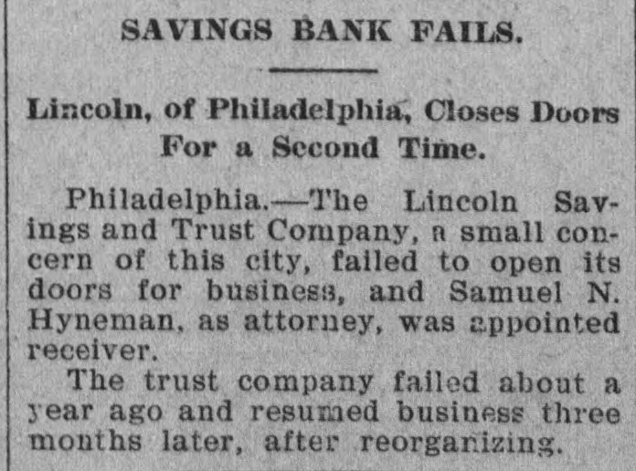 SAVINGS BANK FAILS. Lincoln. of Philadelphia, Closes Doors For a Second Time. Philadeiphia.-The Lincoln Savings and Trust Company, a small concern of this city, failed to open its doors for business, and Samuel N. Hyneman, as attorney, was appointed receiver. The trust company failed about a year ago and resumed business three months later, after reorganizing.